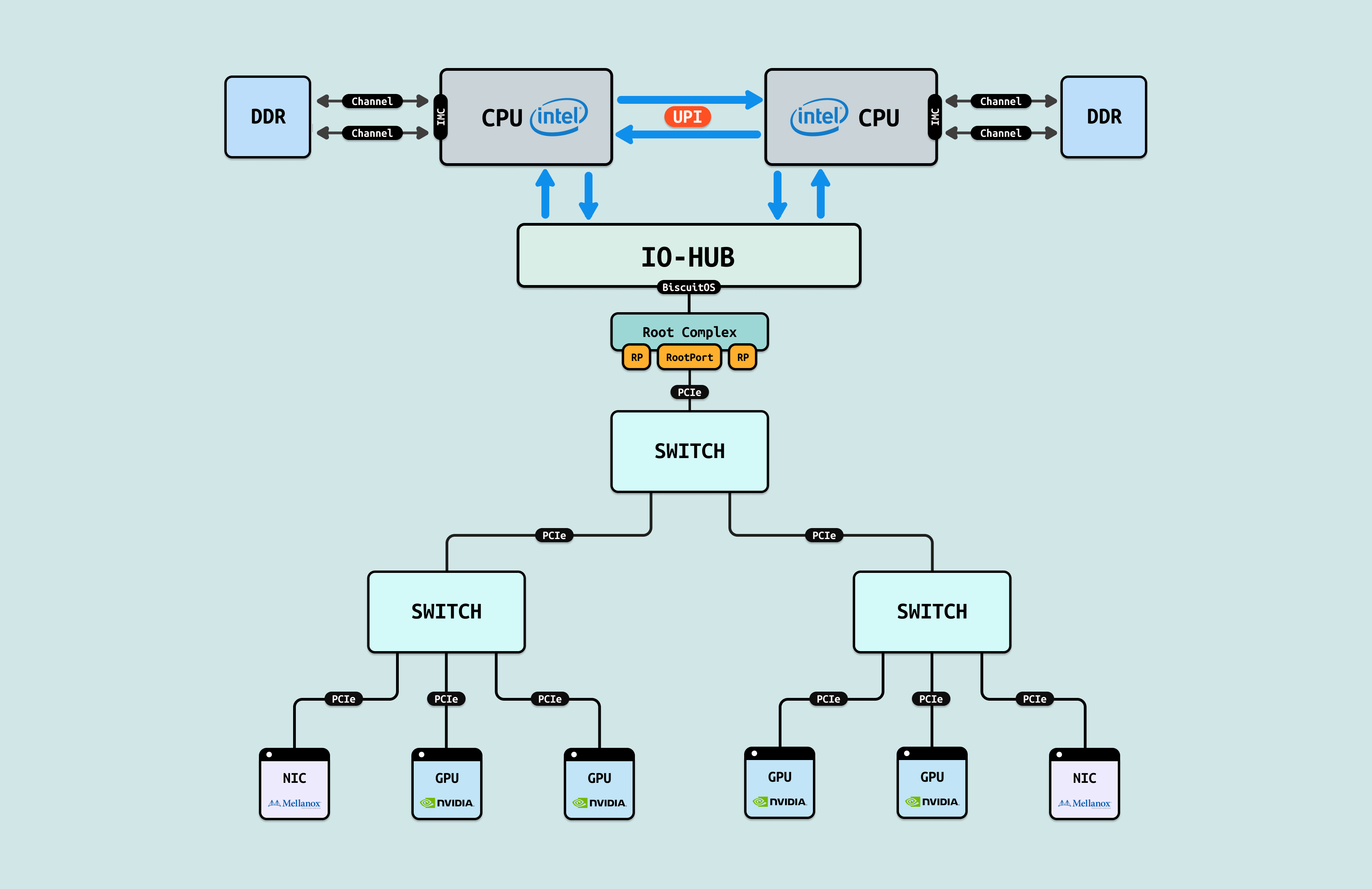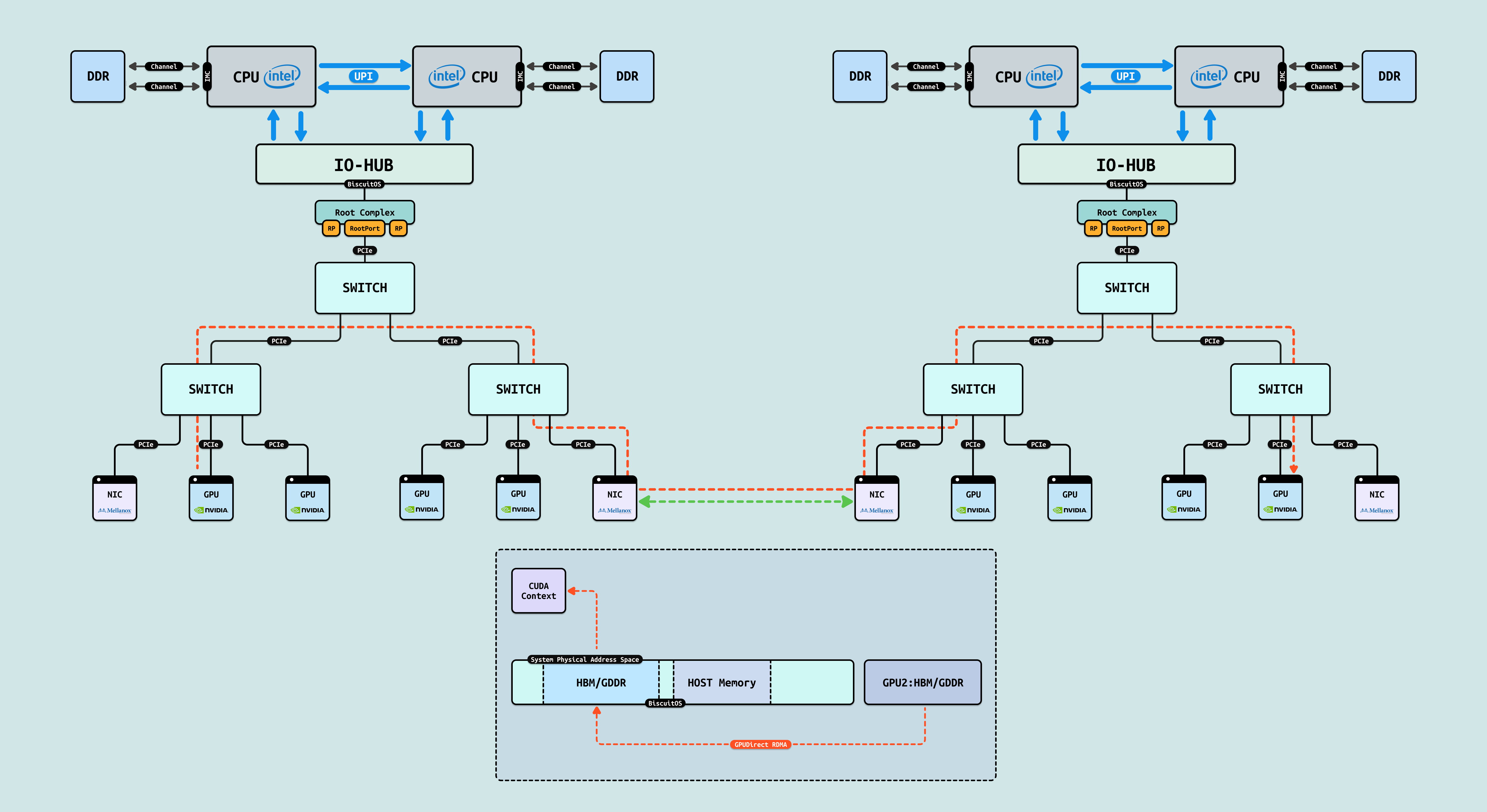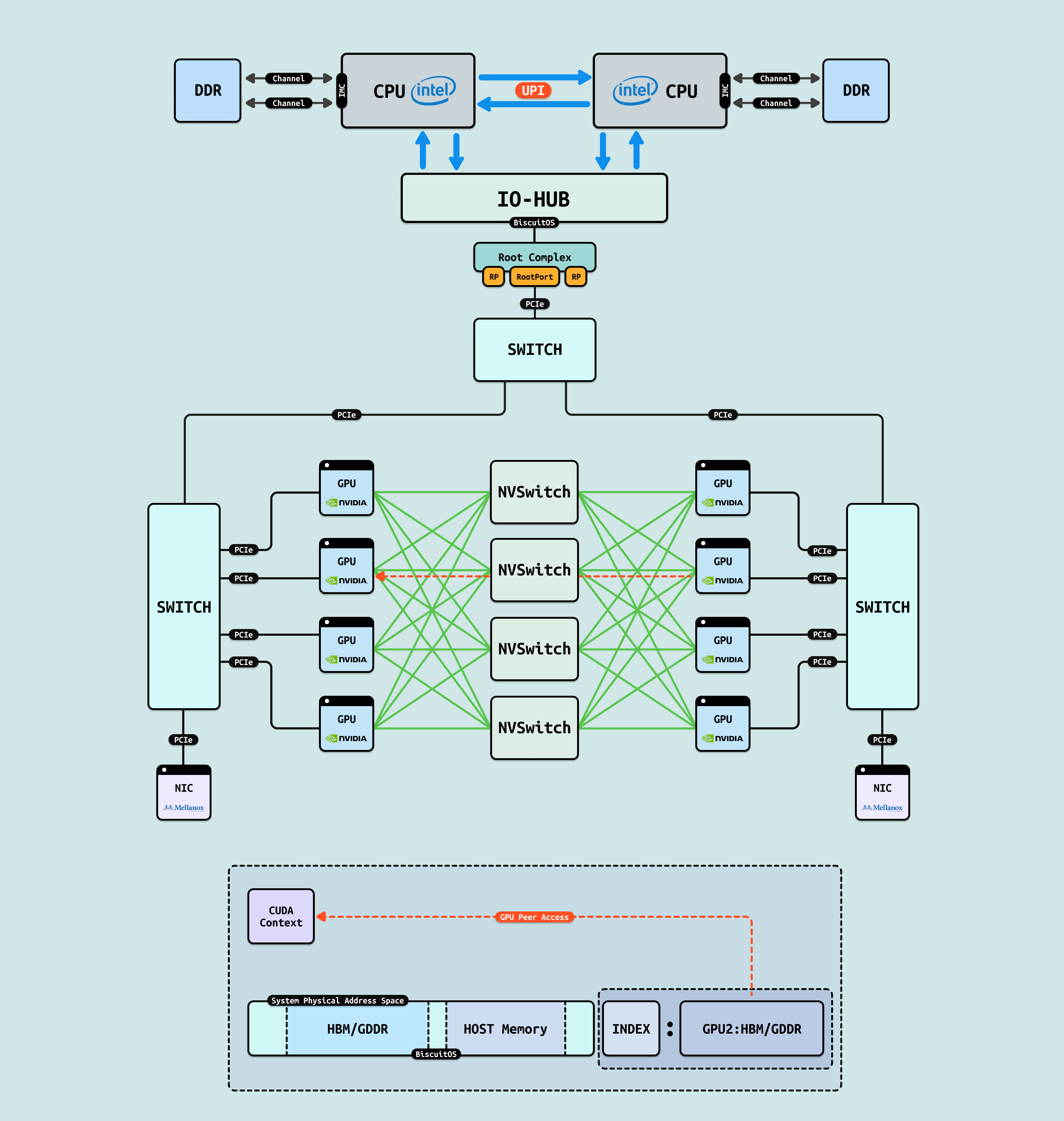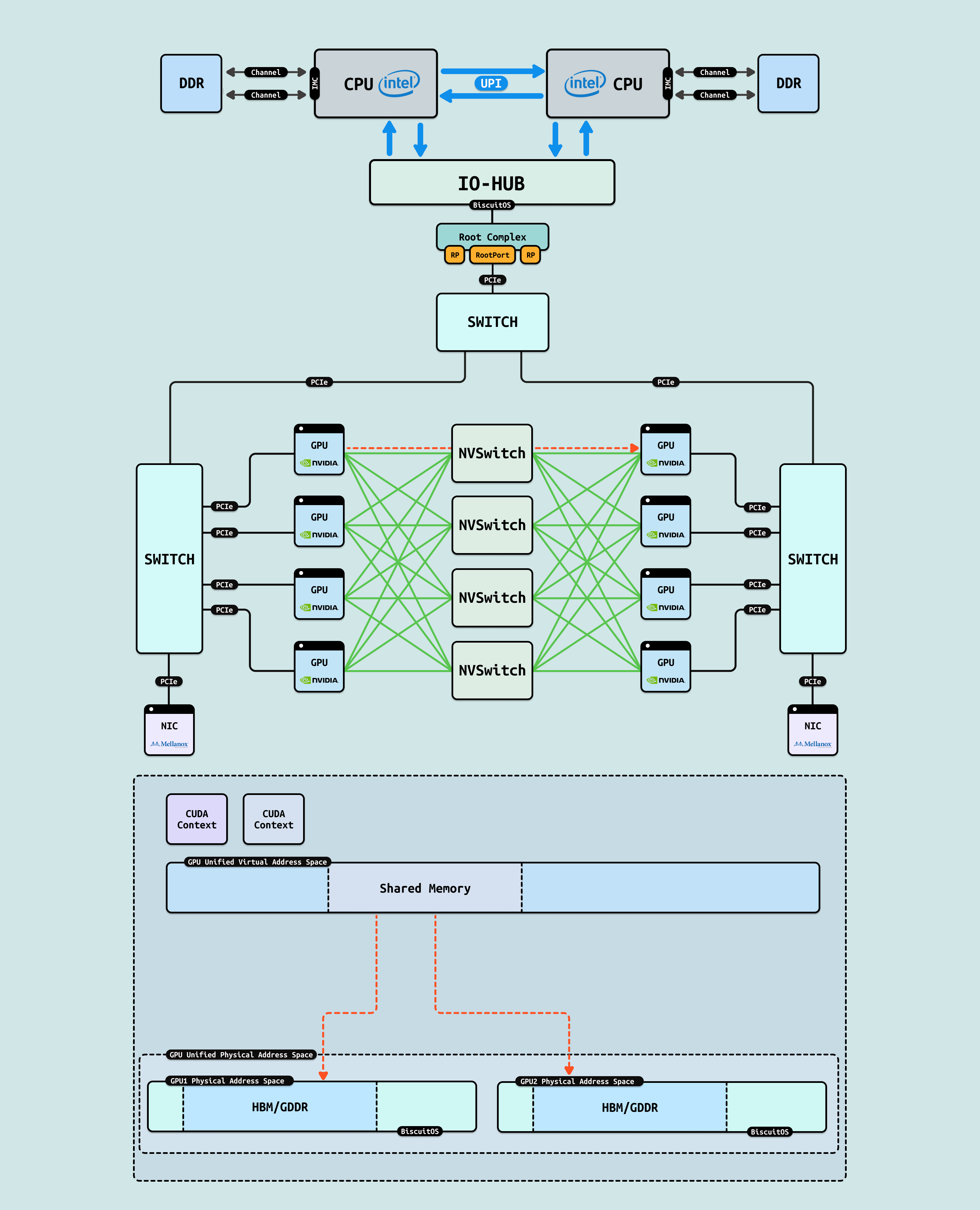 在介绍完 GPU 内部结构之后,接下来探讨 CPU 如何与 GPU 互联, 传统方式下,CPU 通过 PCIe 连接到 GPU. 在现代 Intel Xeon 处理器(如 Granite Rapids)上,北桥已集成到 CPU 内部,CPU 直接向外提供 Root Port 接口. 我们将 CPU 内部处理 PCIe 的部件统一抽象为 Root Complex. CPU 的 IO-HUB 上集成了 Root Complex,Root Complex 作为 PCIe 树的根节点,向下扩展出多个 Root Port,Root Port 上可以直接接入 PCIe EP,也可以连接 PCIe Switch 的上游端口,支持树状扩展. 如图所示,双 Granite Rapids CPU 通过 UPI 实现 NUMA 一致性,并连接 DDR 通道. IO-HUB 集成 Root Complex,作为 PCIe 树的根节点,从 Root Port 向下扩展至 PCIe Switch 的上游端口. Switch 分支出下游链路, 一个主 Switch 连接两个子 Switch,每个子 Switch 有三个下游端口,分别接入 NIC 和 2 个 H100 GPU. 这种星状拓扑最小化路径直径,支持多 GPU 扩展,确保 AI 数据从 CPU NUMA 域高效流向 GPU SM 集群,而无需 CPU 干预中转.
