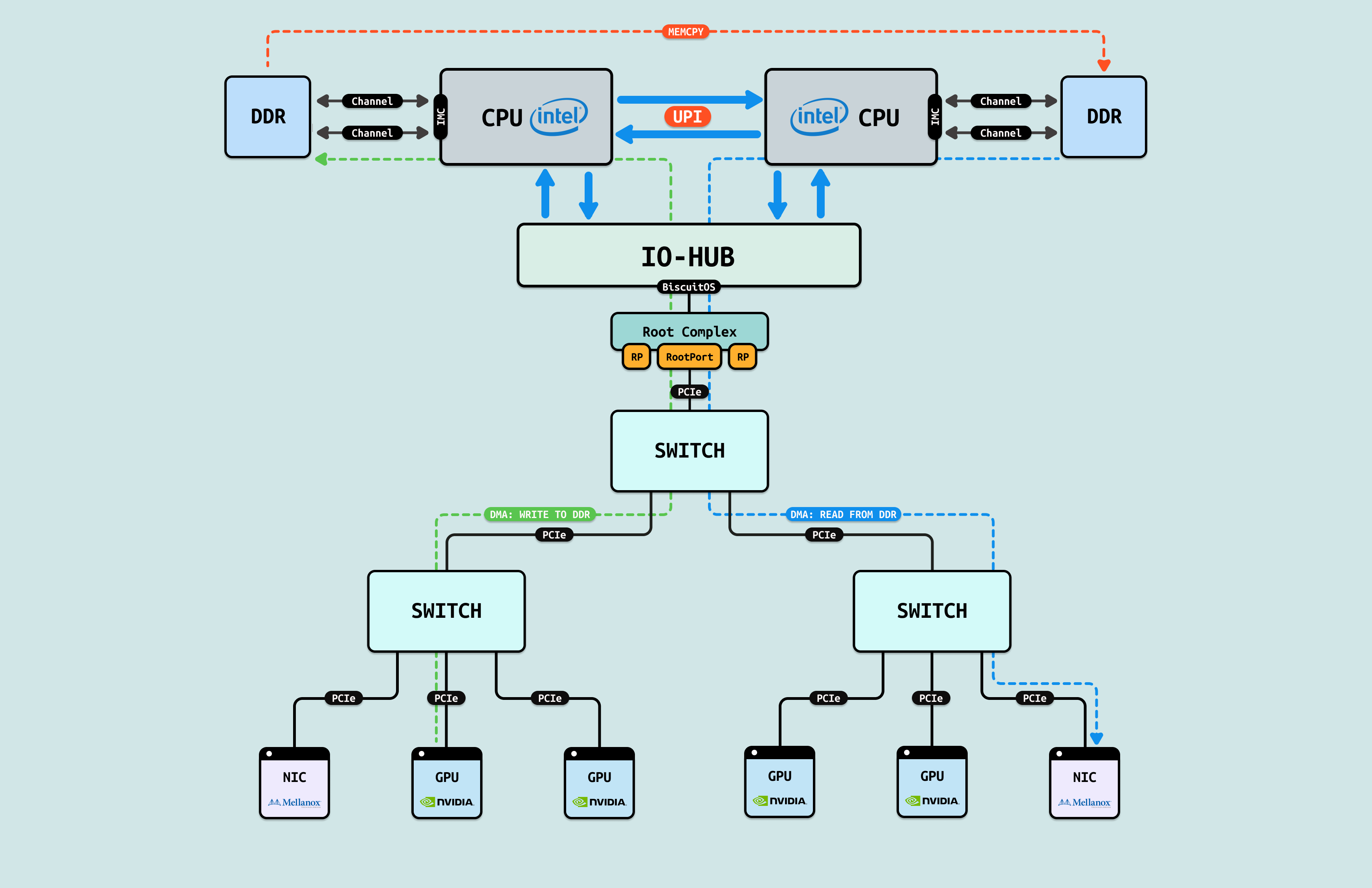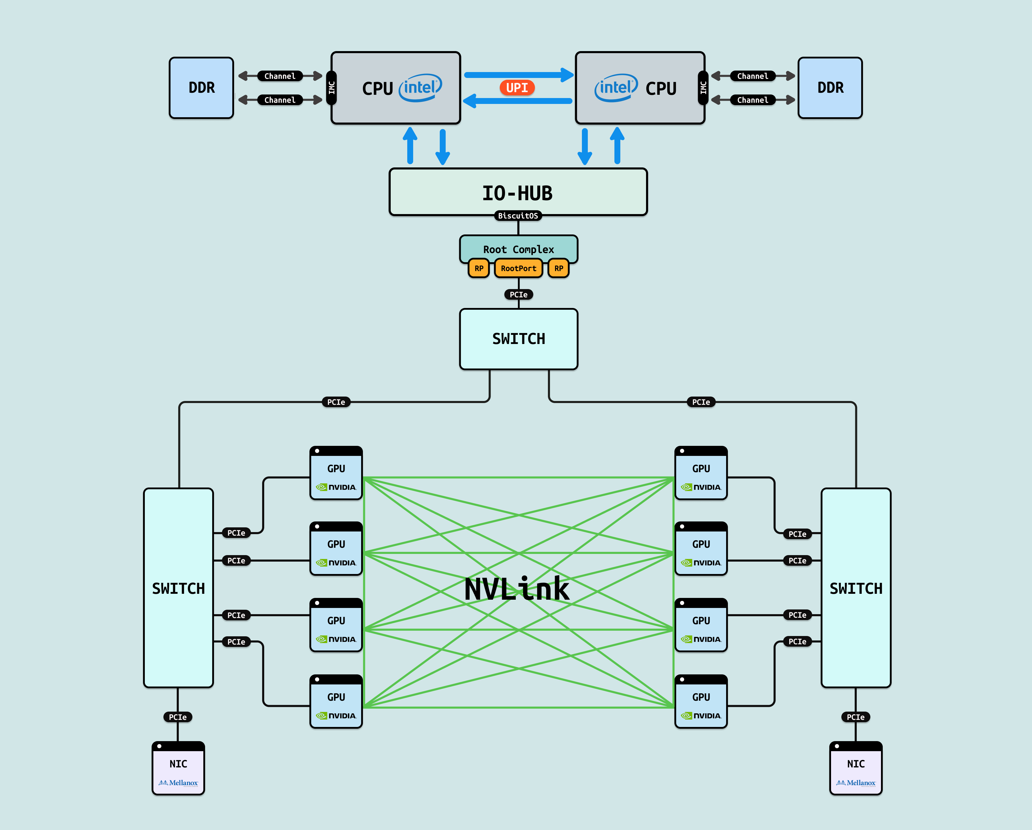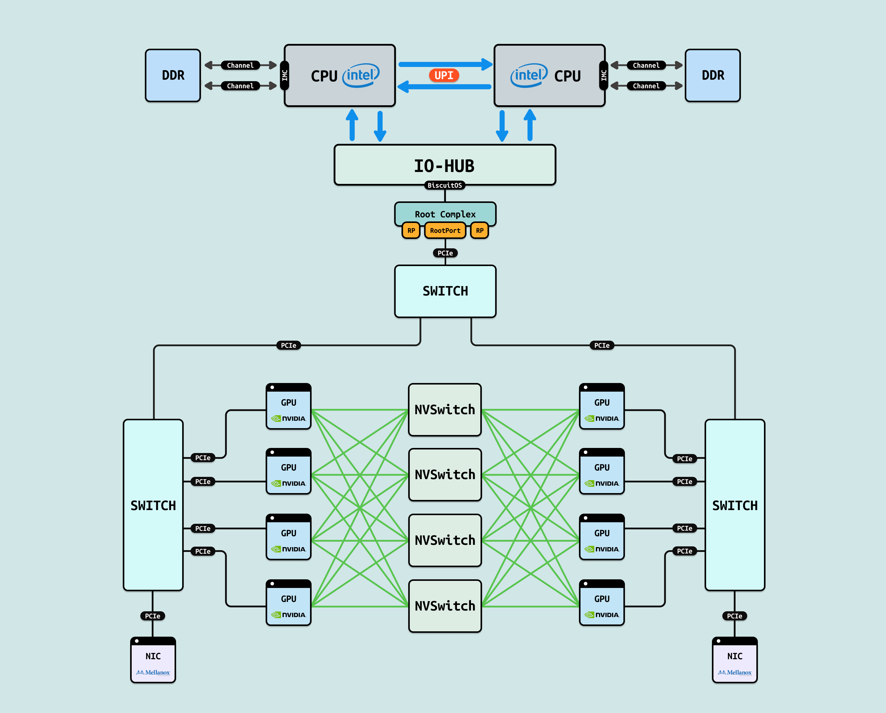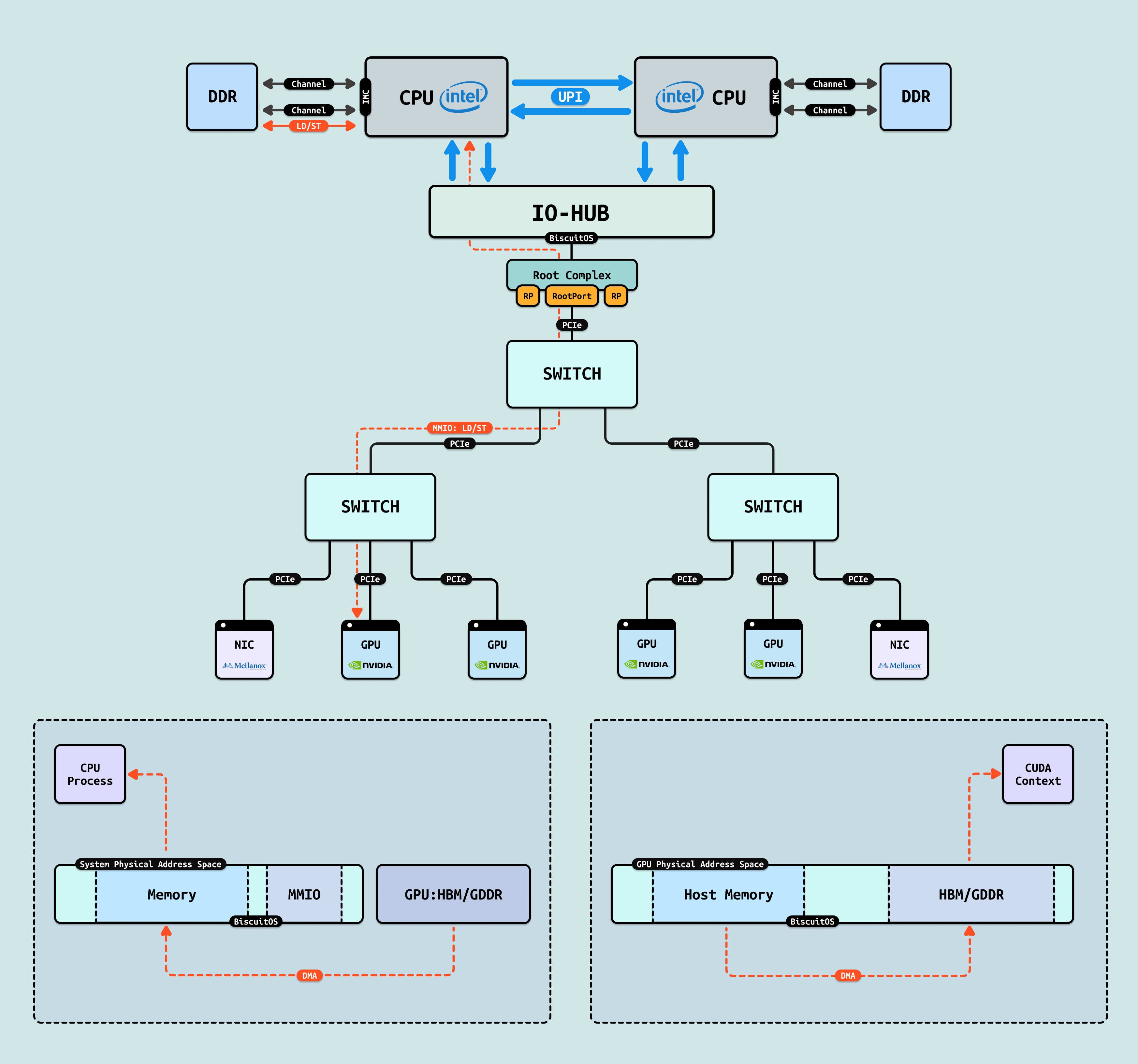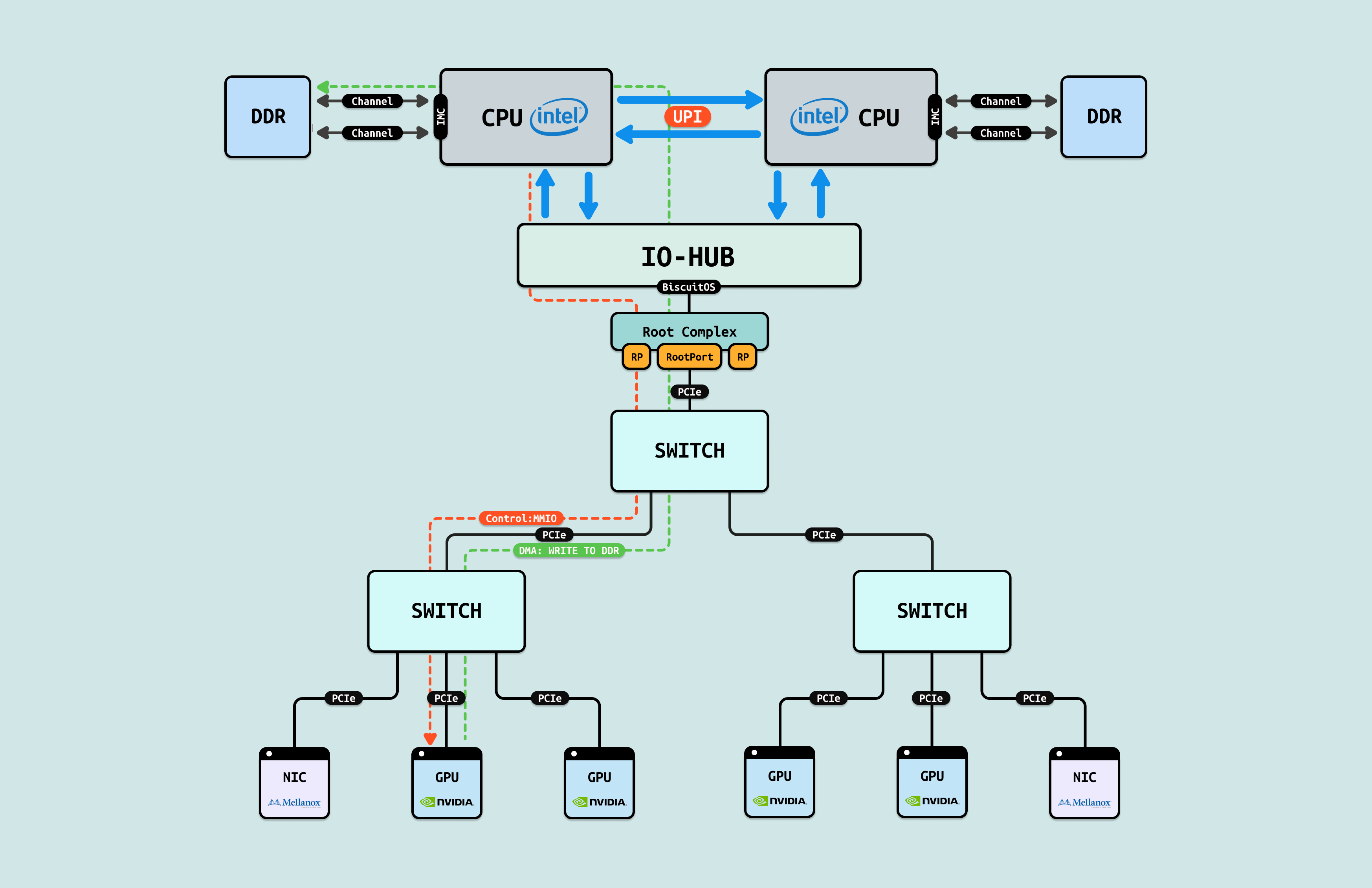 在介绍完 GPU 内部结构之后,接下来探讨 CPU 如何与 GPU 互联, 传统方式下,CPU 通过 PCIe 连接到 GPU. 在现代 Intel Xeon 处理器(如 Granite Rapids)上,北桥已集成到 CPU 内部,CPU 直接向外提供 Root Port 接口. 我们将 CPU 内部处理 PCIe 的部件统一抽象为 Root Complex. CPU 的 IO-HUB 上集成了 Root Complex,Root Complex 作为 PCIe 树的根节点,向下扩展出多个 Root Port,Root Port 上可以直接接入 PCIe EP,也可以连接 PCIe Switch 的上游端口,支持树状扩展. 如图所示,双 Granite Rapids CPU 通过 UPI 实现 NUMA 一致性,并连接 DDR 通道. IO-HUB 集成 Root Complex,作为 PCIe 树的根节点,从 Root Port 向下扩展至 PCIe Switch 的上游端口. Switch 分支出下游链路, 一个主 Switch 连接两个子 Switch,每个子 Switch 有三个下游端口,分别接入 NIC 和 2 个 H100 GPU. 这种星状拓扑最小化路径直径,支持多 GPU 扩展,确保 AI 数据从 CPU NUMA 域高效流向 GPU SM 集群,而无需 CPU 干预中转.