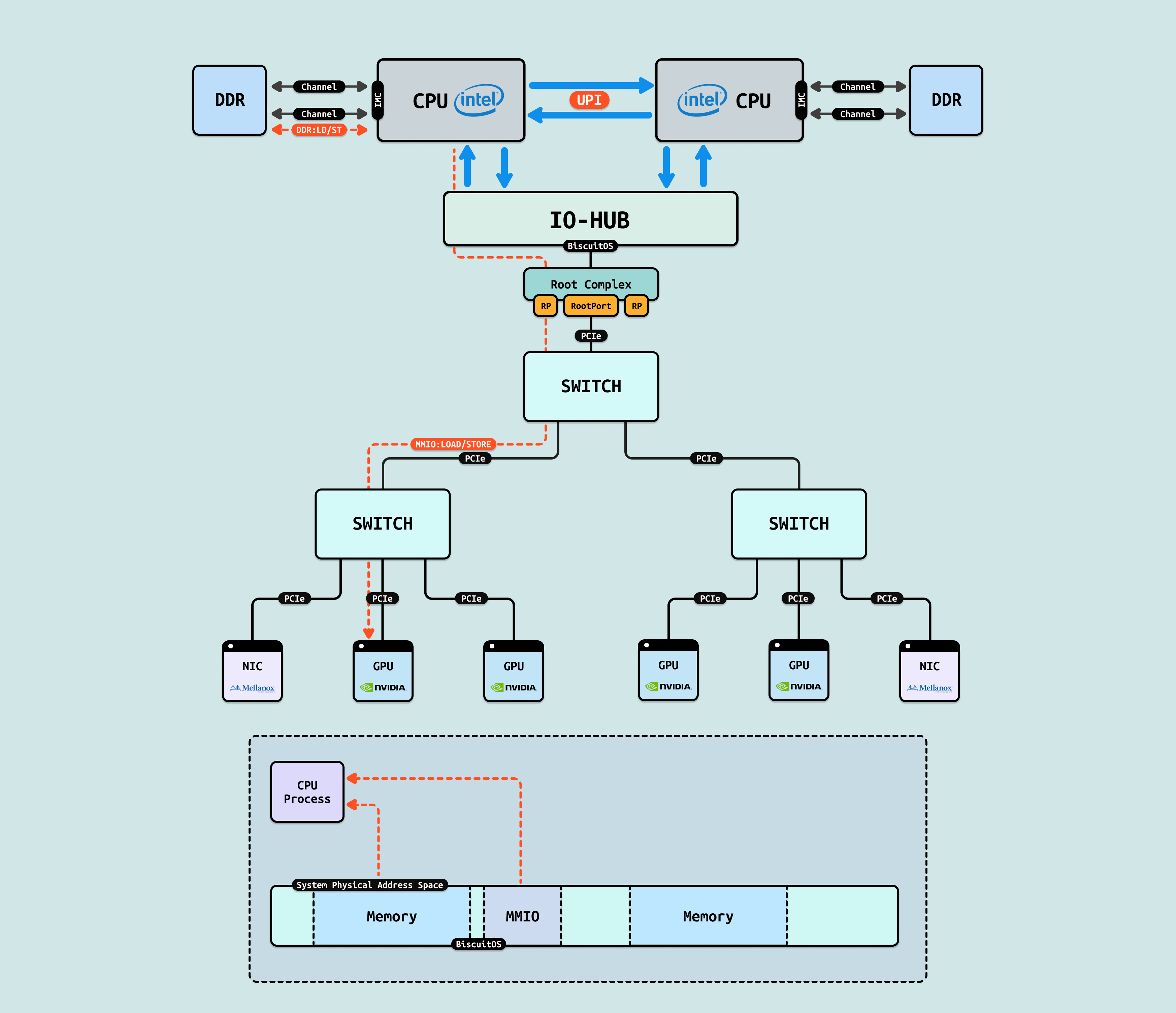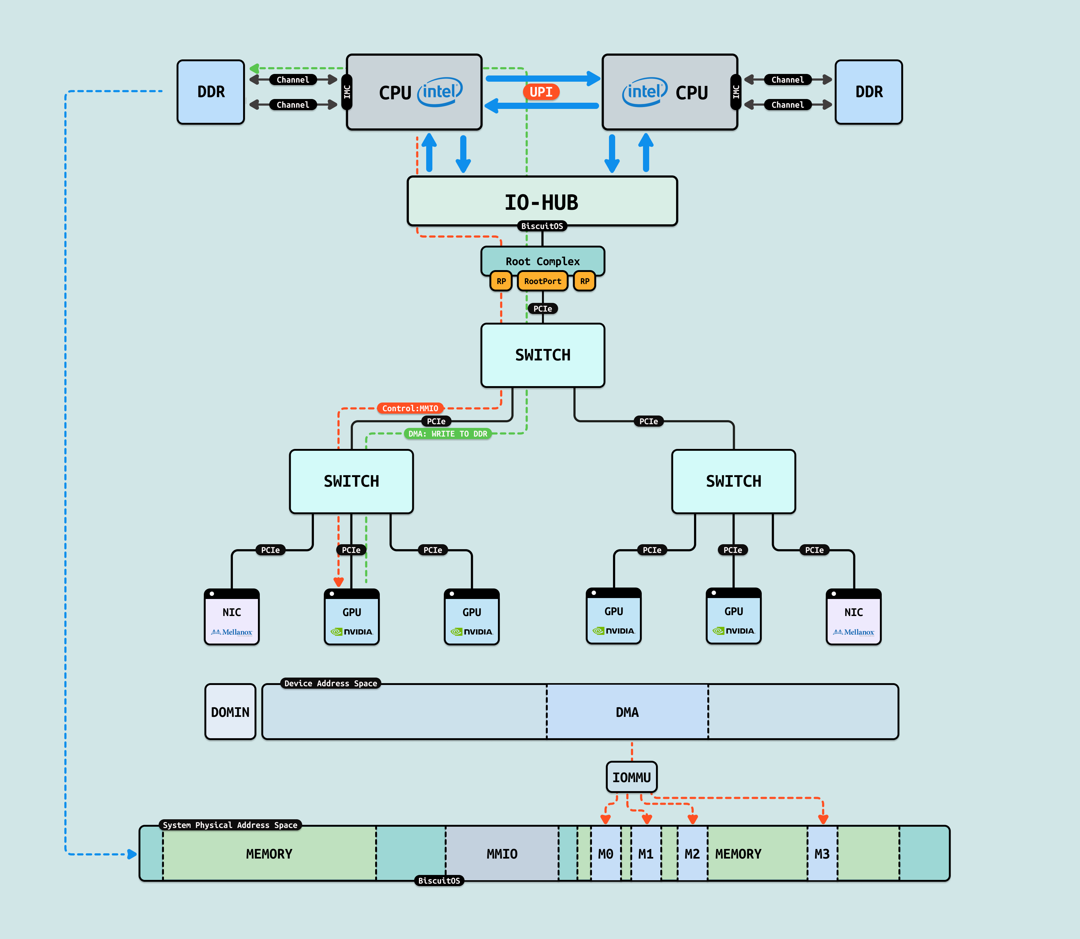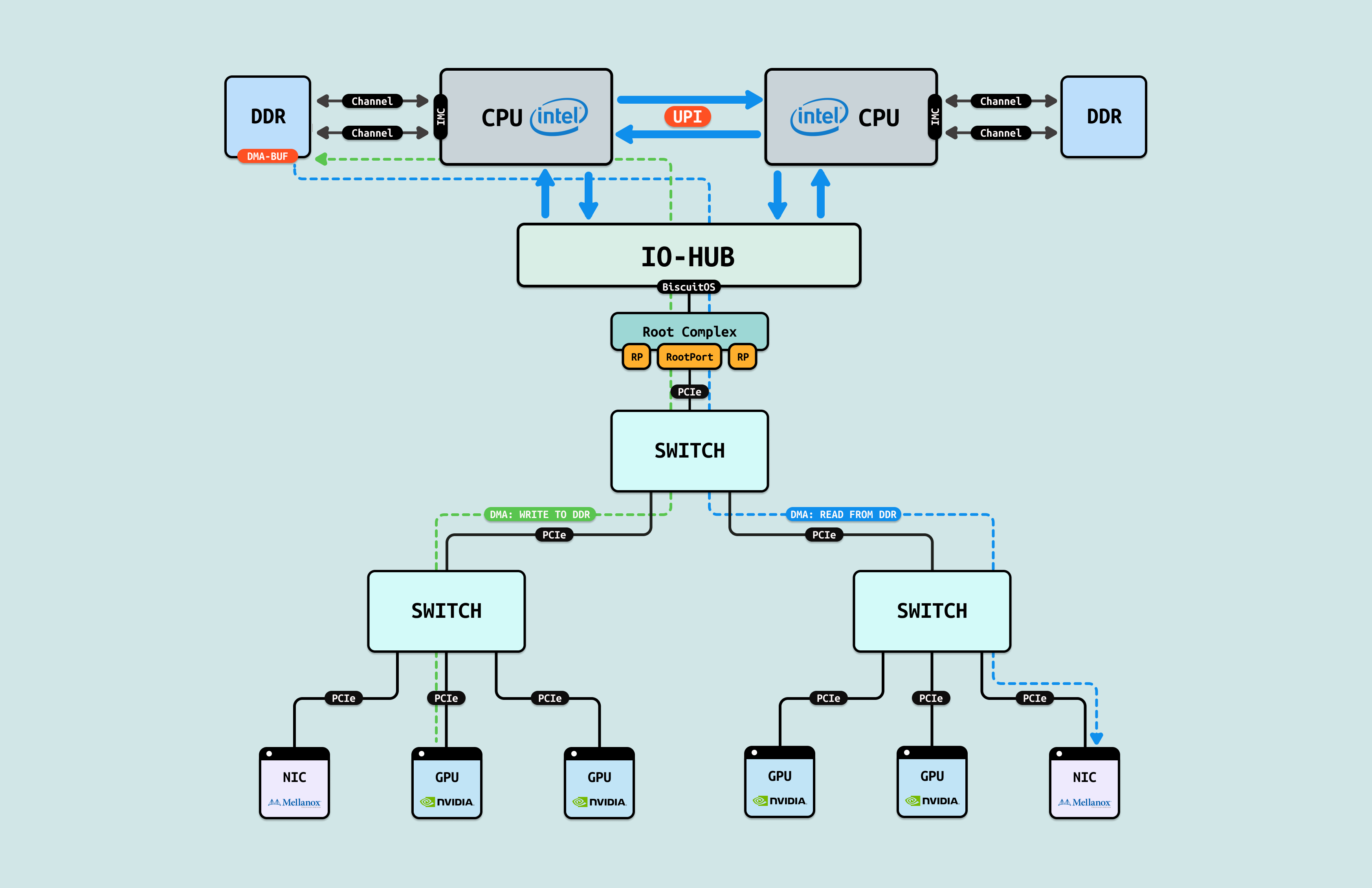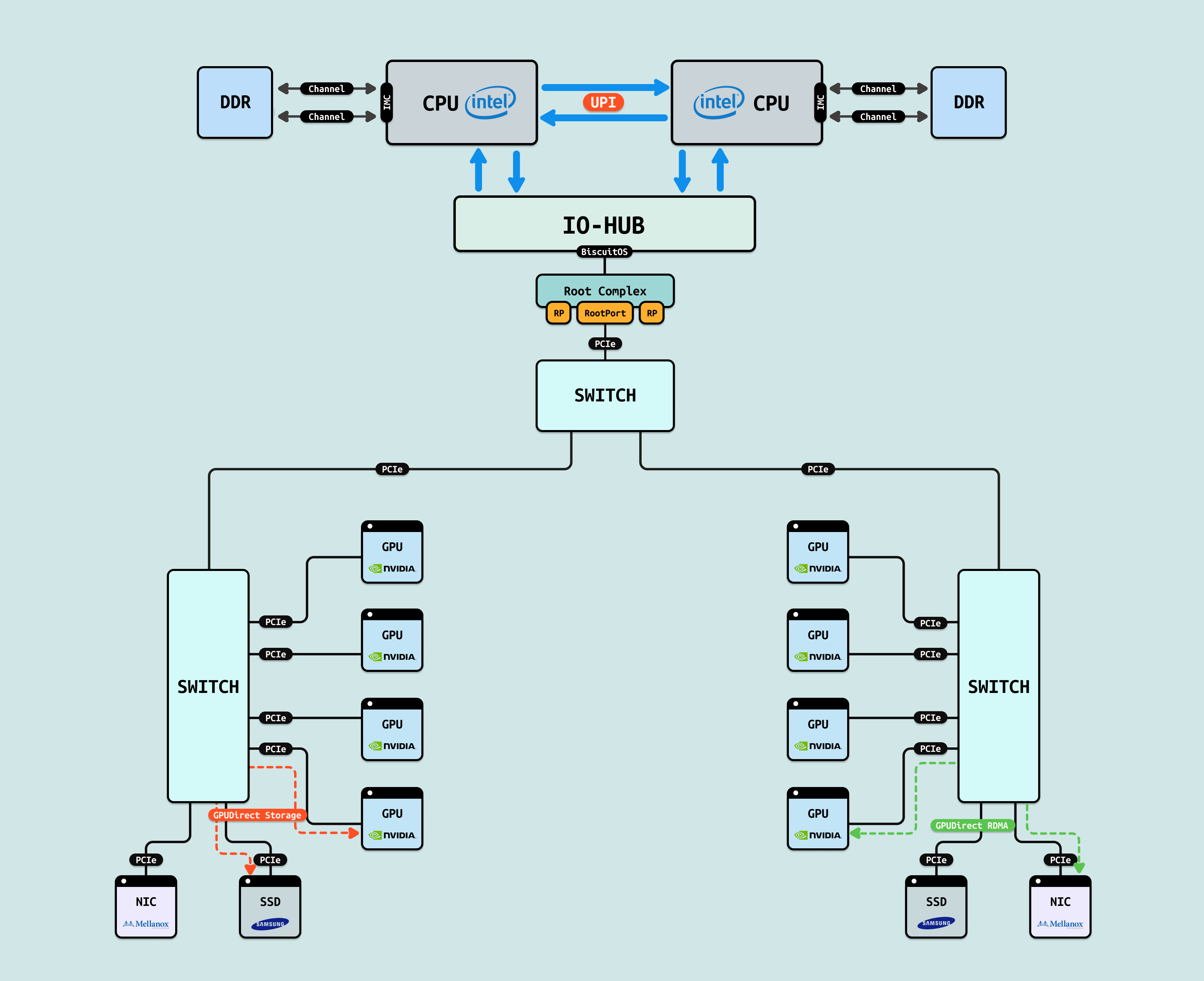 在介绍完 GPU 内部结构之后,接下来探讨 CPU 如何与 GPU 互联, 传统方式下,CPU 通过 PCIe 连接到 GPU. 在现代 Intel Xeon 处理器(如 Granite Rapids)上,北桥已集成到 CPU 内部,CPU 直接向外提供 Root Port 接口. 我们将 CPU 内部处理 PCIe 的部件统一抽象为 Root Complex. CPU 的 IO-HUB 上集成了 Root Complex,Root Complex 作为 PCIe 树的根节点,向下扩展出多个 Root Port,Root Port 上可以直接接入 PCIe EP,也可以连接 PCIe Switch 的上游端口,支持树状扩展. 如图所示,双 Granite Rapids CPU 通过 UPI 实现 NUMA 一致性,并连接 DDR 通道. IO-HUB 集成 Root Complex,作为 PCIe 树的根节点,从 Root Port 向下扩展至 PCIe Switch 的上游端口. Switch 分支出下游链路, 一个主 Switch 连接两个子 Switch,每个子 Switch 有三个下游端口,分别接入 NIC 和 2 个 H100 GPU. 这种星状拓扑最小化路径直径,支持多 GPU 扩展,确保 AI 数据从 CPU NUMA 域高效流向 GPU SM 集群,而无需 CPU 干预中转.