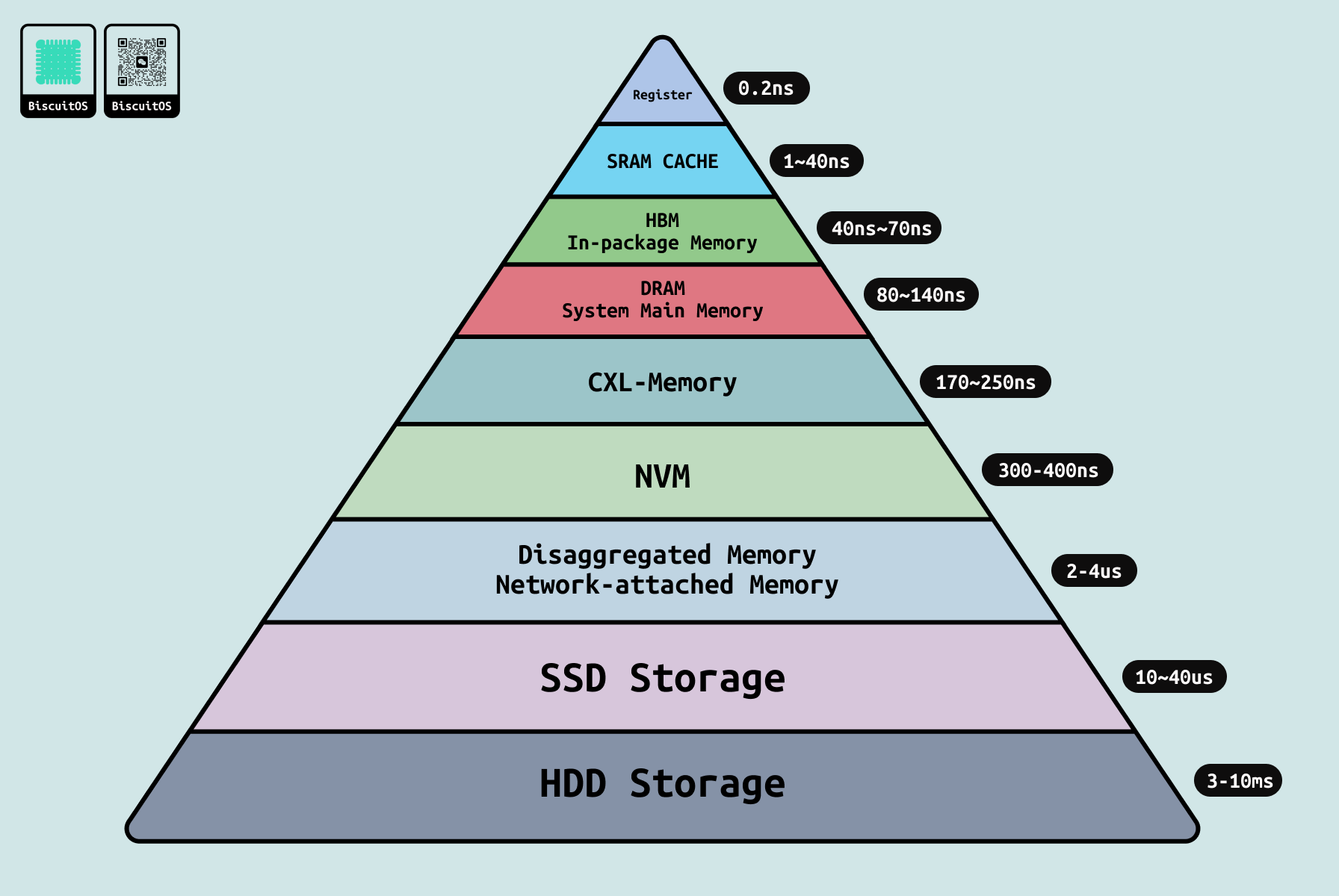 - 磁盘存储: 经 PCH 连接 NVMe SSD 或 SATA HDD,~10 μs-ms 延迟,用于持久化数据