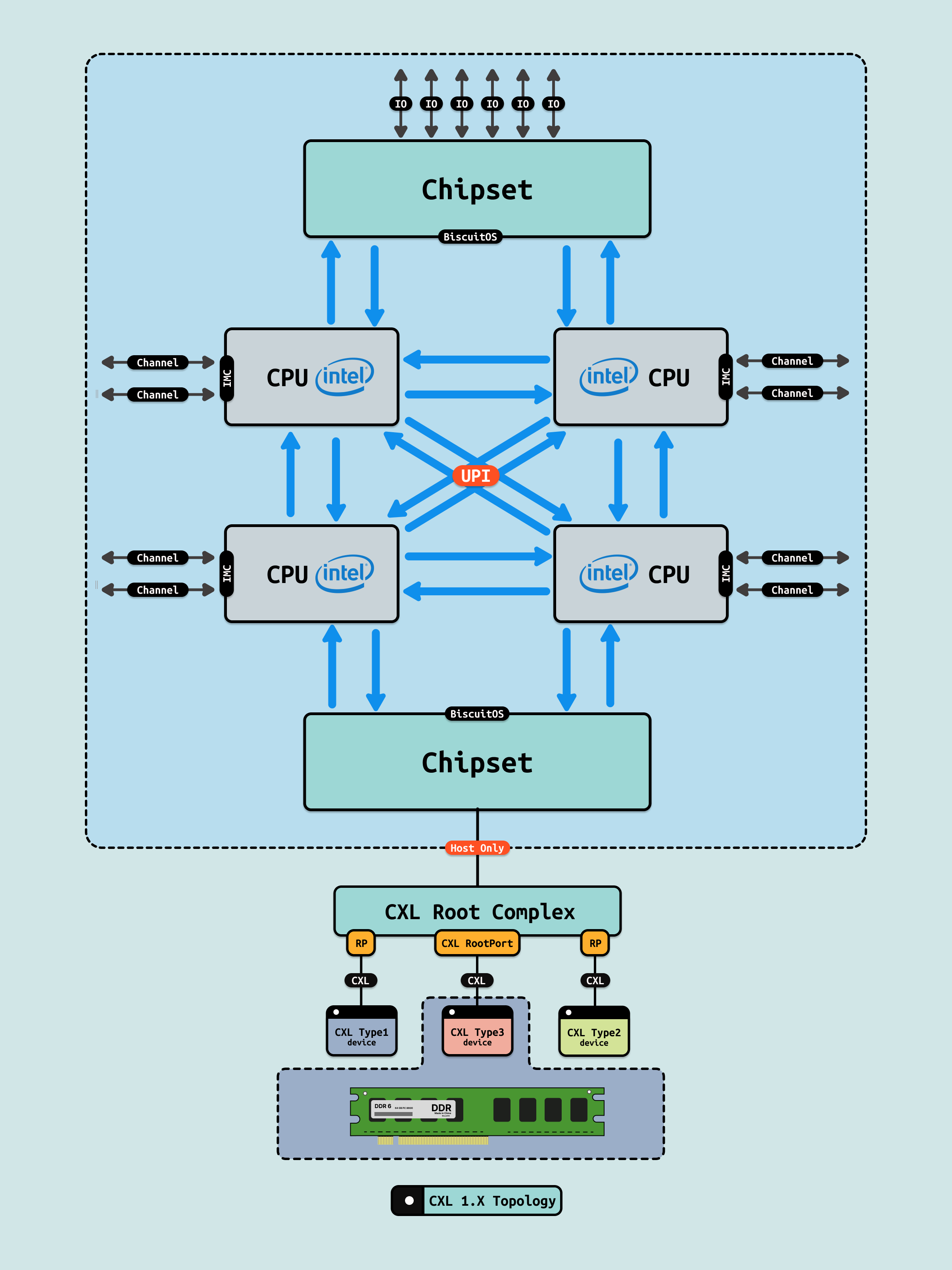 - DDR: DRAM 内存控制器集成,支持 DDR5-6400,~100 ns 访问,Granite Rapids 支持 12 通道,总带宽 ~900 GB/s