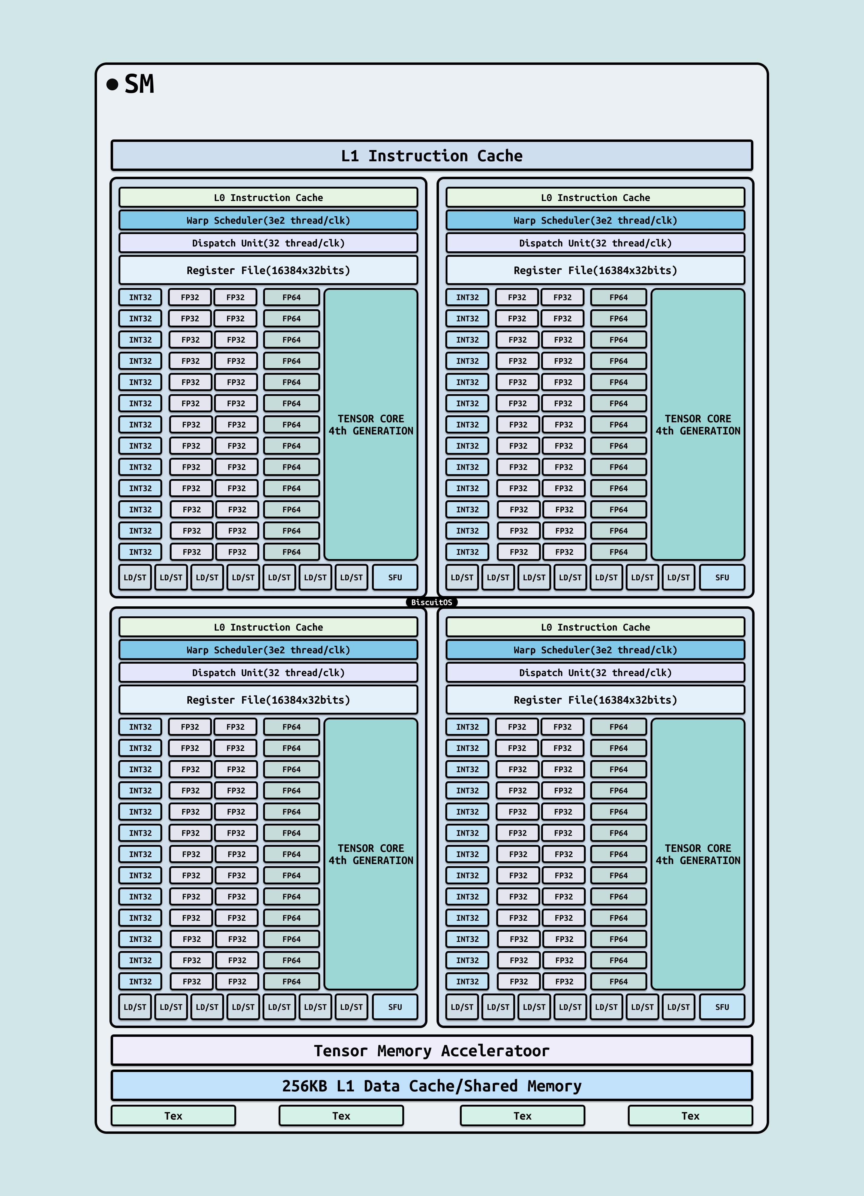 SM 作为 GPU 并行计算的核心”原子”,其内部执行管道高度模块化,分为四个象限布局(每个象限包含调度器、寄存器文件和专用运算单元),以平衡负载和最小化延迟. 这种设计确保 Warp 级指令高效分发,支持 AI 工作负载的混合精度运算. 以下基于 H100 SM 的硬件逻辑拓扑图(展示象限模块化结构、计算路径和内存交互),详述关键硬件单元的作用,这些单元协同优化从整数逻辑到浮点加速的多样化任务: !