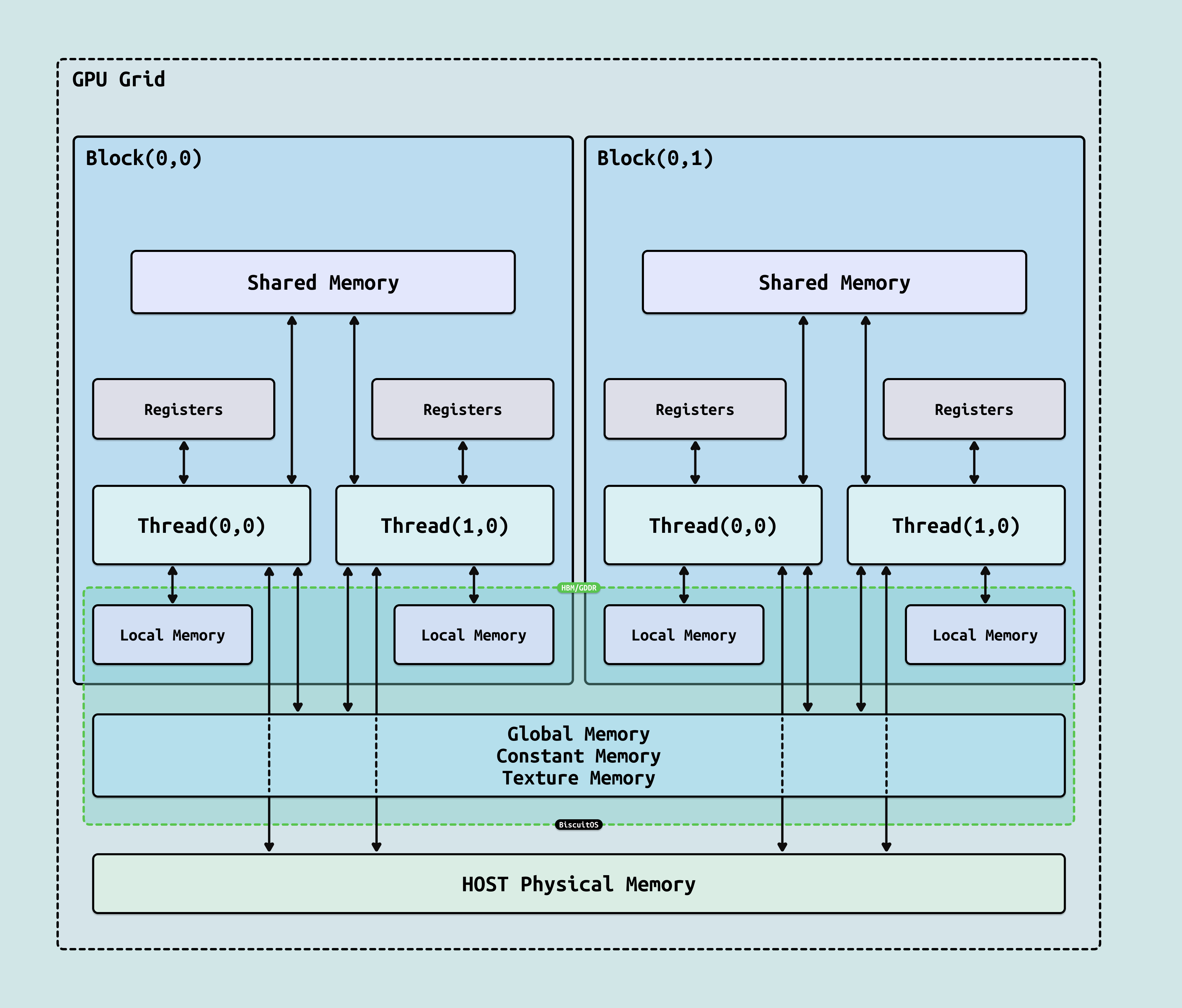 HBM/GDDR: 在 GPU 内部,其物理地址空间可以看到自己的 HBM/GDDR, 以及 Host 侧的物理内存,但只有 HBM/GDDR 可以映射为 WB,因此可以确保 CACHE 一致性. GPU 进程可以直接访问本地显存,这包括本地内存(Local Memory)、全局内存(Global Memory)、常量内存和纹理内存, 这些内存的数据可以直接送到 GPU 的 CACHE 和 Register 里. 然后 Host Memory 为 WB,GPU 无法保证其 CACHE 一致性,因此无法进行 LD/ST 访问.