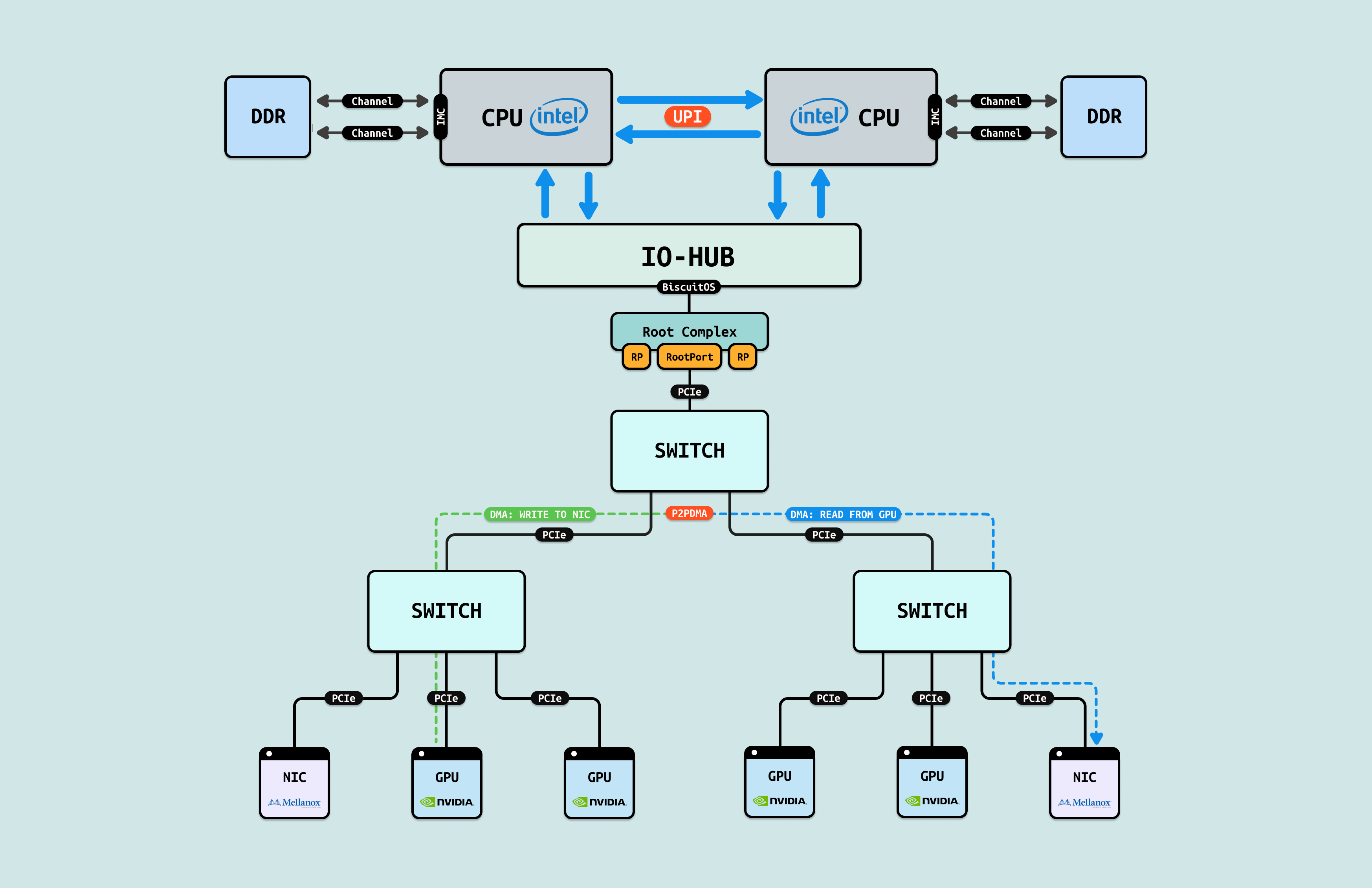 对于 GPU/GPU 和 GPU/NIC 之间存在的内存墙,第一种解决方案是 “P2PDMA”, 其先将各自的一部分内部存储空间映射到 PCIe 地址空间(系统物理地址空间),让对方都能看到. 其次是 CPU 从控制面配置好 P2PDMA 之后,GPU/GPU 或 GPU/NIC 之间直接进行 DMA 操作,数据流在临近的 PCIe Switch 直接流动,不会绕到 RC 去,这样即缩短了数据链路的距离,也缓解了其他 PCIe 链路的拥塞.