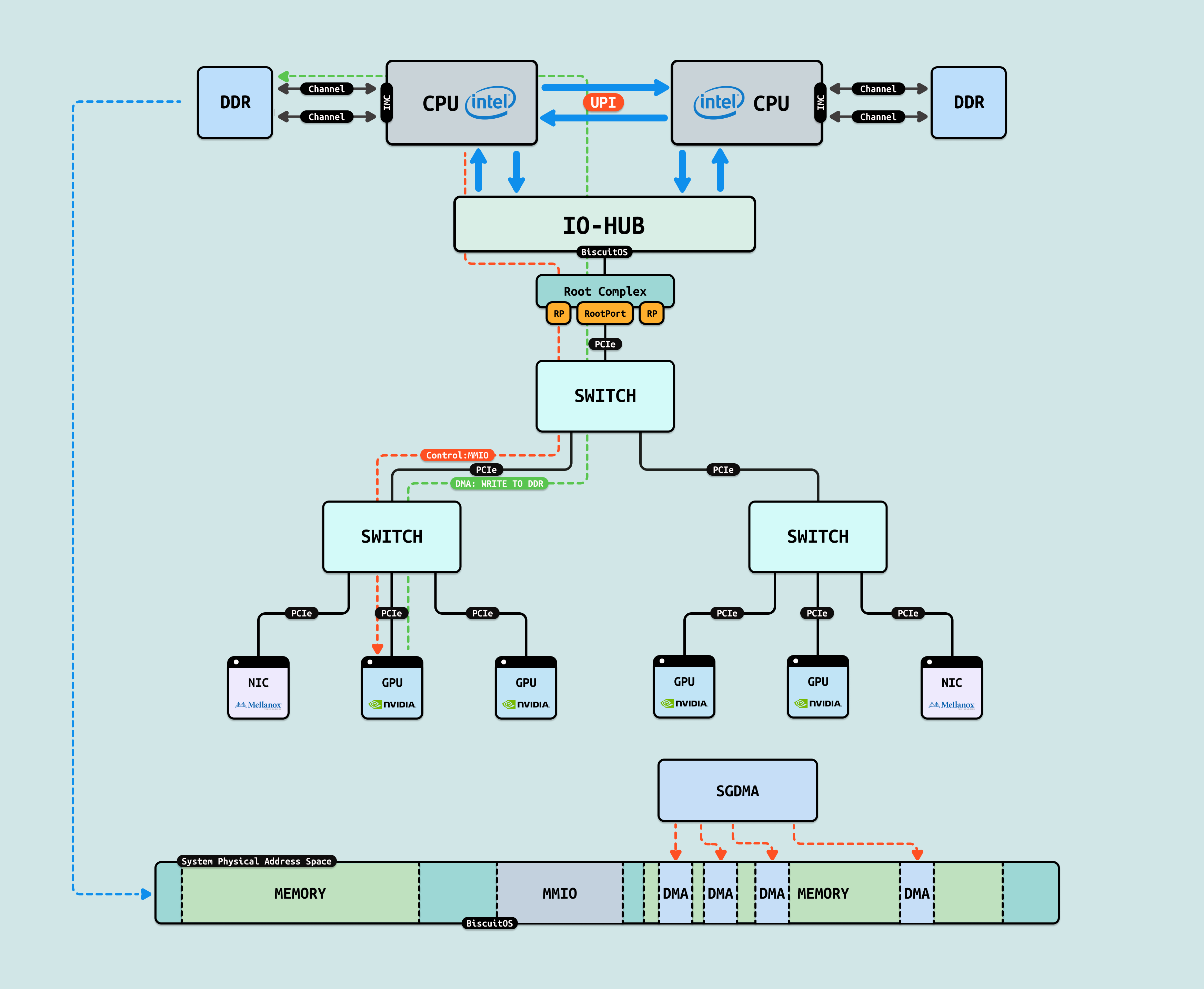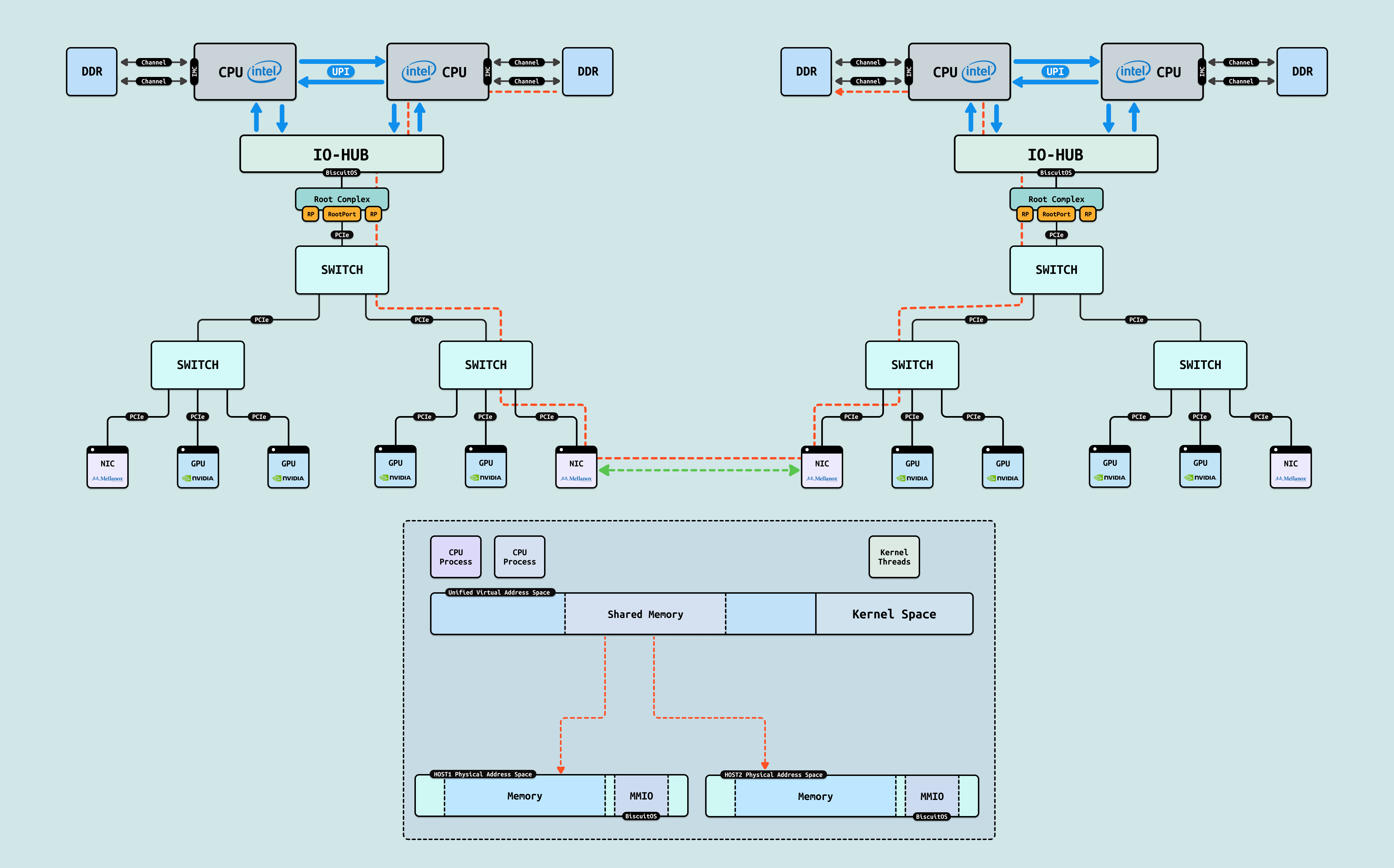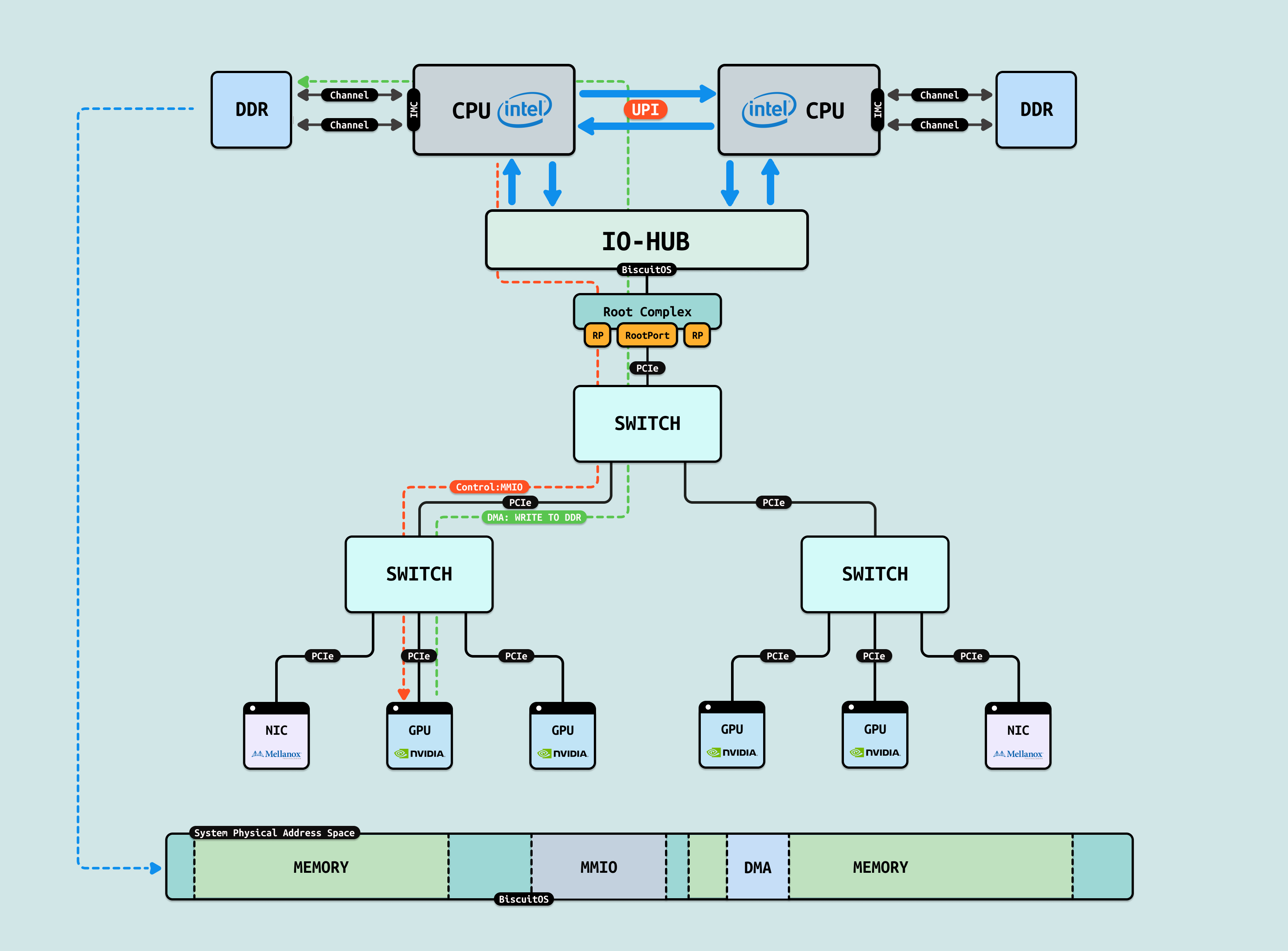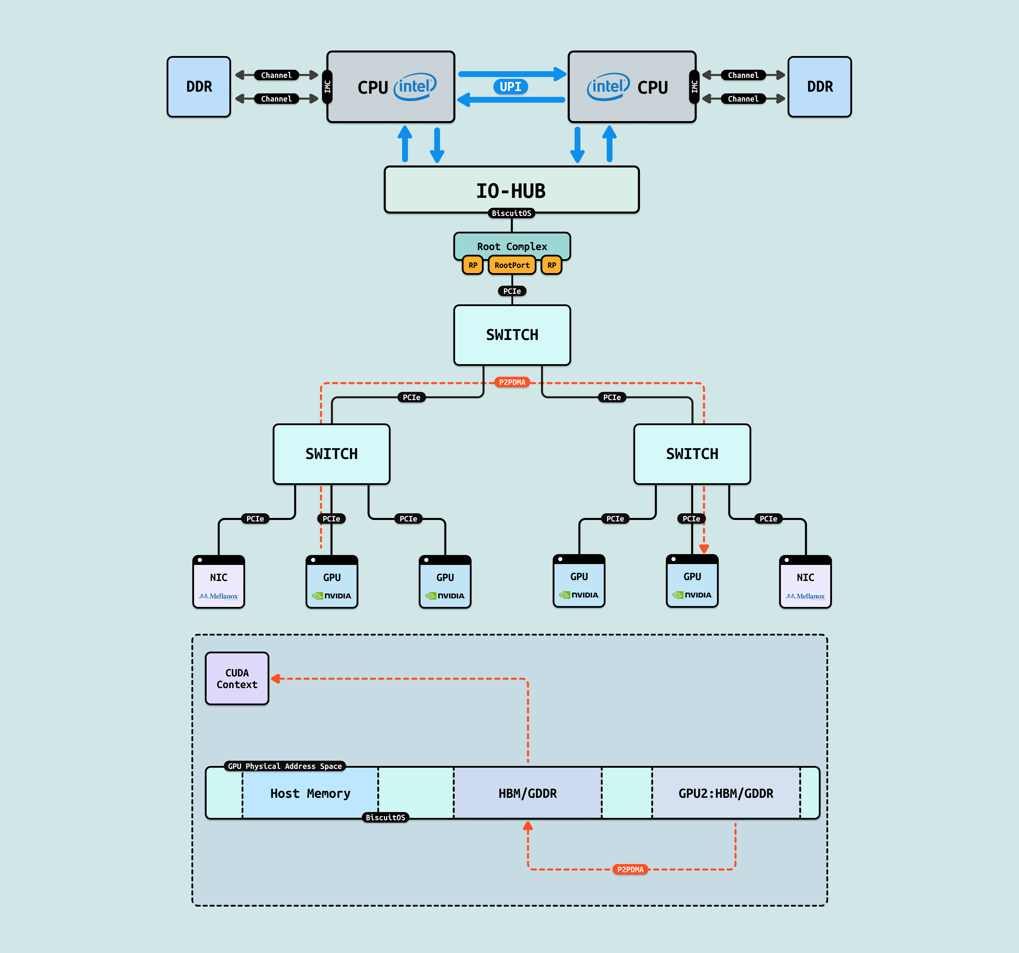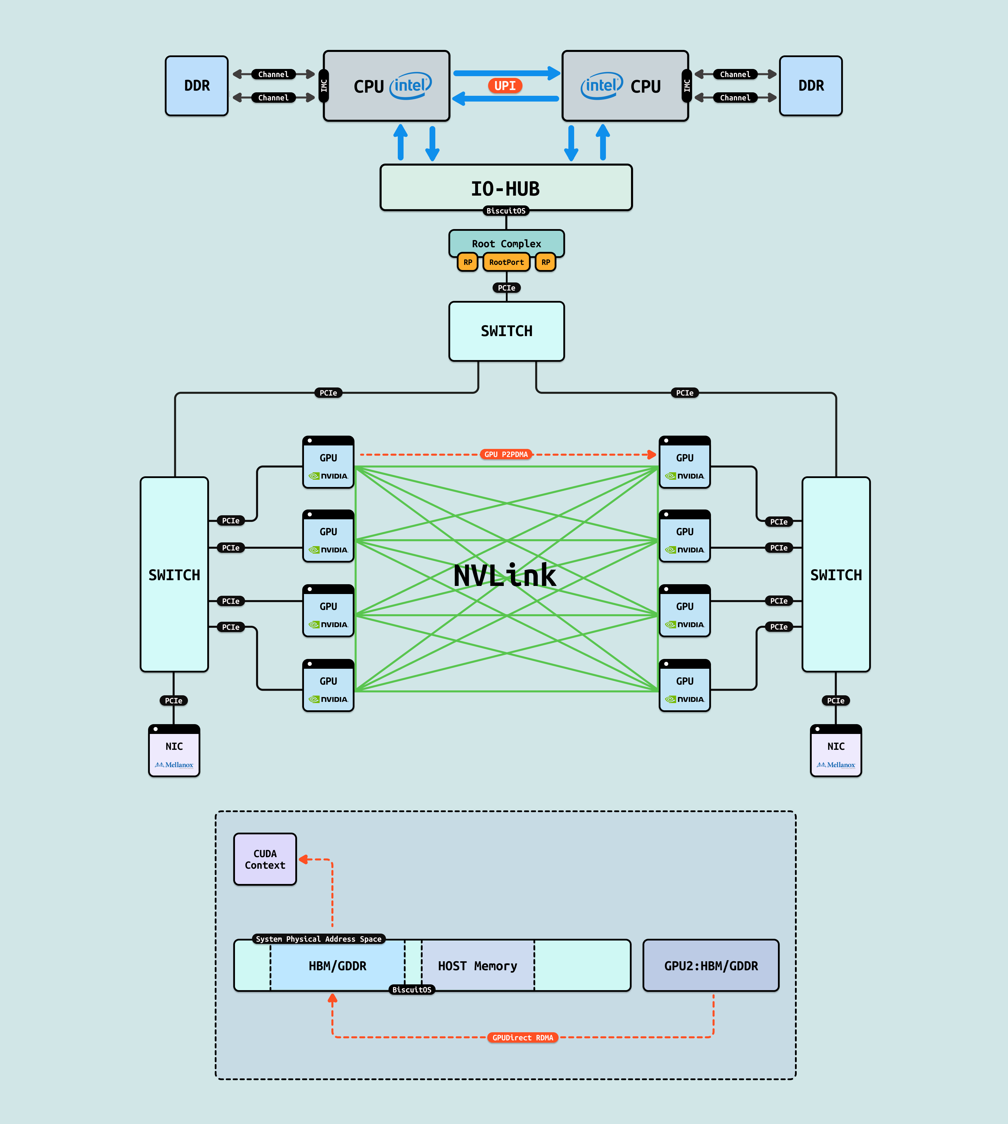 P2PDMA: DMA 的特点是每次需要将数据搬运到系统物理内存,但对于两个 GPU 之间数据交互可以进行直接搬运,无需绕道 RC 在本地 SWITCH 即可完成. P2PDMA 可以实现两个 GPU 之间直接搬运数据,但前提是需要将两个 GPU 要搬运的显存映射到 PCIe 地址空间上. 对于 GPU,其物理地址空间既可以看到自己的 HBM/GDDR 显存和 Host 侧内存,又可以看到 GPU2 暴露出来的 HBM/GDDR 显存, 同理 GPU 也将一部分显存暴露到 PCIe 地址空间上. 虽然 GPU 可以看到另外一个 GPU 的显存,但由于其无法另一个 GPU 显存 CACHE 一致性,因此其只能先通过 P2PDMA 将数据搬运到自己的显存,然后在访问显存里的数据.