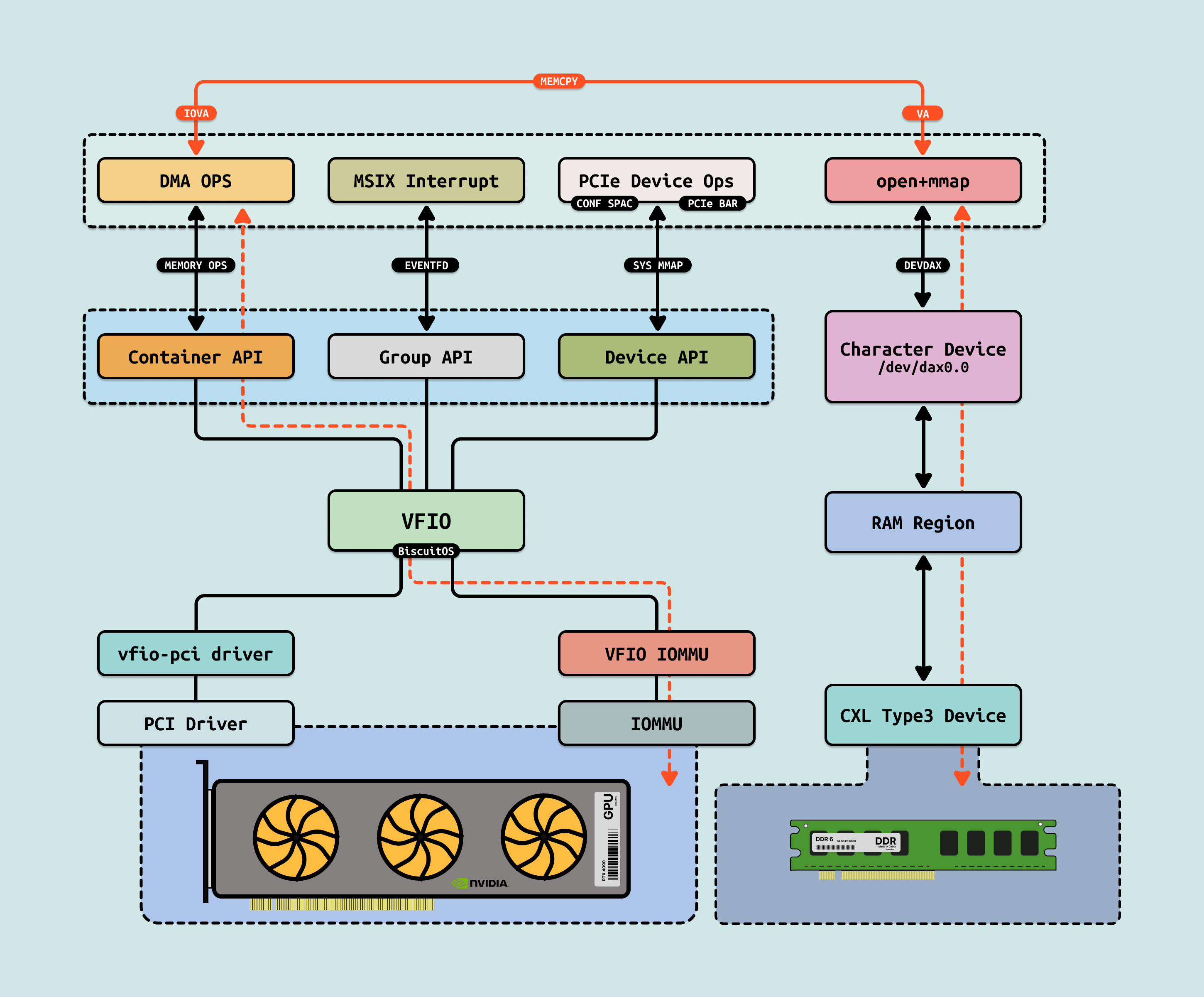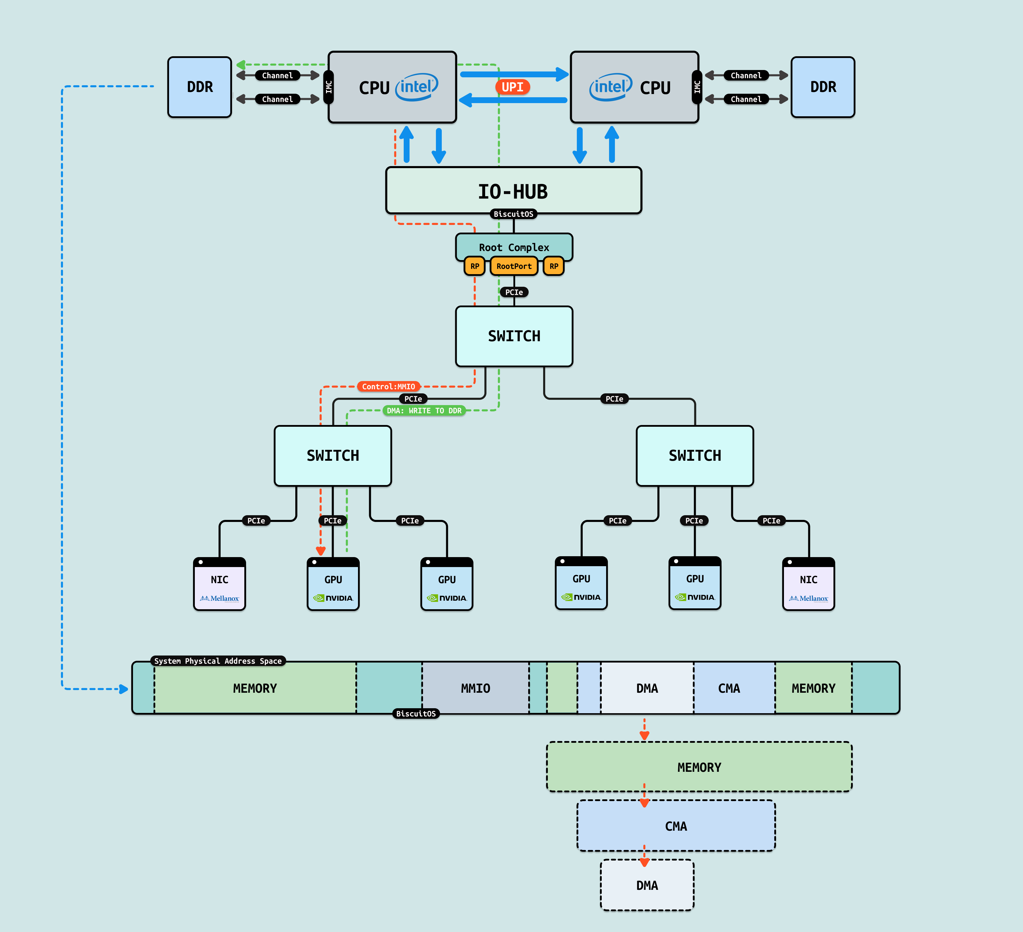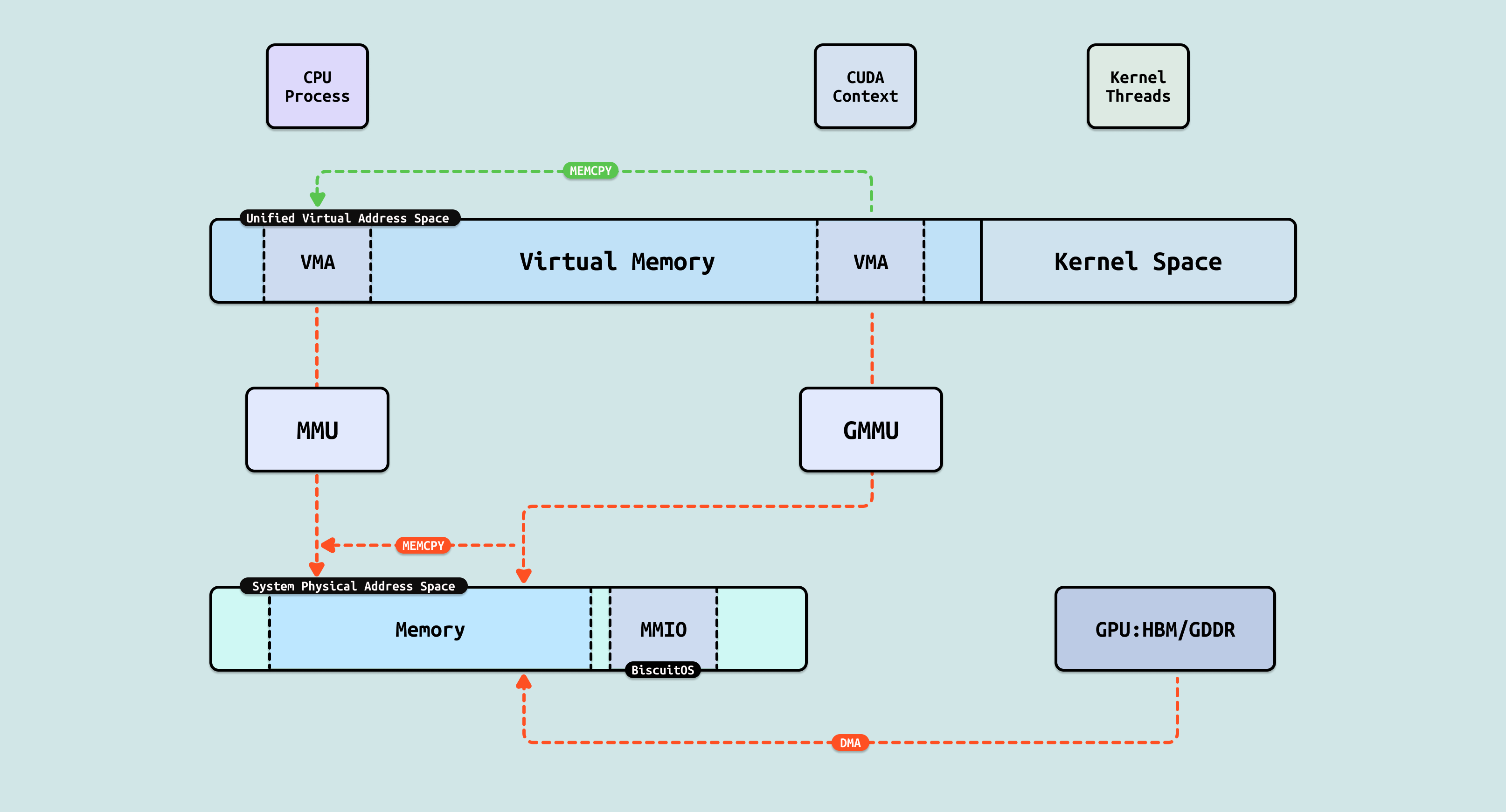 如果 GPU 没有把显存通过 MMIO 映射到系统物理地址空间,CPU 无法看到且直接访问 GPU 内部的显存(GDDR/HBM) 等存储空间,然而 GPU 是可以看到 HOST 侧的系统物理内存,但同时也无法直接访问(Load/Store). 于是 GPU 会将一部分寄存器通过 MMIO 方式映射到系统物理地址空间,CPU 可以通过这些寄存器让 GPU 发起对 HOST 内存的访问操作,该过程称为 DMA 操作. CPU 发起 DMA 首先需要控制面配置 GPU DMA 操作的基础信息,接着在无需 CPU 介入的情况下,GPU 独自发起对 HOST 内存的读写操作,GPU 的 DMA 完毕之后,CPU 在访问 DMA 操作的物理内存,因此可以通过 DMA 间接访问 GPU 的显存, 这里将 DMA 操作使用的物理内存称为 DMA 内存.