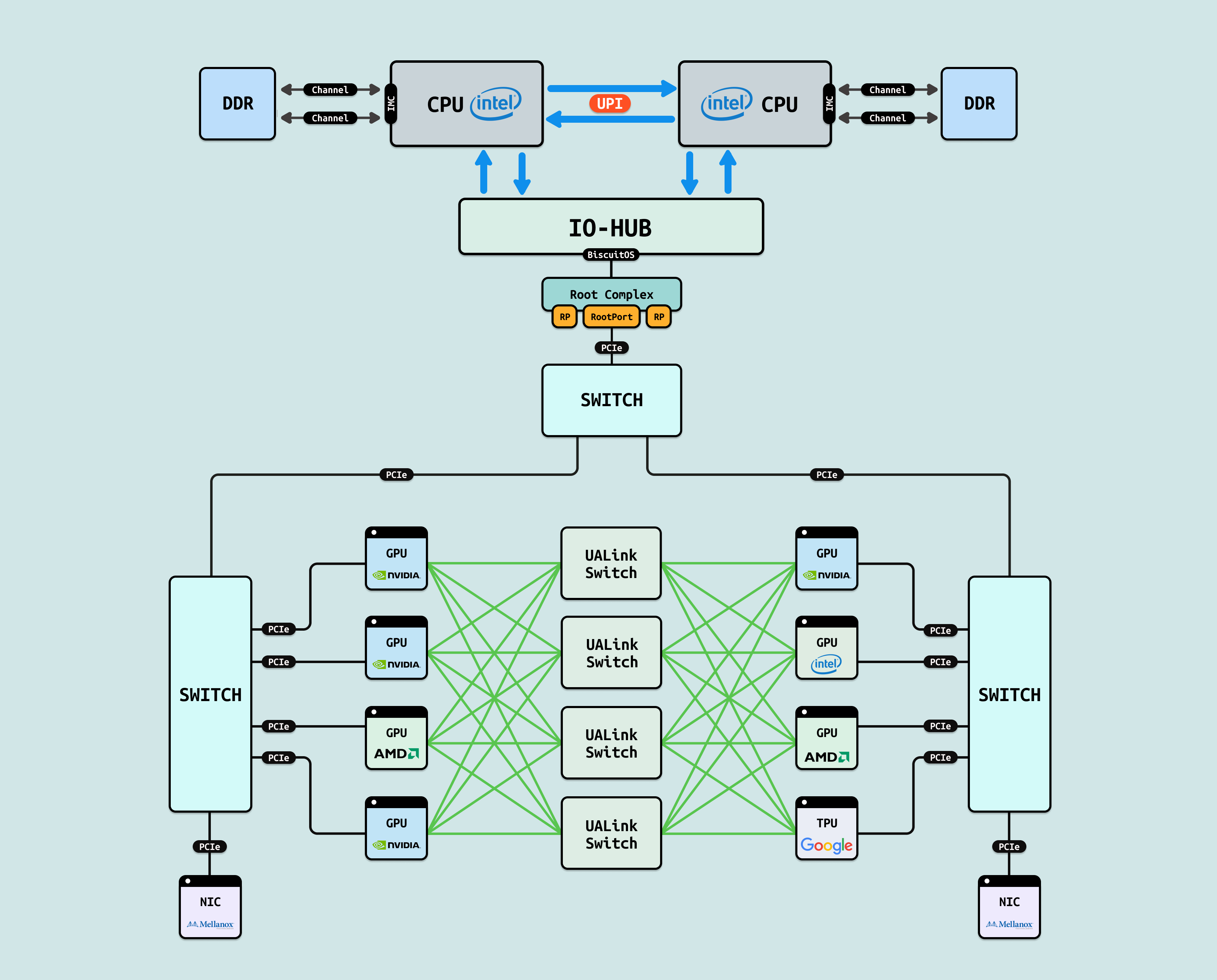 - 第一阶段: CPU 间的互联奠定同构基础, 通过 UPI 或 Infinity Fabric 等链路,多 CPU socket 实现 NUMA 一致性与数百 GB/s 共享,支撑 AI 数据预处理和调度,确保通用计算的低延迟协作(如 50ns 级),为异构引入预留 I/O 桥接