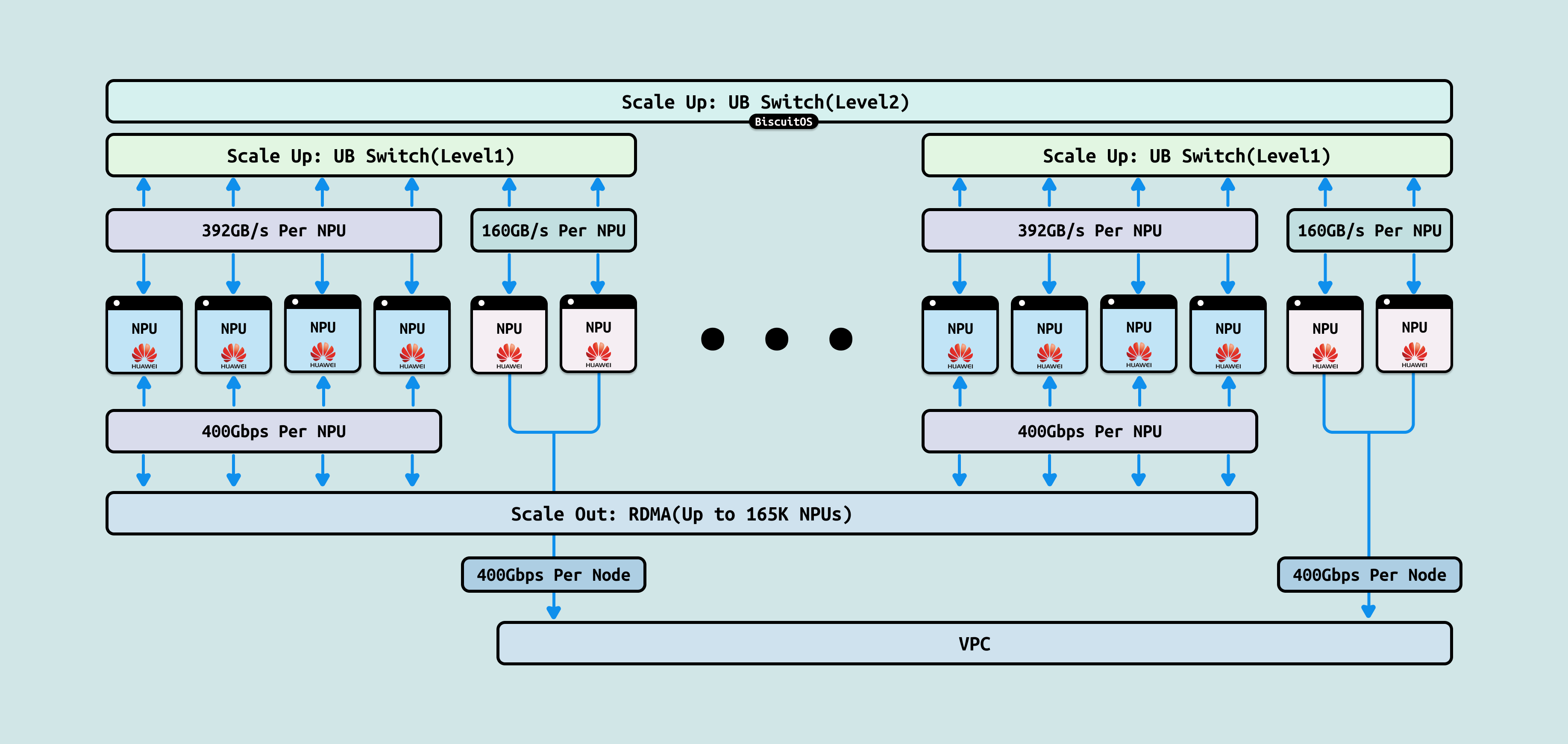 UB-Mesh 是华为 Ascend 910B/910C GPU 的专有多节点互联技术,基于 400G Ethernet 变体,支持 mesh 拓扑,带宽 ~400-800GB/s/链接,延迟 ~200 ns,形成全对全或分层网格,用于异构集群扩展. 使用 UB-Mesh 的原因是其支持 Scale-up 通过节点内 UB-Link 强化 GPU 聚合(~2 TB/s/节点) 和 Scale-out 跨 512+ 节点形成动态 mesh,加速集体操作如 HCCL 原生优化. 其机制在于 GPU 通过 UB-Adapter 桥接 Switch,形成自适应路由,集成 RDMA 和 FEC(前向纠错),兼容 CXL 内存语义. 其优势在于成本低(Ethernet 基底),易集成云环境. 在 AI 中加速 MindSpore 框架的 Scale-out 5x,优化 Ascend 集群的张量分发,但局限在于华为生态依赖,兼容性需适配。Ascend 910C 512x 集群下,支持混合 Scale-up/out 训练