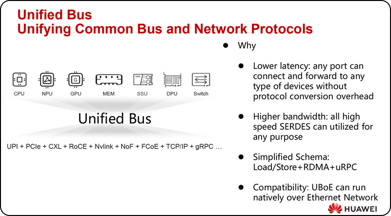 Huawei UB-Mesh Pooling 是华为 Ascend 生态的超融合池化方案,基于 UBoE协议统一总线和网络,支持 Load/Store + RDMA + URPC(Unified Remote Procedure Call) 机制,带宽 ~400GB/s/链接,延迟 ~100ns,形成 Ethernet 原生网格拓扑,用于 CPU/NPU/GPU/MEM/SSU/DPU/Switch 的全局池化. 使用 UB-Mesh Pooling 的原因是传统协议转换开销导致高延迟和碎片化,UBoE 通过统一 SerDes 端口实现任意设备互联,简化架构,支持动态资源借用,推动数据中心从专用服务器向池化演进. 其机制在于高速度 SerDes 复用任意目的(如 CPU 调度 GPU Warp 或 MEM 共享 HBM),兼容 Ethernet 网络,无需协议转换开销,实现”总线即网络”的原生运行. 其优势在于降低延迟(任意端口转发无开销)、更高带宽(SerDes 全速利用)和简化方案(Load/Store + RDMA + URPC 覆盖所有访问). 在 AI Scale-out 中加速跨域张量池化 6x,提升 AGI 资源利用率 90%,并兼容现有 Ethernet 基础设施,但局限在于华为生态依赖,标准化需时.