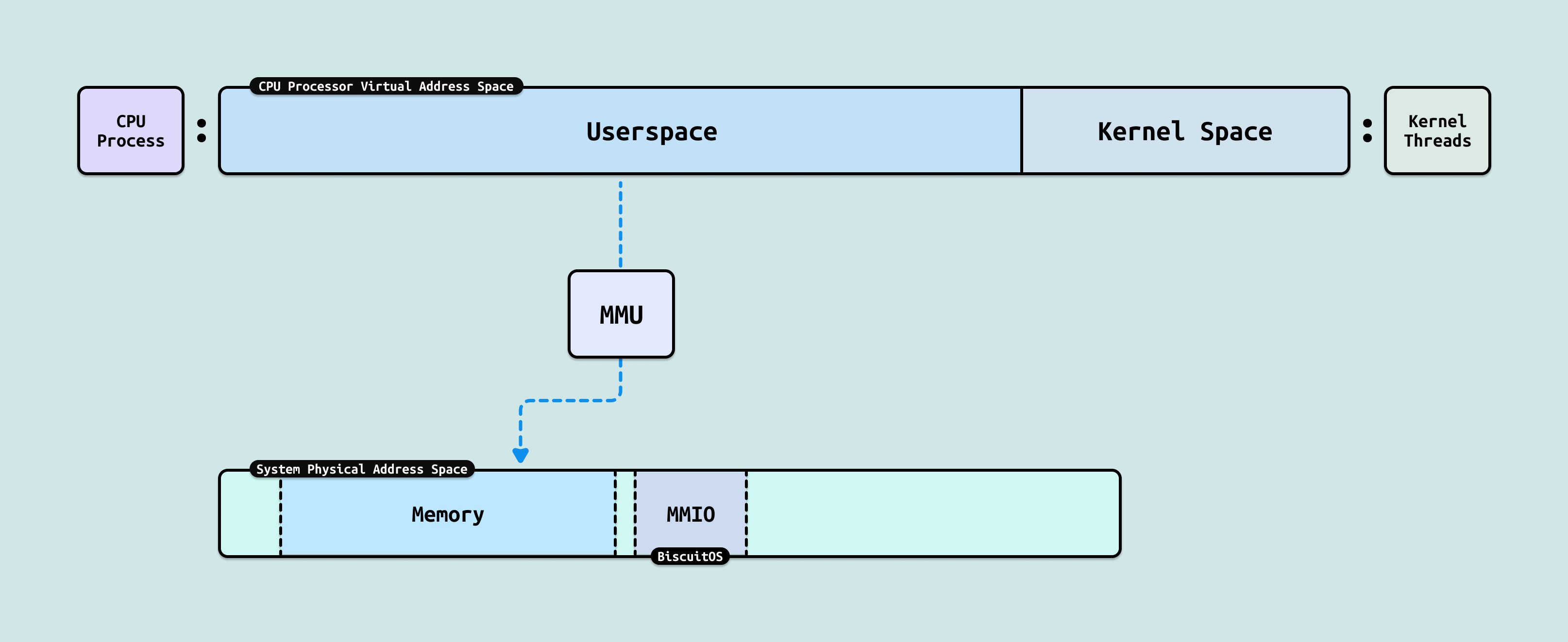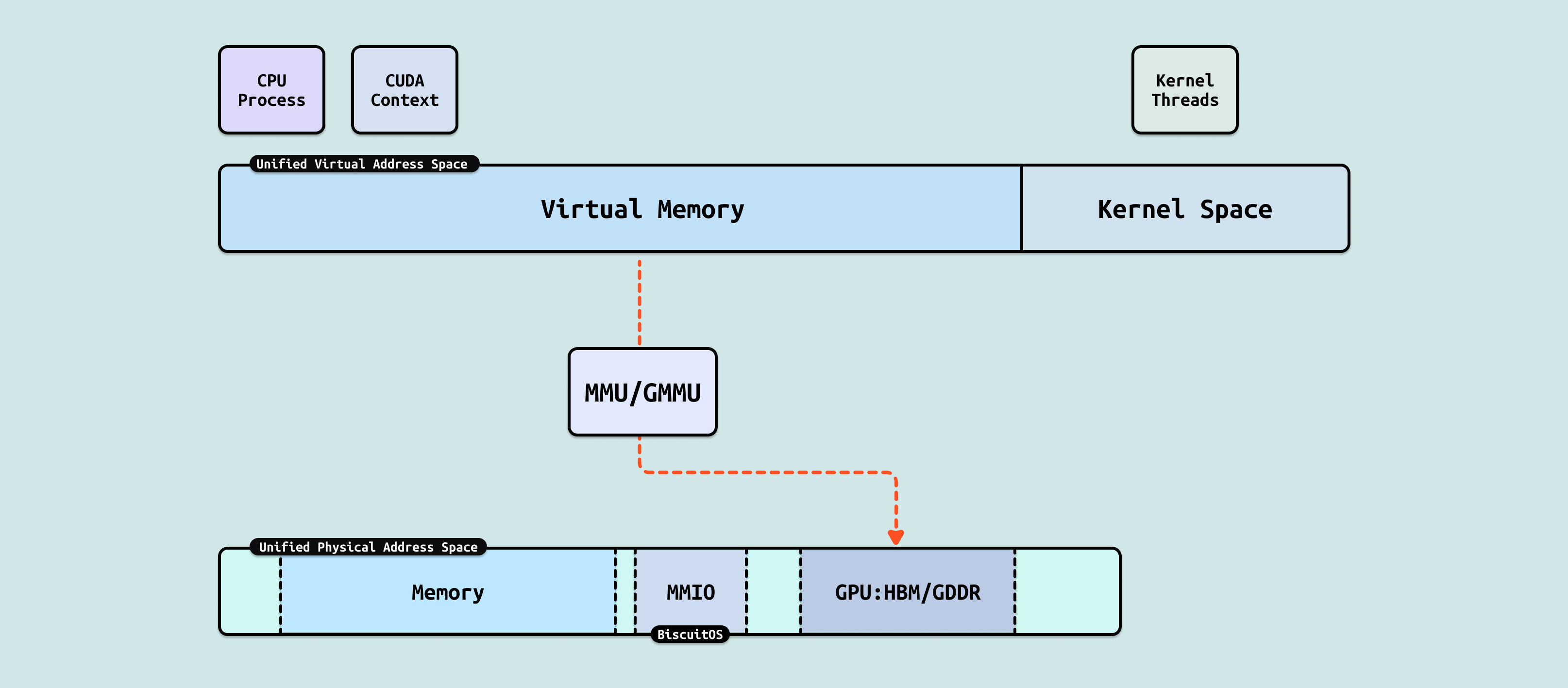 在 CPU 侧,进程是一个独立任务主体,其独占一份虚拟地址空间,虚拟地址空间包括两个部分,用户空间(Userspace) 由用户进程独占使用,内核空间(Kernel Space) 有内核线程或者用户进程内核态使用. 每个用户进程并不直接感知到其他进程的存在,需要通过 IPC 等手段才能与其他进程进行通信,因此 CPU 可以让多个任务并行运行,并作为调度实体进行资源调度. 进程的虚拟内存通过 MMU(内存管理单元) 映射到系统物理地址空间. 对于 CPU,系统物理空间可以映射 DDR 成物理内存,也可以映射 GPU 内部寄存器为 MMIO.