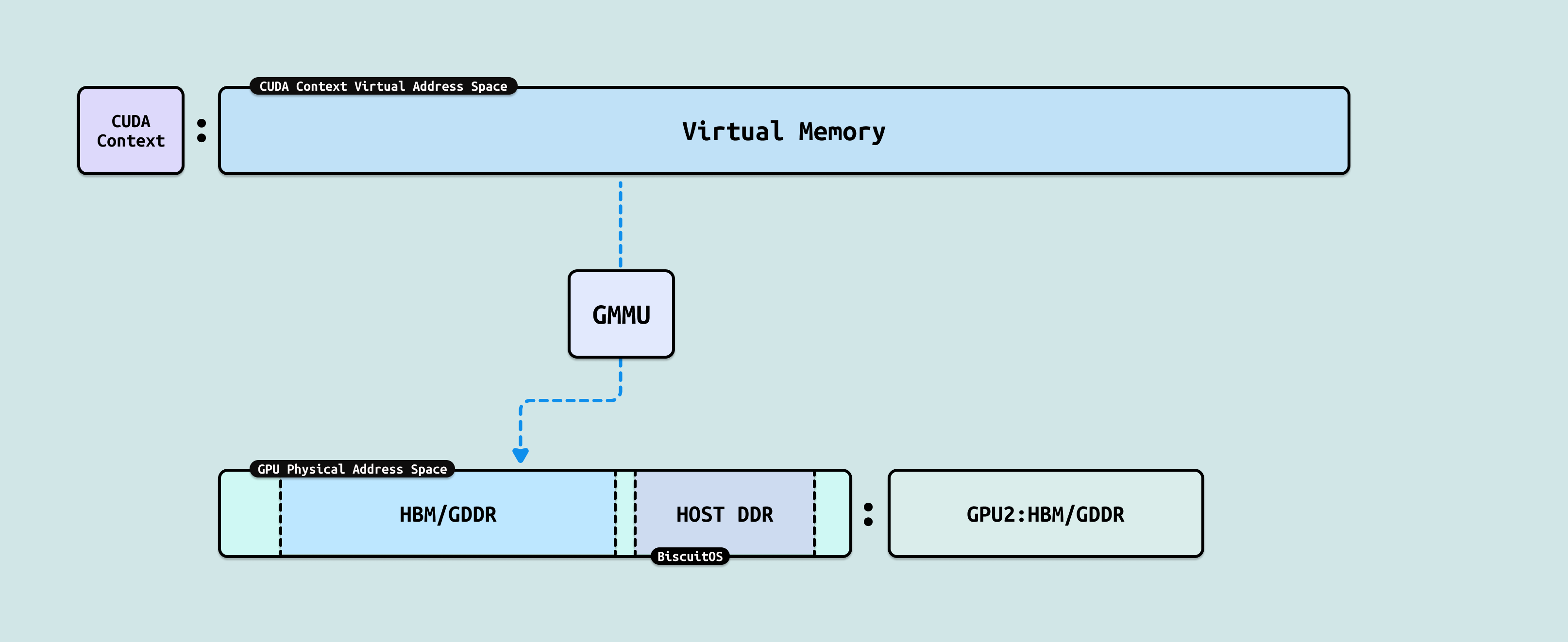 GPU 侧也有类似 CPU 进程的概念,其称为 GPU 上下文(或 CUDA 上下文),每个 GPU 上下文代表一个 “GPU 进程”,其也独占一份虚拟地址空间(Virtual Address Space). 由于 GPU 进程的存在,可以在 GPU 硬件上并发多个 GPU 应用而不冲突. 对于 GPU 其物理地址空间可以映射 HBM/GDDR 显存,也可以映射 Host 侧 DDR,形成一个统一连续的物理地址空间, 另外由于 NVlink/NVSwitch 的作用,GPU 可以通过 Read/Write 或者 Load/Store 的方式访问其他 GPU 的 HBM/GDDR, 因此其他 GPU 的 HBM 对于本 GPU 来说是一块块分离的地址空间. GPU 同样也存在 GMMU 组件,其可以将 GPU 进程虚拟内存映射到 GPU 物理地址空间.