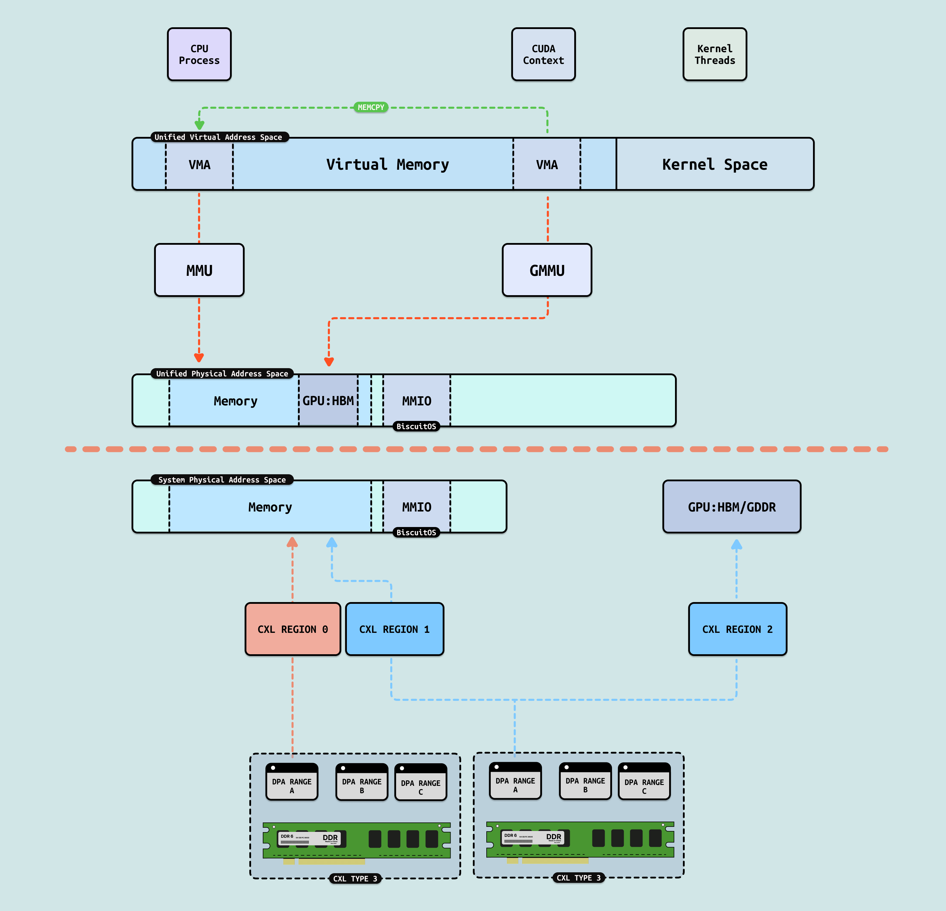 CXL Sharing/Pooling: CXL3.0 提供的 Sharing 能力可以将同一份 CXL Type3 Memory 映射到 Host 物理地址空间作为物理内存,同时映射到 GPU 的物理地址空间形成显存,CXL3.0 保证了其 CACHE 一致性,因此 CPU 进程对 CXL 内存进行读写操作时,GPU 显存就可以看到修改的结果,这就是 UPM 的基础. 同时 GPU 进程和用户进程都访问同一份虚拟地址,并且物理地址空间也是同一份.
