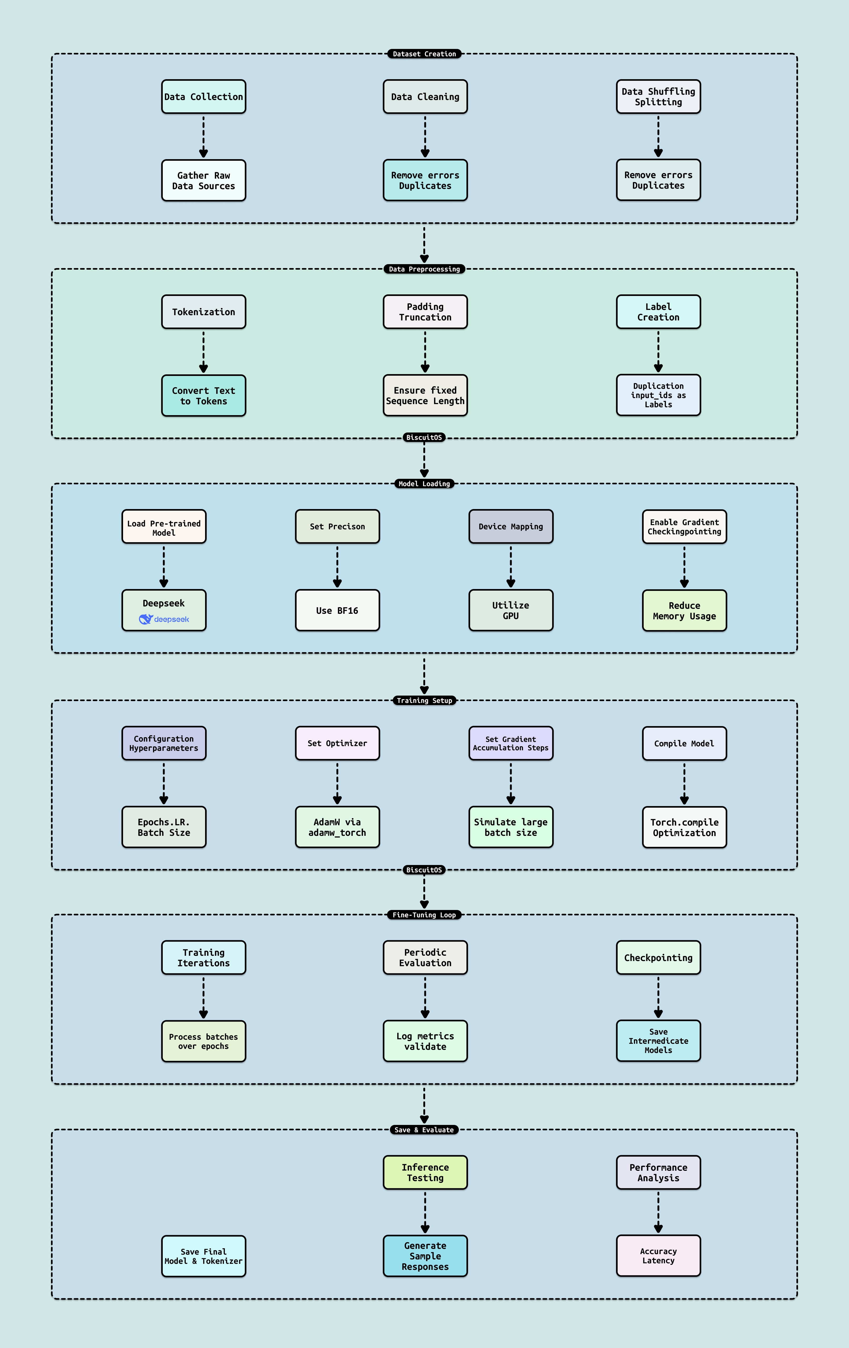 这些问题搁谁身上都挠头,我也不例外. 但正因为这样,我才想用最接地气的语言,从上到下捋一捋这个技术栈: 不整那些云里雾里的理论堆砌,而是直奔实践, 每个层级都配上可运行的代码片段、调试技巧和 HPC 场景下的坑点解析,让你边看边试,搞懂为什么 AiOS 的内存池能让跨节点训练不卡壳,为什么 Infra 层的 RDMA 驱动一调优,就能把 GPU 集群的吞吐拉到 TB/s 级别. 最终,我还独家贡献了多张张手绘图片: 不是冷冰冰的 UML 图,而是像漫画一样把抽象概念具象化: 想象 LLM 训练像一场”分布式接力赛”,AiOS 是赛道上的”智能裁判”,Ai Infra 则是那些”闪电高铁”般的硬件轨道. 一张张看下来,你会发现那些高难度技术,原来就藏在日常调试的逻辑里. 希望通过这篇文章,BiscuitOS 的童鞋们不光能读懂 AI,还能上手搞出自己的 AI 项目,一起把社区的内核 AI 生态推向新高度. 接下来,我们将逐层展开,从 LLM 的训练微调入手,一步步拆解工程细节,直至 Infra 硬件的内核驯服之道.