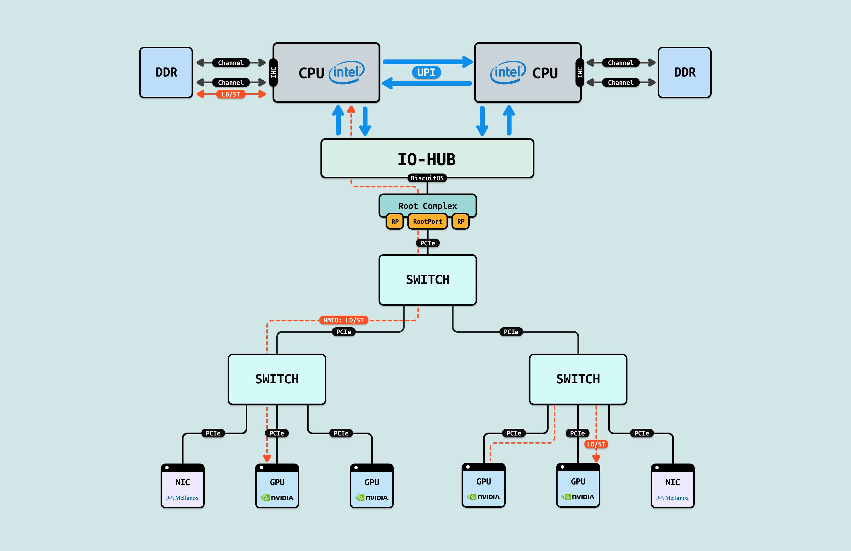 在介绍完 GPU 内部结构之后,接下来探讨 CPU 如何与 GPU 互联, 传统方式下,CPU 通过 PCIe 连接到 GPU. 在现代 Intel Xeon 处理器(如 Granite Rapids)上,北桥已集成到 CPU 内部,CPU 直接向外提供 Root Port 接口. 我们将 CPU 内部处理 PCIe 的部件统一抽象为 Root Complex. CPU 的 IO-HUB 上集成了 Root Complex,Root Complex 作为 PCIe 树的根节点,向下扩展出多个 Root Port,Root Port 上可以直接接入 PCIe EP,也可以连接 PCIe Switch 的上游端口,支持树状扩展. 如图所示,双 Granite Rapids CPU 通过 UPI 实现 NUMA 一致性,并连接 DDR 通道. IO-HUB 集成 Root Complex,作为 PCIe 树的根节点,从 Root Port 向下扩展至 PCIe Switch 的上游端口. Switch 分支出下游链路, 一个主 Switch 连接两个子 Switch,每个子 Switch 有三个下游端口,分别接入 NIC 和 2 个 H100 GPU. 这种星状拓扑最小化路径直径,支持多 GPU 扩展,确保 AI 数据从 CPU NUMA 域高效流向 GPU SM 集群,而无需 CPU 干预中转.