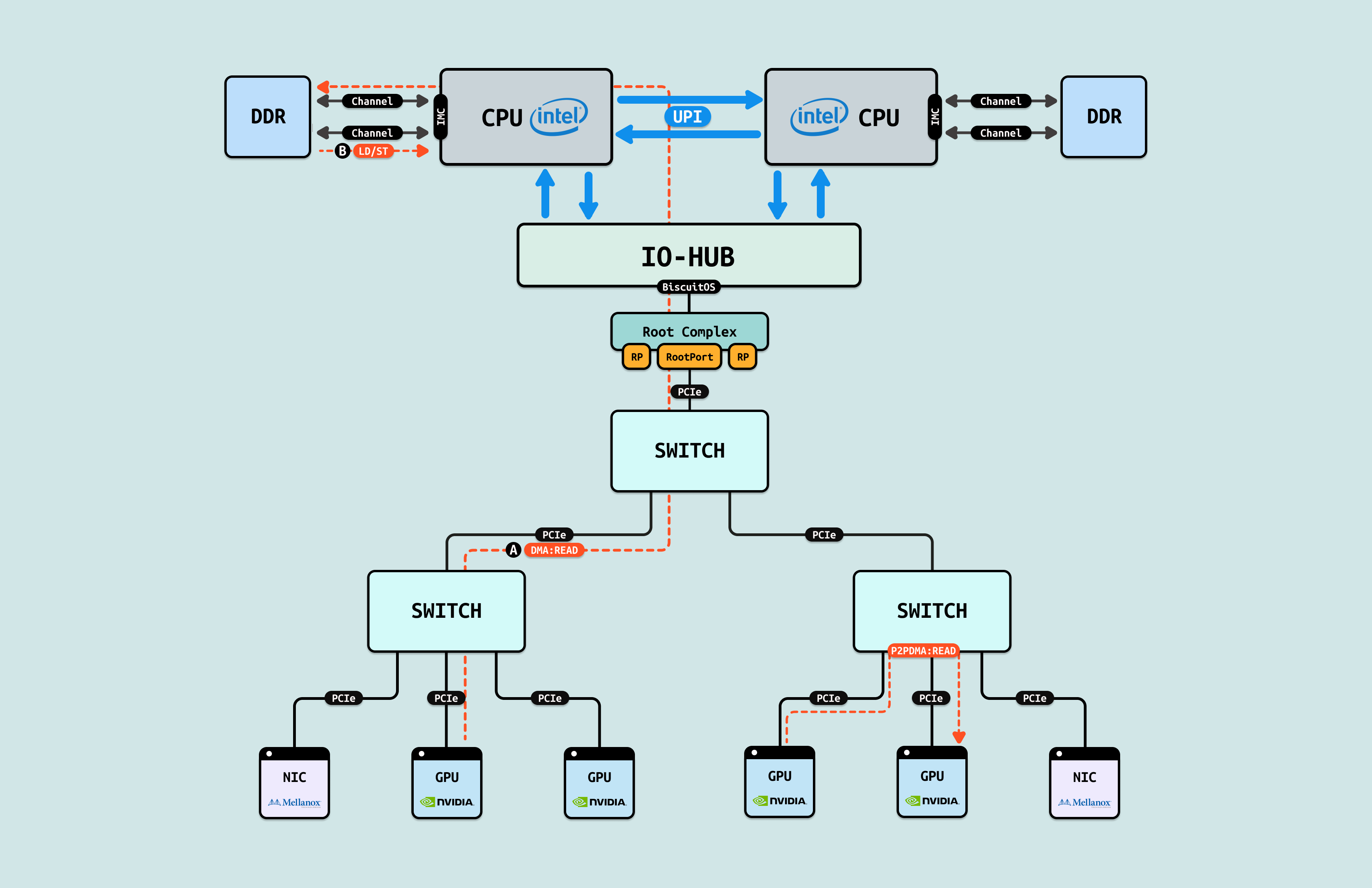 对于 GPU/GPU 和 GPU/NIC 之间存在的内存墙,第一种解决方案是 “P2PDMA”, 其先将各自的一部分内部存储空间映射到 PCIe 地址空间(系统物理地址空间),让对方都能看到. 其次是 CPU 从控制面配置好 P2PDMA 之后,GPU/GPU 或 GPU/NIC 之间直接进行 DMA 操作,数据流在临近的 PCIe Switch 直接流动,不会绕到 RC 去,这样即缩短了数据链路的距离,也缓解了其他 PCIe 链路的拥塞.