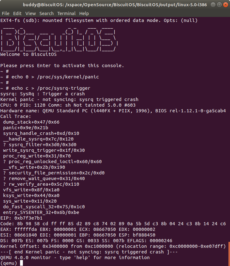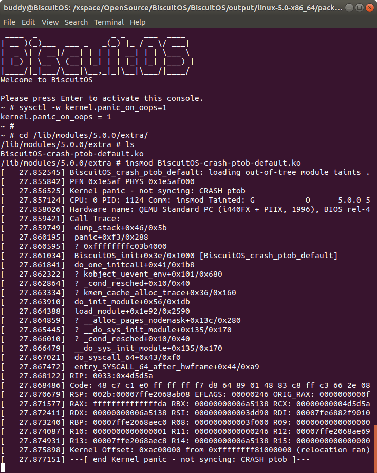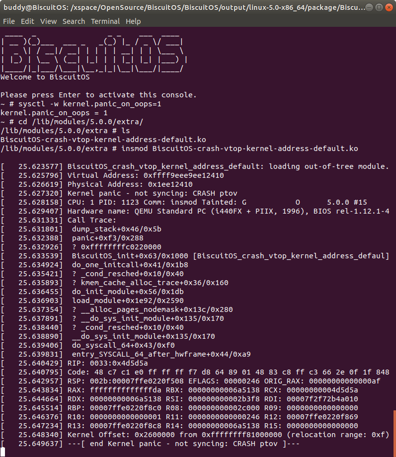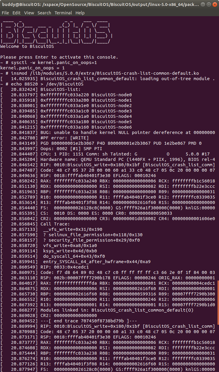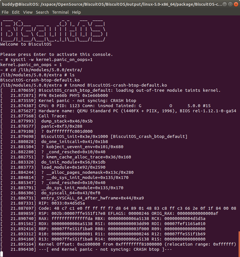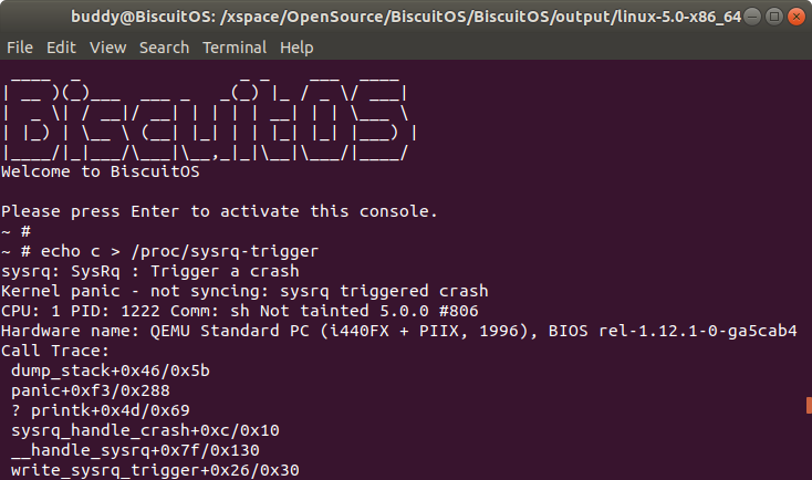 BiscuitOS 方案指的是基于 BiscuitOS 构建的内核 kdump 抓取方案。该方案的主要思路与同样方案一致,不同点在于使用 BiscuitOS 快速部署所需的工具和开发环境。在该方案中当内核发生 panic 的时候,可以使用 kexec 快速重启一个新的内核,以此给维护人员创造一个保留问题现场的机会,在进入新系统之后维护人员可以将内核 kdump 内容保存在指定位置,以此由于后期问题的排除。为了实现上面的功能,需要打开内核某些功能,并为 kexec 提供一个可以快速重启的内核,最后就是使用 crash 等工具进行问题排除。由于该实践基于 BiscuitOS linux 5.0 X86_64 架构,没有搭建该环境的开发者可以先搭建环境再实践。那么开发者接下来参考下面的内容进行部署实践: