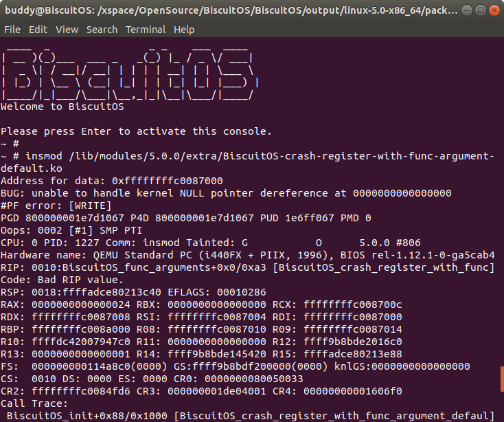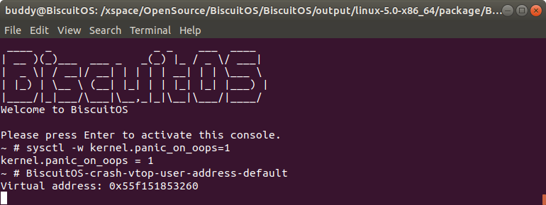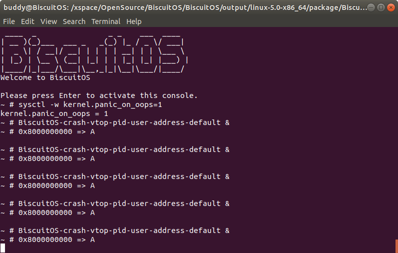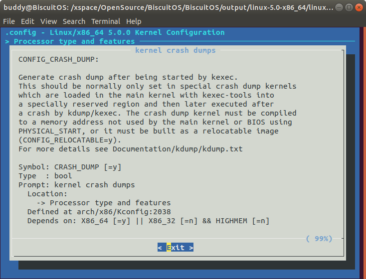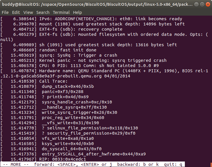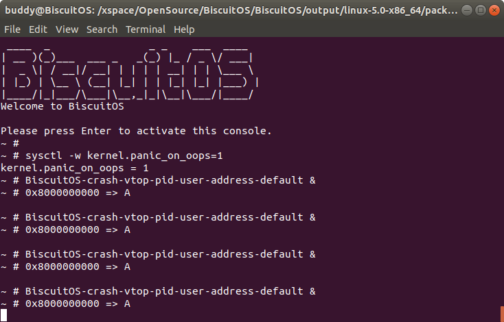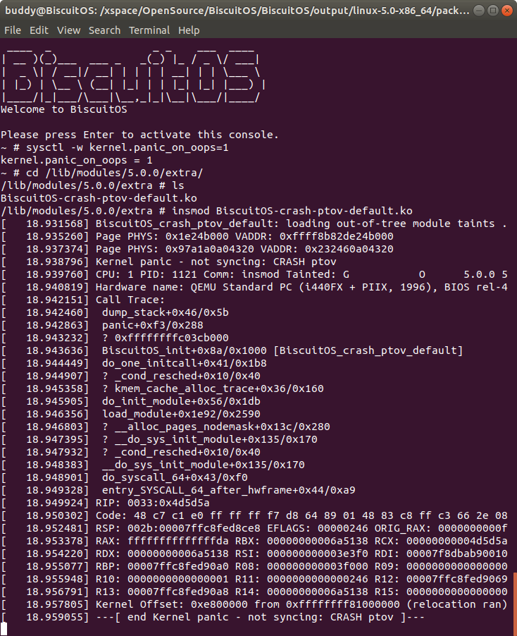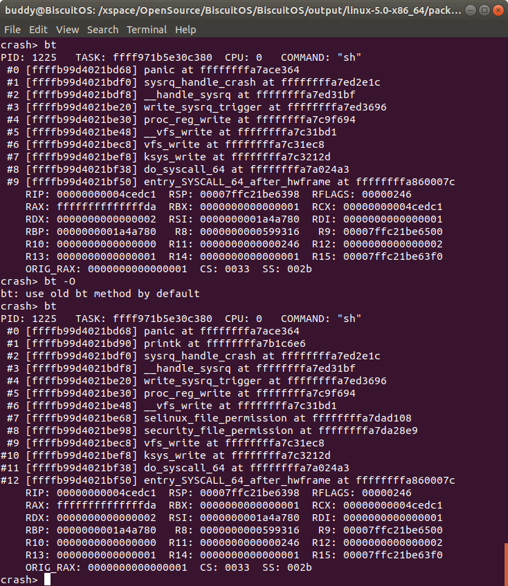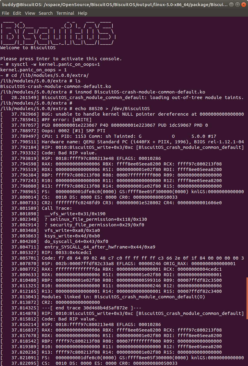 BiscuitOS 方案指的是基于 BiscuitOS 构建的内核 kdump 抓取方案。该方案的主要思路与同样方案一致,不同点在于使用 BiscuitOS 快速部署所需的工具和开发环境。在该方案中当内核发生 panic 的时候,可以使用 kexec 快速重启一个新的内核,以此给维护人员创造一个保留问题现场的机会,在进入新系统之后维护人员可以将内核 kdump 内容保存在指定位置,以此由于后期问题的排除。为了实现上面的功能,需要打开内核某些功能,并为 kexec 提供一个可以快速重启的内核,最后就是使用 crash 等工具进行问题排除。由于该实践基于 BiscuitOS linux 5.0 X86_64 架构,没有搭建该环境的开发者可以先搭建环境再实践。那么开发者接下来参考下面的内容进行部署实践: