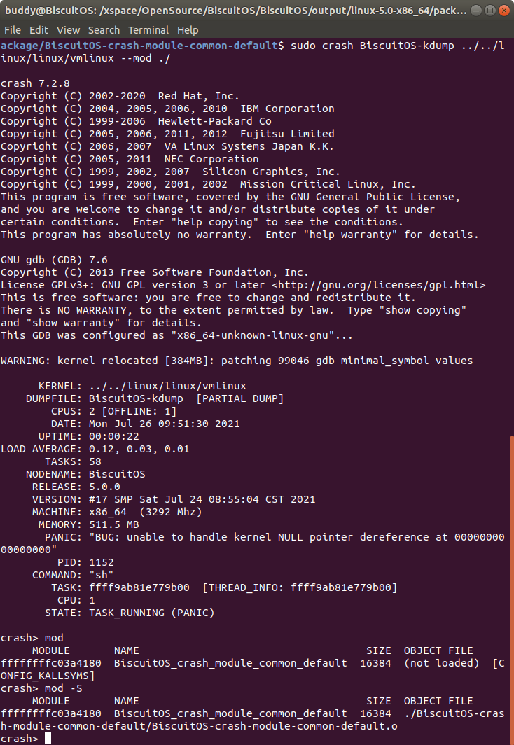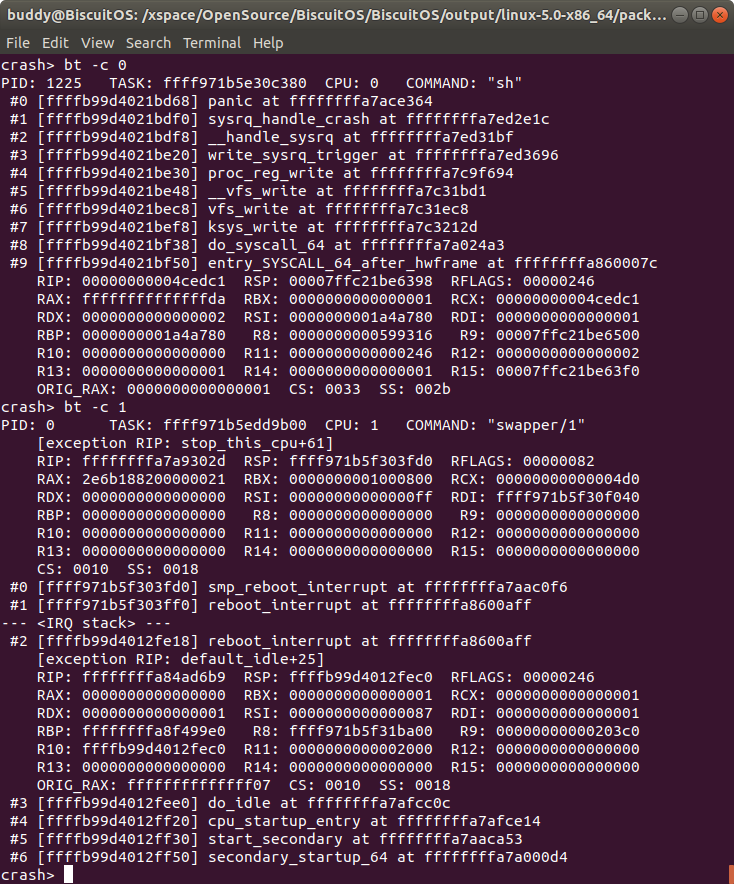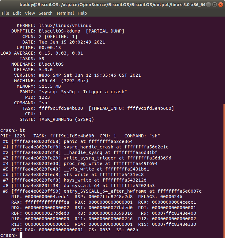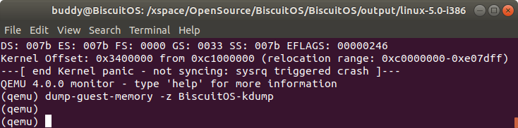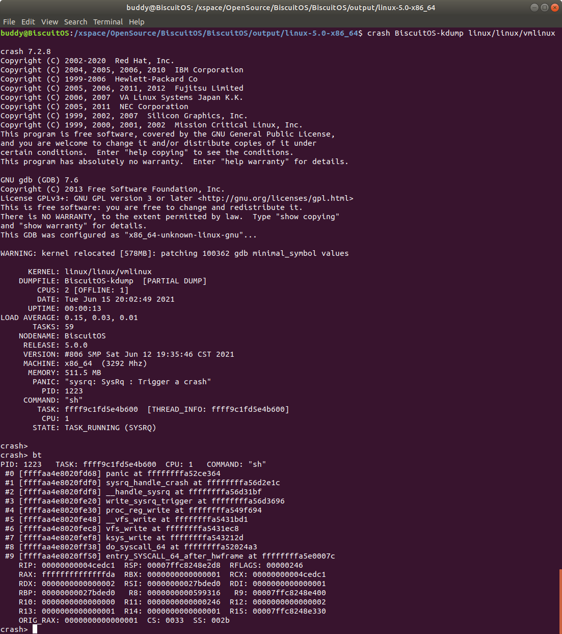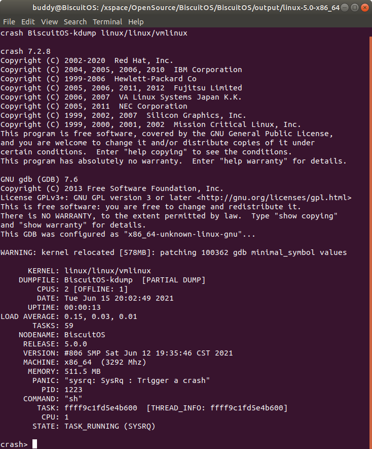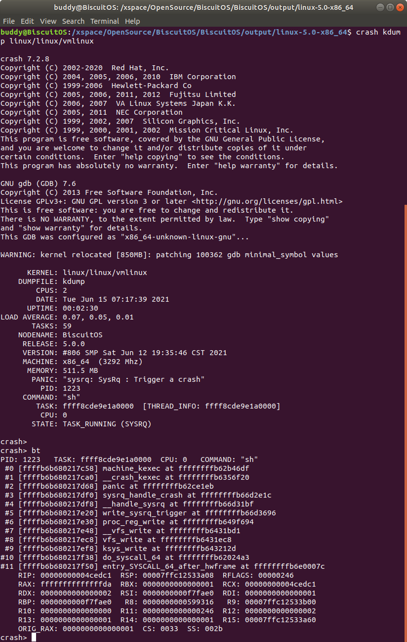 cp /proc/vmcore <Dump-file>“/proc/vmcore” 包含了 kdump 的内容,可以将 kdump 的内容拷贝到 BiscuitOS 的一个磁盘上,以便后期使用 crash 进行问题分析排除。