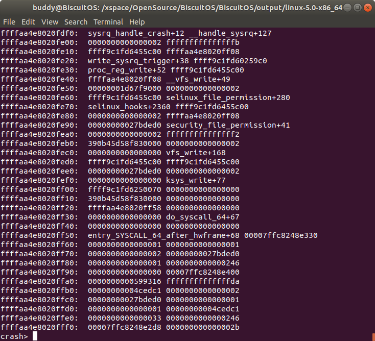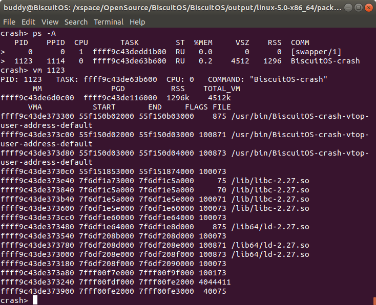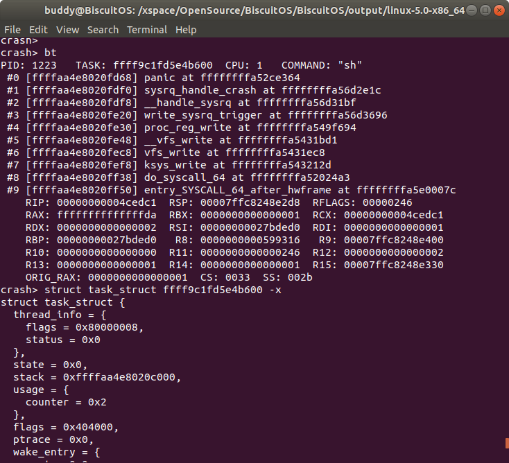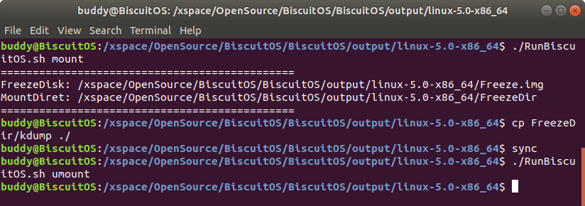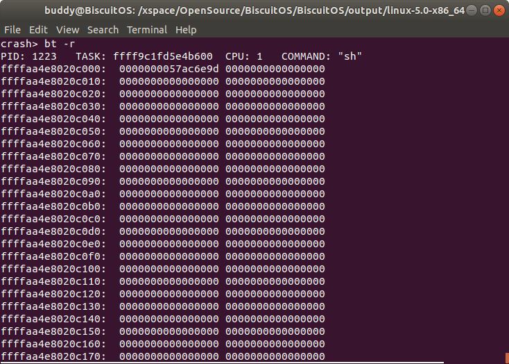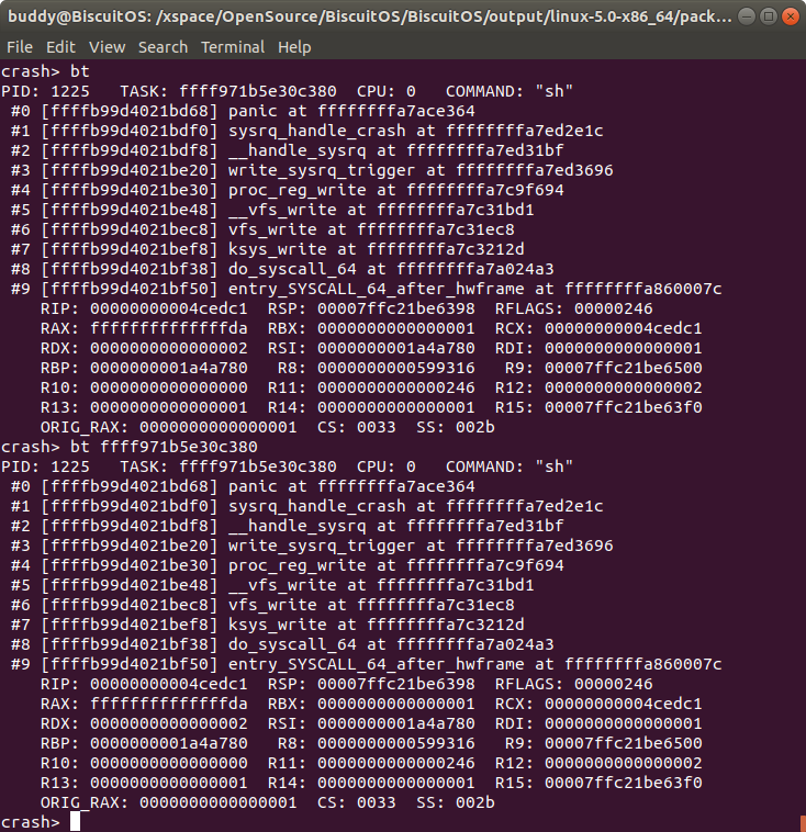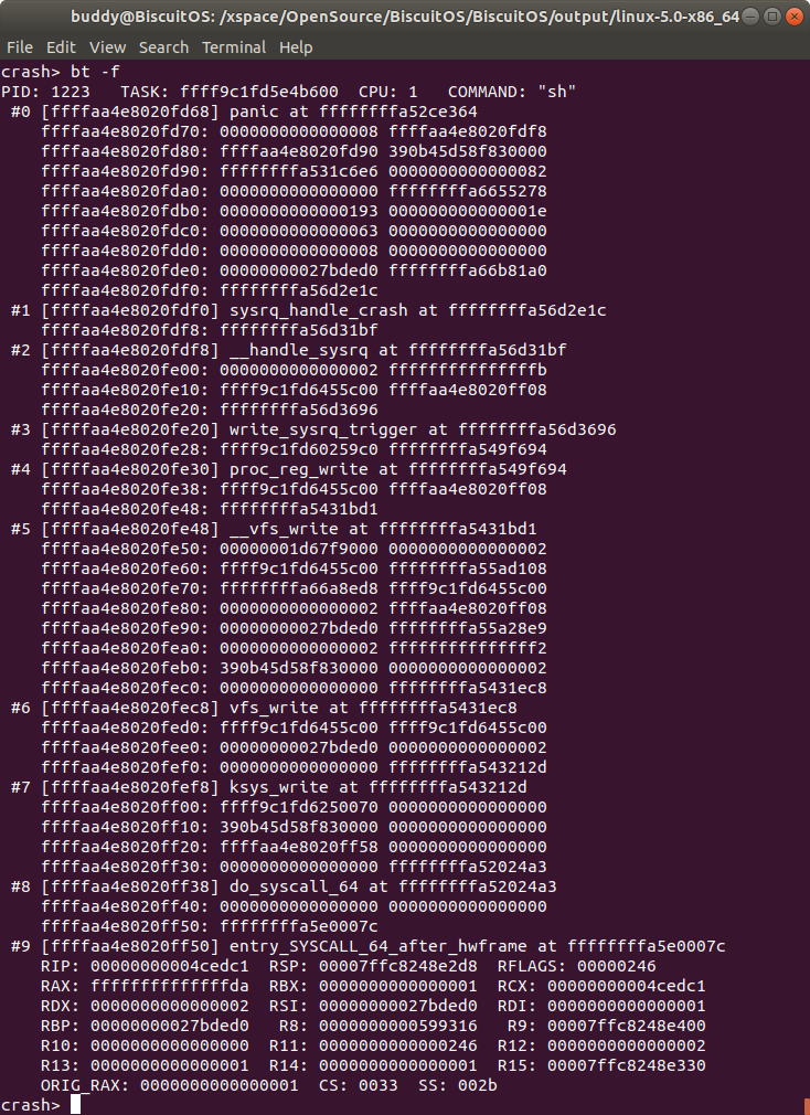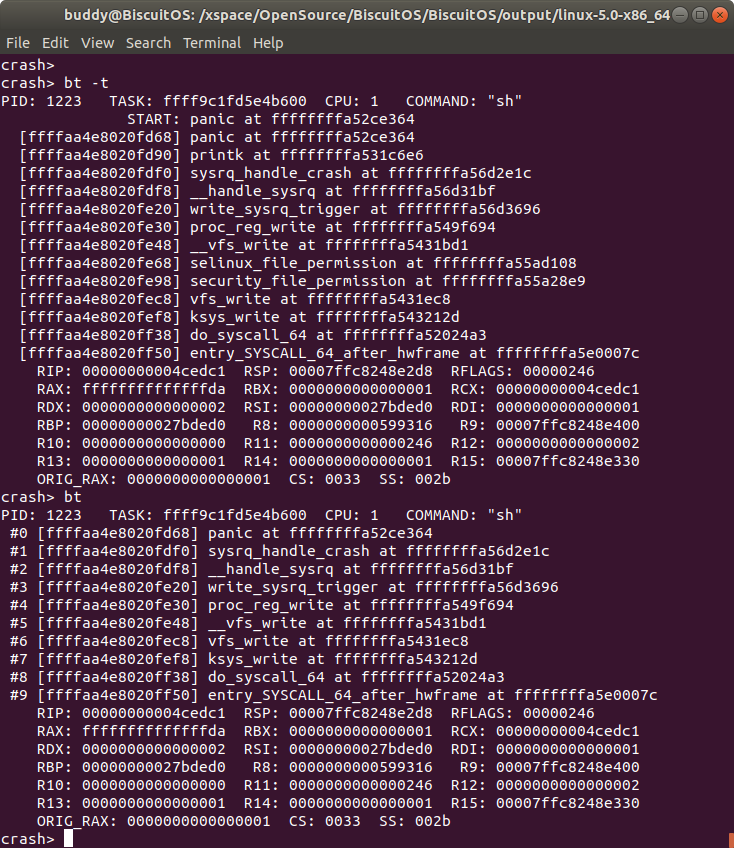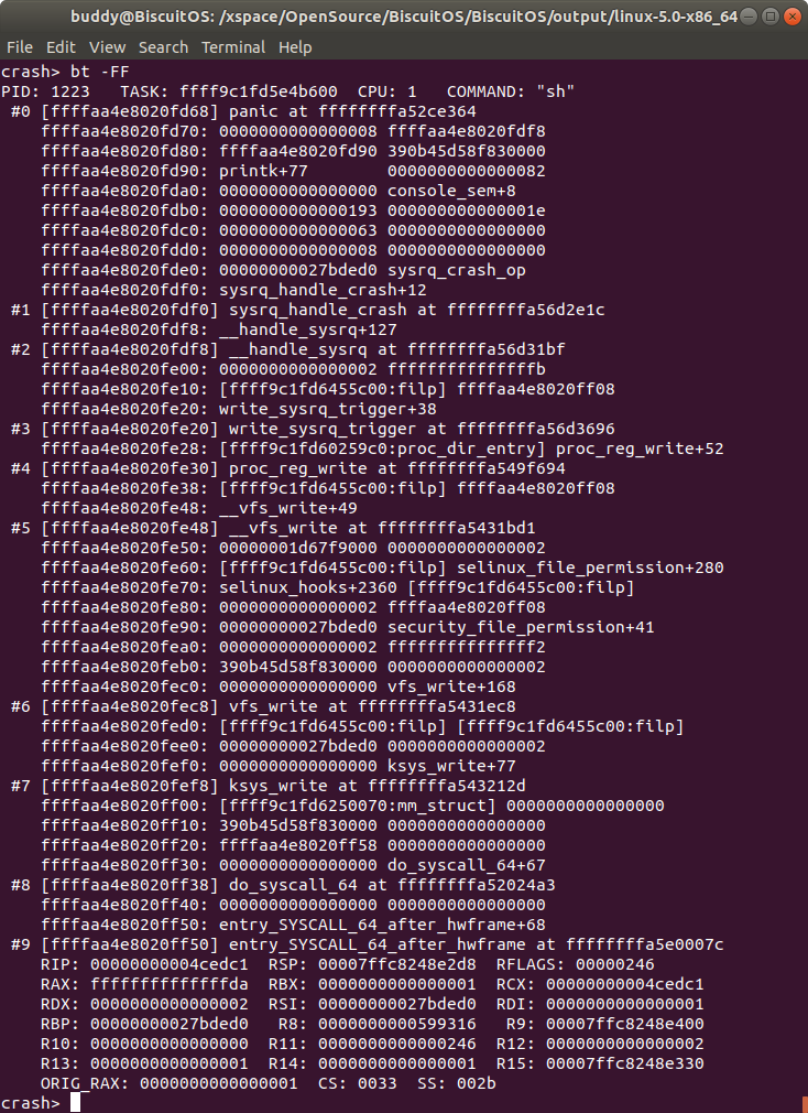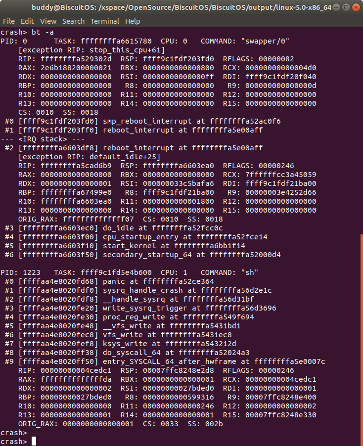 cp /proc/vmcore <Dump-file>“/proc/vmcore” 包含了 kdump 的内容,可以将 kdump 的内容拷贝到 BiscuitOS 的一个磁盘上,以便后期使用 crash 进行问题分析排除。