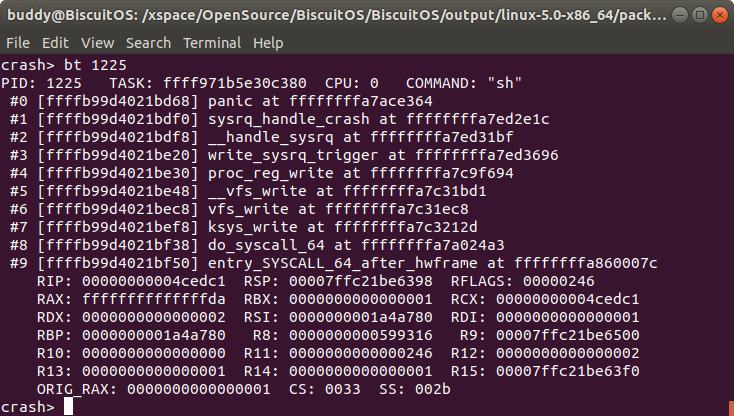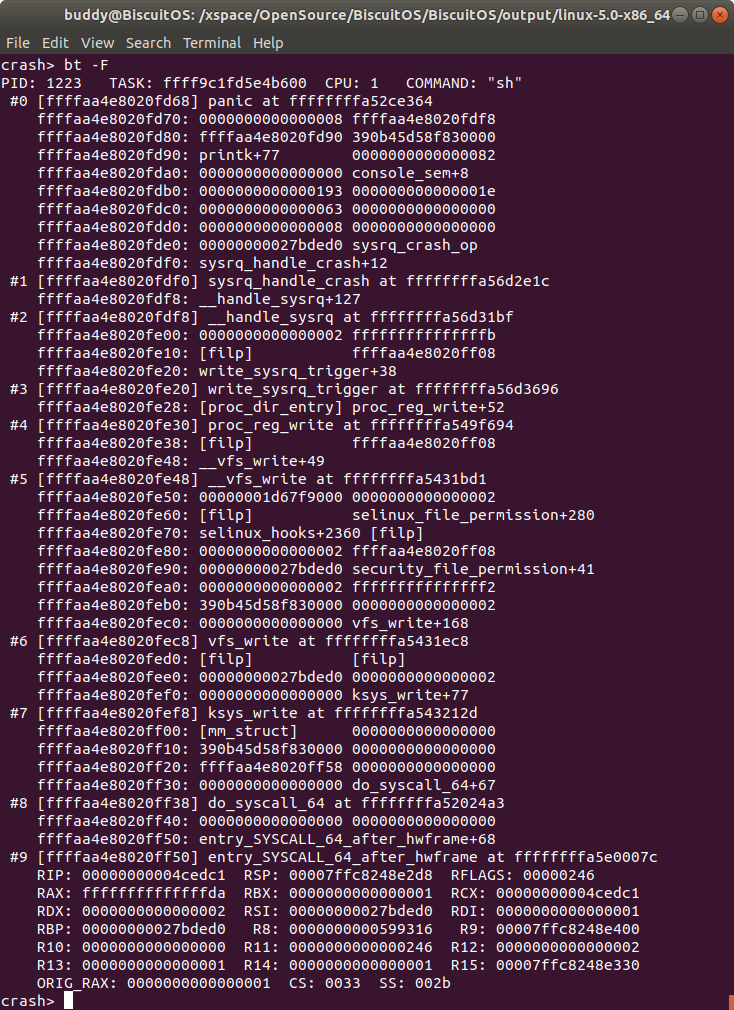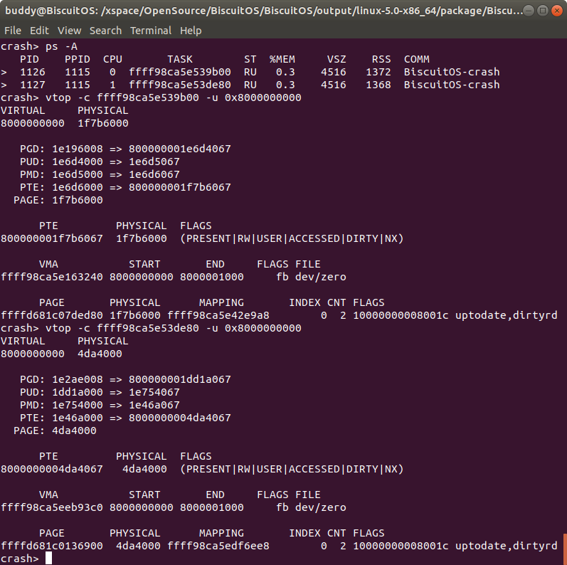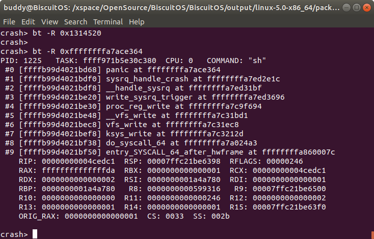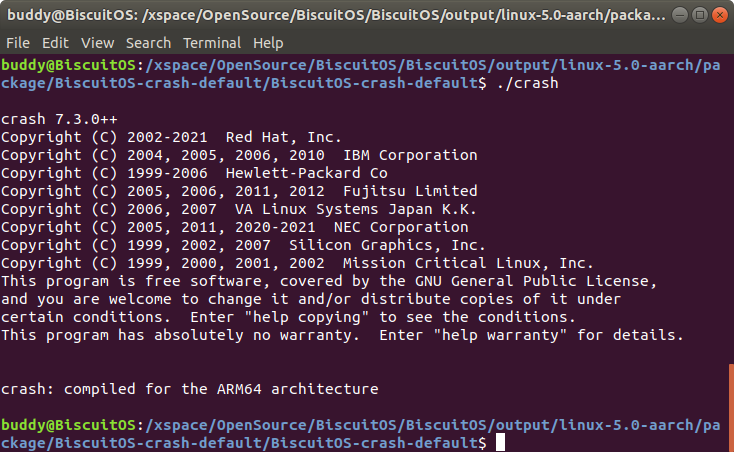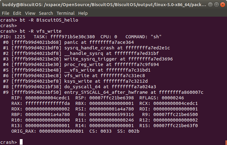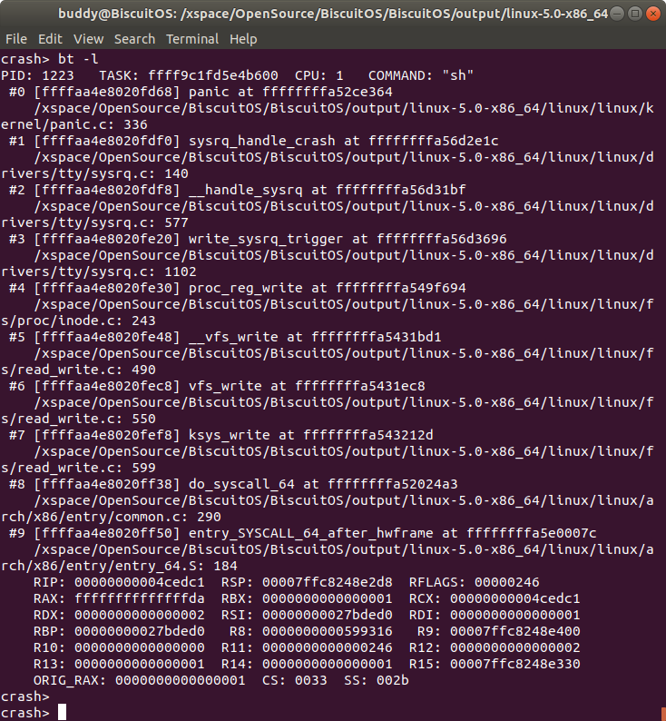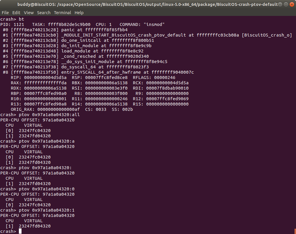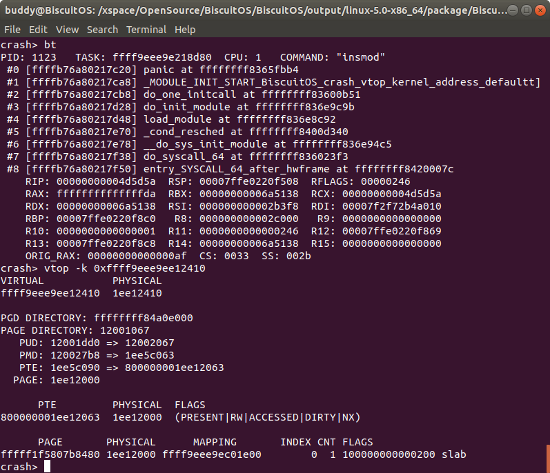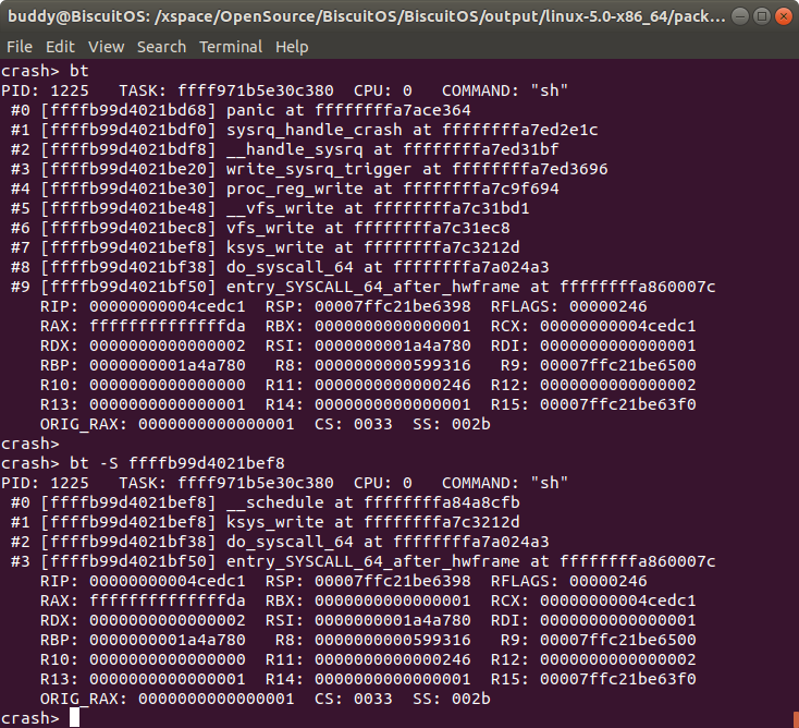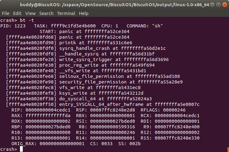 cp /proc/vmcore <Dump-file>“/proc/vmcore” 包含了 kdump 的内容,可以将 kdump 的内容拷贝到 BiscuitOS 的一个磁盘上,以便后期使用 crash 进行问题分析排除。