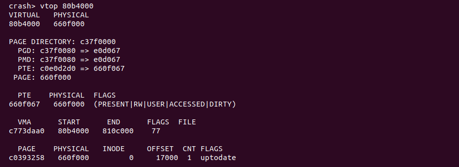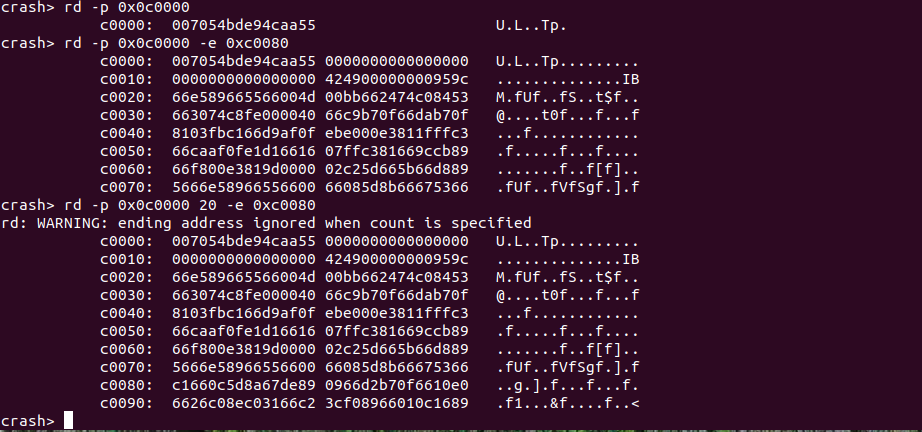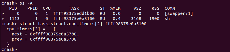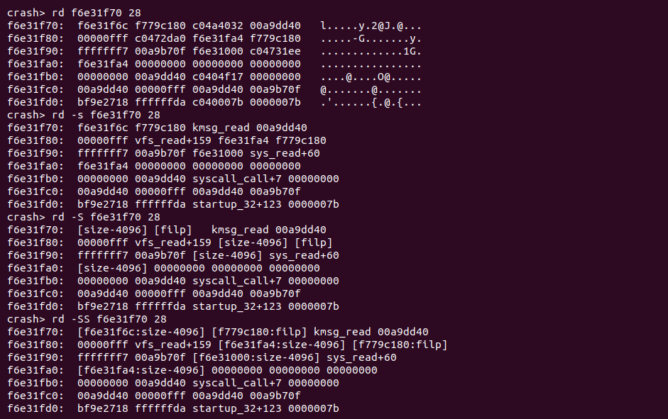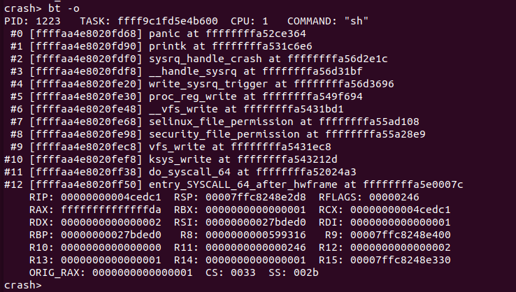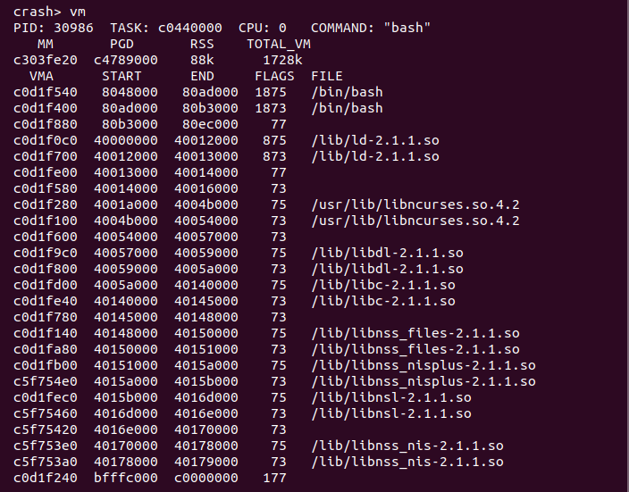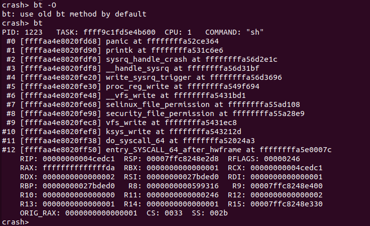 cp /proc/vmcore <Dump-file>“/proc/vmcore” 包含了 kdump 的内容,可以将 kdump 的内容拷贝到一个安全的地方,以便后期使用 crash 进行问题分析排除。当 kdump 内容拷贝完毕之后,接下来就是使用 crash 排除问题,参考如下命令: