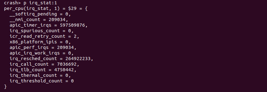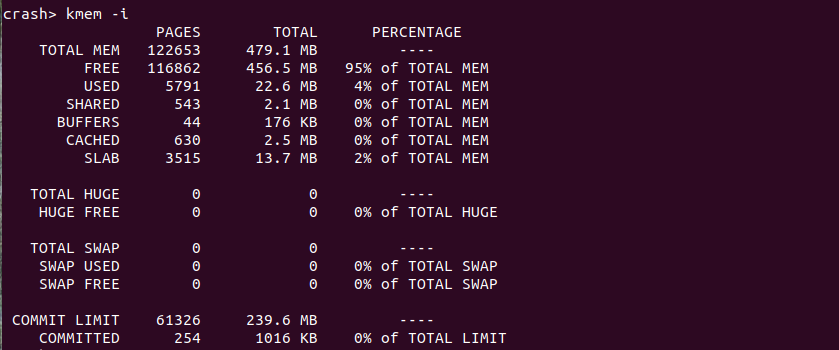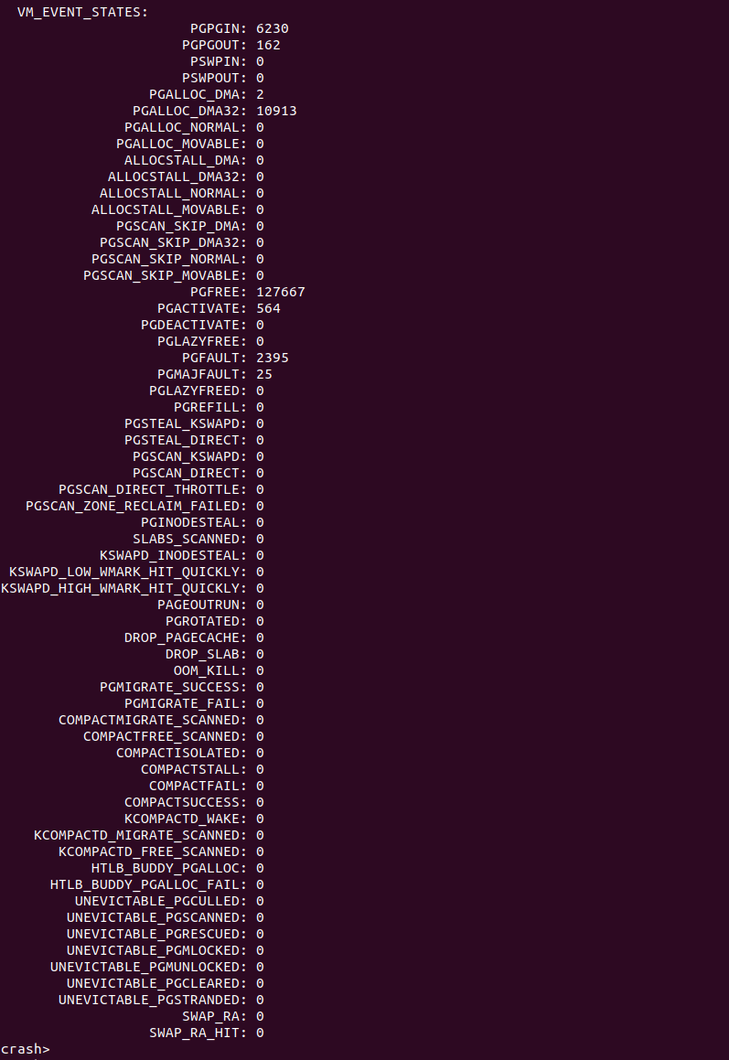 CRASH 提供的 “kmem -V” 命令可以查看内核崩溃时所有内存事件的统计数据,其数据来源正好是 vm_event_states 变量。因此可以通过这些数据分析内核崩溃时的内存情况: