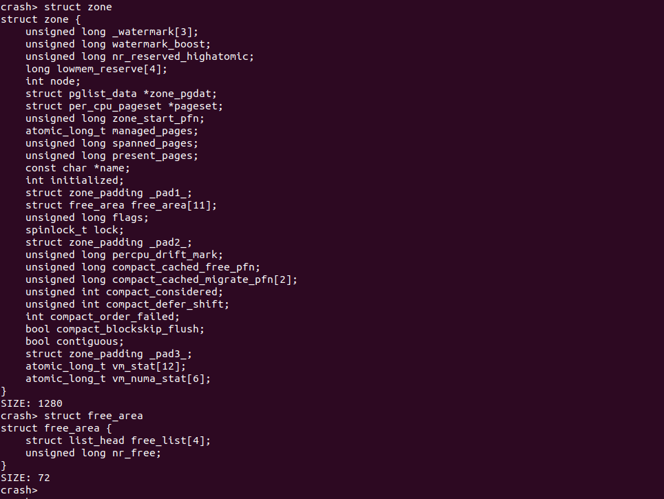 内核将内存划分成不同的 ZONE 进行维护,不同的 ZONE 用于不同的目的。ZONE_DMA 主要给一些老式的设备使用的内存,ZONE_DMA32 主要给内核和一些新的外设使用,ZONE_Normal 则给基础的内核活动使用,ZONE_Highmem 则给用户使用的物理内存,ZONE_Movable 则是可以移动的物理内存。ZONE 通过 struct zone 结构体进行描述,其包含了该 Zone 的内存使用统计信息。CRASH 提供了 “kmem -z” 命令可以用于查看所有 ZONE 的上的统计信息,其个字段含义如下: