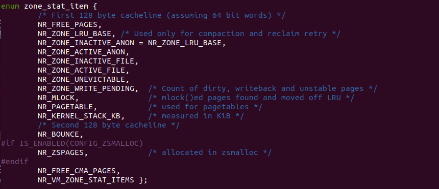 - VM_STAT 字段指明了 Zone 的 vm_state 统计信息