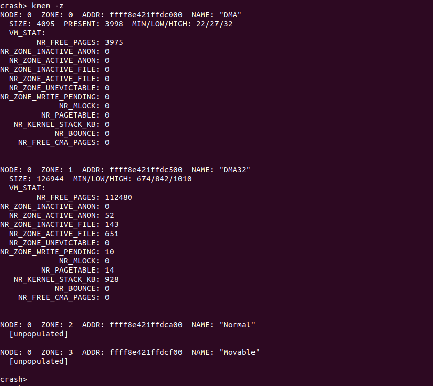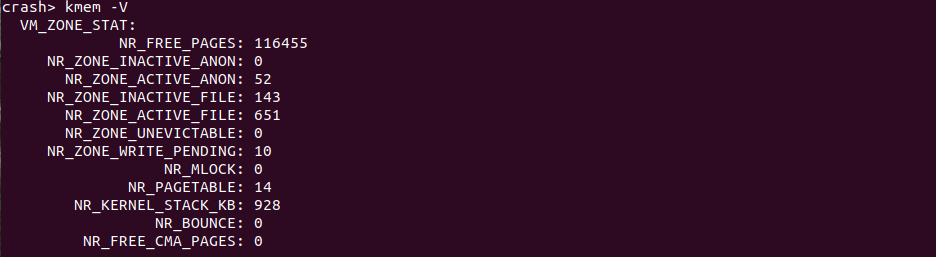 CRASH 提供的 “kmem -V” 命令可以查看内核崩溃时所有 Zone 的 vm_state 统计数据. CRASH 打印的 VM_ZONE_STATE 数据项目正好以 enum zone_state_item 中的项目对应上, 因此可以通过这些数据分析内核崩溃时一些物理页的使用信息.