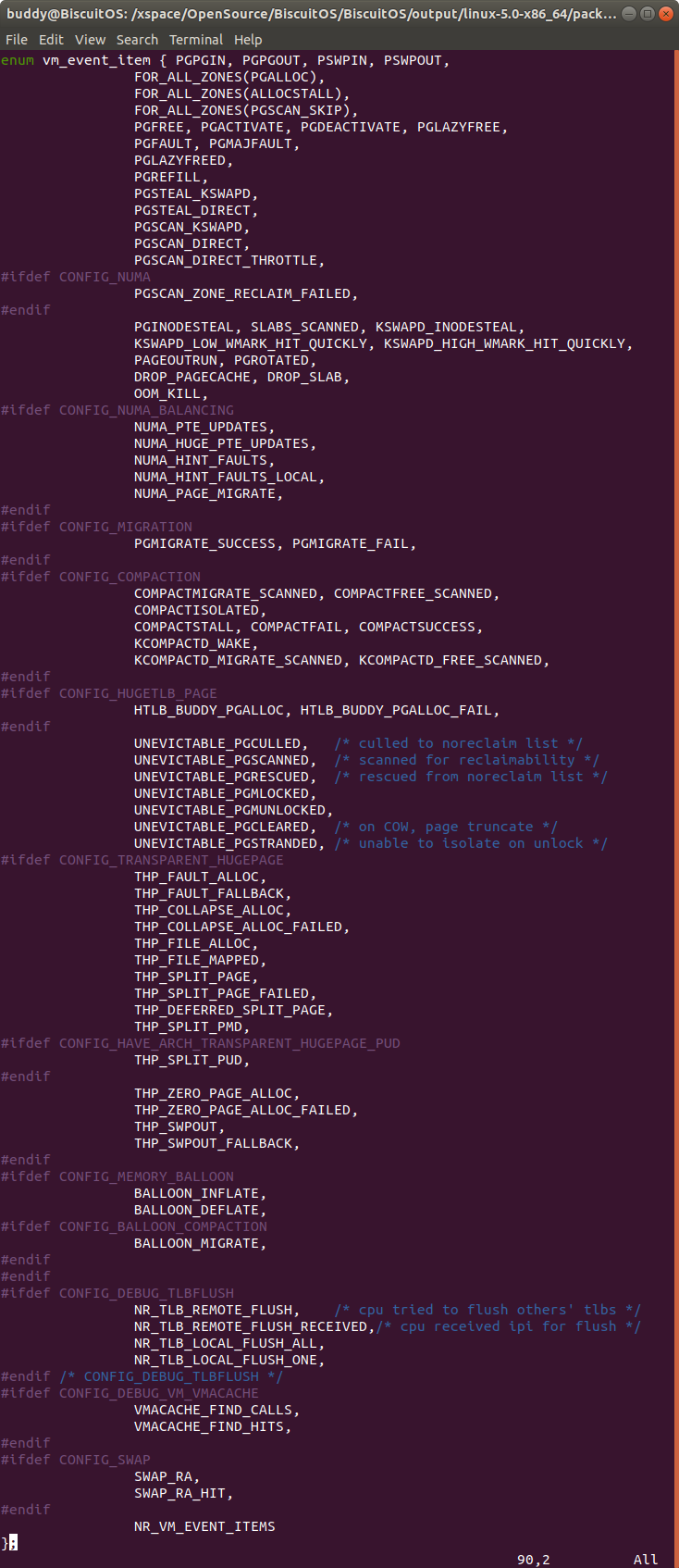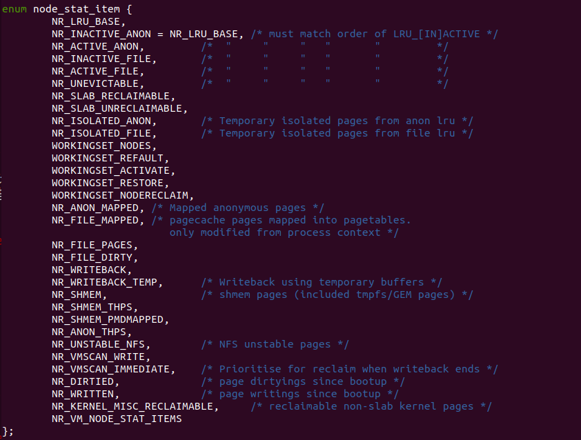 内核使用 vm_event_states 统计所有内存事件,其属于 struct vm_event_state 结构体,其包含了一个长度为 NR_VM_EVENT_ITEMS 的 unsigned long 数组。vm_event_states 维护的事件类型通过 enum vm_event_item 定义: