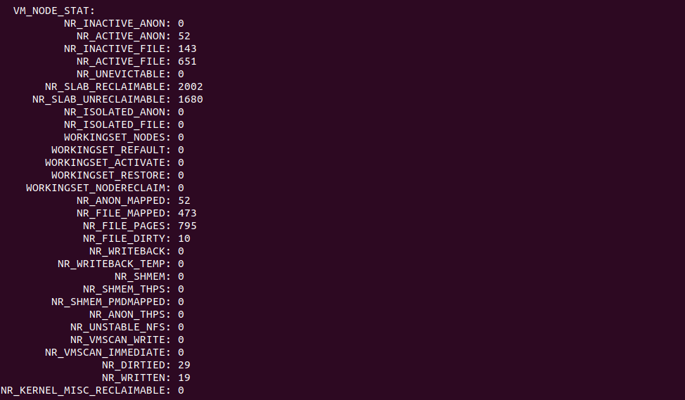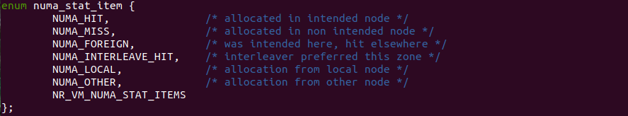 内核将物理内存根据用途划分为不同的 Zone,每个 Zone 通过 struct zone 结构体进行维护,该结构体中包含了 vm_state/vm_numa_state 等用于统计内存使用情况的成员,内核在统计内存使用情况时,其从各个 Zone 的 struct zone 成员中读取数据进行统计。Zone 可能位于一个或多个 NUNA NODE 之上,通常情况下本地 CPU 应从本地 NUMA NODE 上分配物理内存,只有本地物理内存不够用时才从其他 NUMA NODE 上分配物理内存。另外 struct zone 的 vm_numa_state 成员通过 enum numa_state_item 进行描述,其具体成员包括: