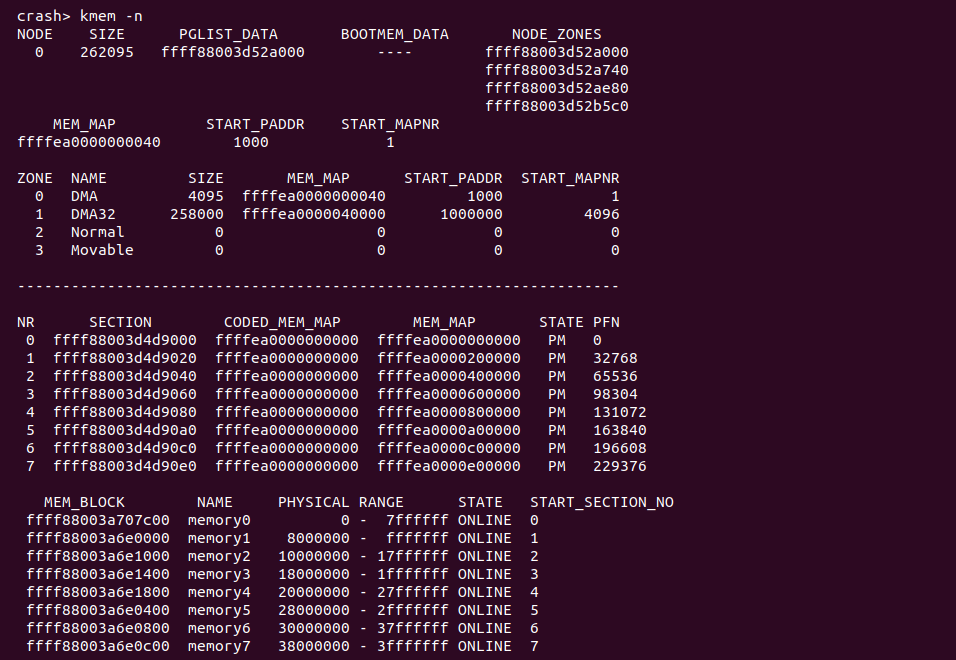 在 struct pglist_data 结构体中包含了 node_zones[] 数组,该数组维护了该 NODE 下 Zone 的信息,内核使用 struct zone 结构体来描述一个 Zone,每个 NODE 能包含的最大 Zone 数量通过 MAX_NR_ZONES 进行指定。在每个 NODE 下包含了多个 ZONE,这些 Zone 可能是 ZONE_DMA/ZONE_DMA32/ZONE_Normal/ZONE_Movable/ZONE_Highmem 等。物理页通过 struct page 结构体进行描述,内核将所有的 struct page 放置在 mem_map[] 数组中。由于在 SPARSE 内存模型中,内核将多个物理页组成一个 memory section,该 memory section 就是物理页的集合,其通过 struct mem_section 结构体进行维护。CRASH 提供了 “kmem -n” 命令就是用于打印内核模型下物理内存信息, 其各字段含义如下: