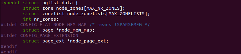 内核支持平坦内存模式和 SPARSE 内存模型,平坦内存模型会将物理内存当做一个整体,并将整体按顺序划分成一块块的物理页,每个物理页都有各自的物理页帧号; SPARSE 内存模型则将物理内存划分成一块一块的 memory section,在每个 memory section 内部再按顺序划分成一块块物理页,每个物理页也有属于自己的物理页帧号。两种模型都有各自的特点,从物理页的角度来看,来自似乎是一致的。但 SPARSE 内存模型多用于 NUMA 架构下,内核使用 struct pglist_data 结构体来描述一个 NUMA NODE,其定义如下:
