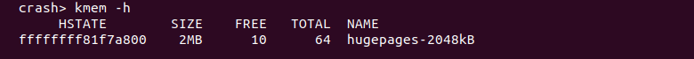CRASH 提供了 “kmem -h” 命令可以查看大页的使用情况,各字段的含义如下: