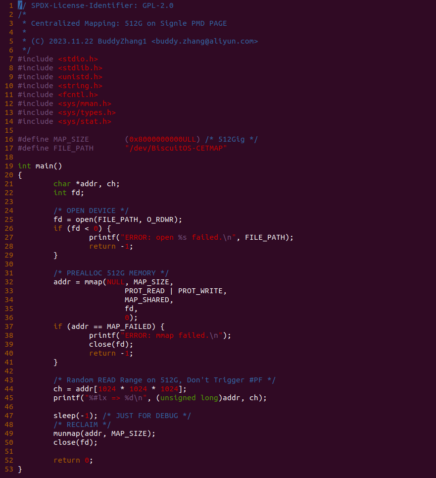 应用程序修改为上图,首先在 16 行定义 MAP_SIZE 宏,其长度为 512G,这里不要漏了 ULL 字符串,不然 MAP_SIZE 会被截断成 0. 然后 MISC 驱动模块会向用户空间提供 “/dev/BiscuitOS-CETMAP” 文件,分配虚拟内存需要通过该文件与 MISC 驱动模块进行交互. 程序接着在 25 行调用 open 函数打开 “/dev/BiscuitOS-CETMAP” 文件,接着调用 mmap 函数,此时分配虚拟内存的长度为 MAP_SIZE, 并且 mmap 使用 fd 标志进行映射,那么此时 MISC 驱动会为应用程序分配虚拟内存. 分配成功之后,程序在 44 行对 512G 访问内的虚拟内存随机访问,此时由于页表已经建立,访问并不会触发缺页异常,接着在 45 行将读到的数据进行打印,看是否为 0。最后程序在 47 行添加了 sleep 无限睡眠,这么做的目的是先把分配功能调通,然后再调试回收功能.
