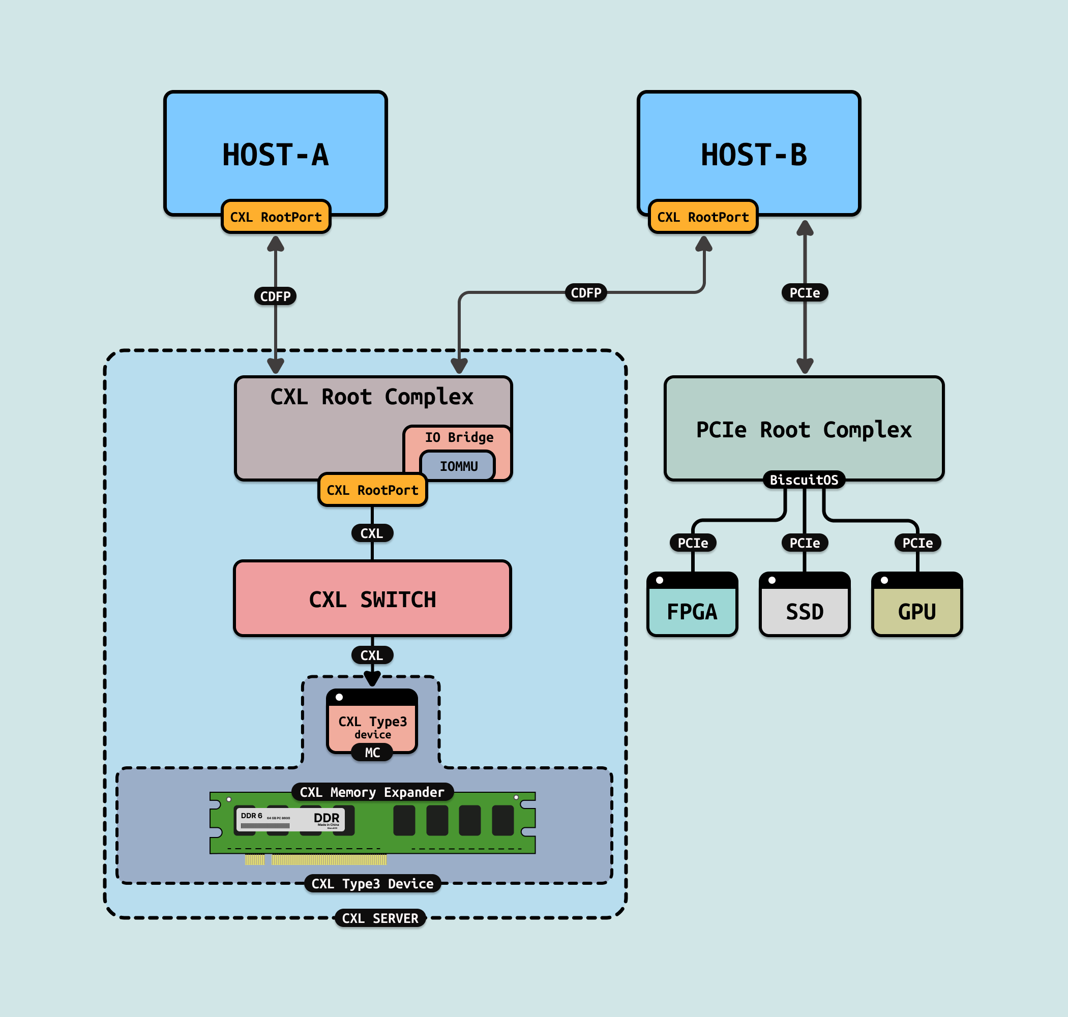 BiscuitOS 目前支持 CXL2.0 SWITCH 的实践,本节用于介绍如何在 BiscuitOS 上实践上图所示的 CXL 拓扑, 项目包含了一台主机,CPU 通过南桥转 CXL Host Bridge,其引入 PCI:0C 总线,直接连接到 CXL Root Complex,CXL RC 里仅包含一个 CXL RootPort,此时 CXL RootPort 的 BDF 为 “0C:00.0”. RP 通过 “BUS-D” 总线连接到 CXL SWITCH 上,SWITCH 只虚拟了一个 VCS,那么 Upstream Port(UP vPPB) 的 BDF 为 “0D:00.0”, VCS 通过 “BUS-E” 总线连接 4 个 Downstream Port(DP vPPB), 每个 DP 都连接到一个 PCIe 插槽上. 实践案例里只有 “BUS-F” 连接的 PCIe 插槽上插入一个 “CXL Type3” 设备,该设备的 BDF 为 “0F:00.0”. 接下来在 BiscuitOS 实践该场景, 参考如下命令: