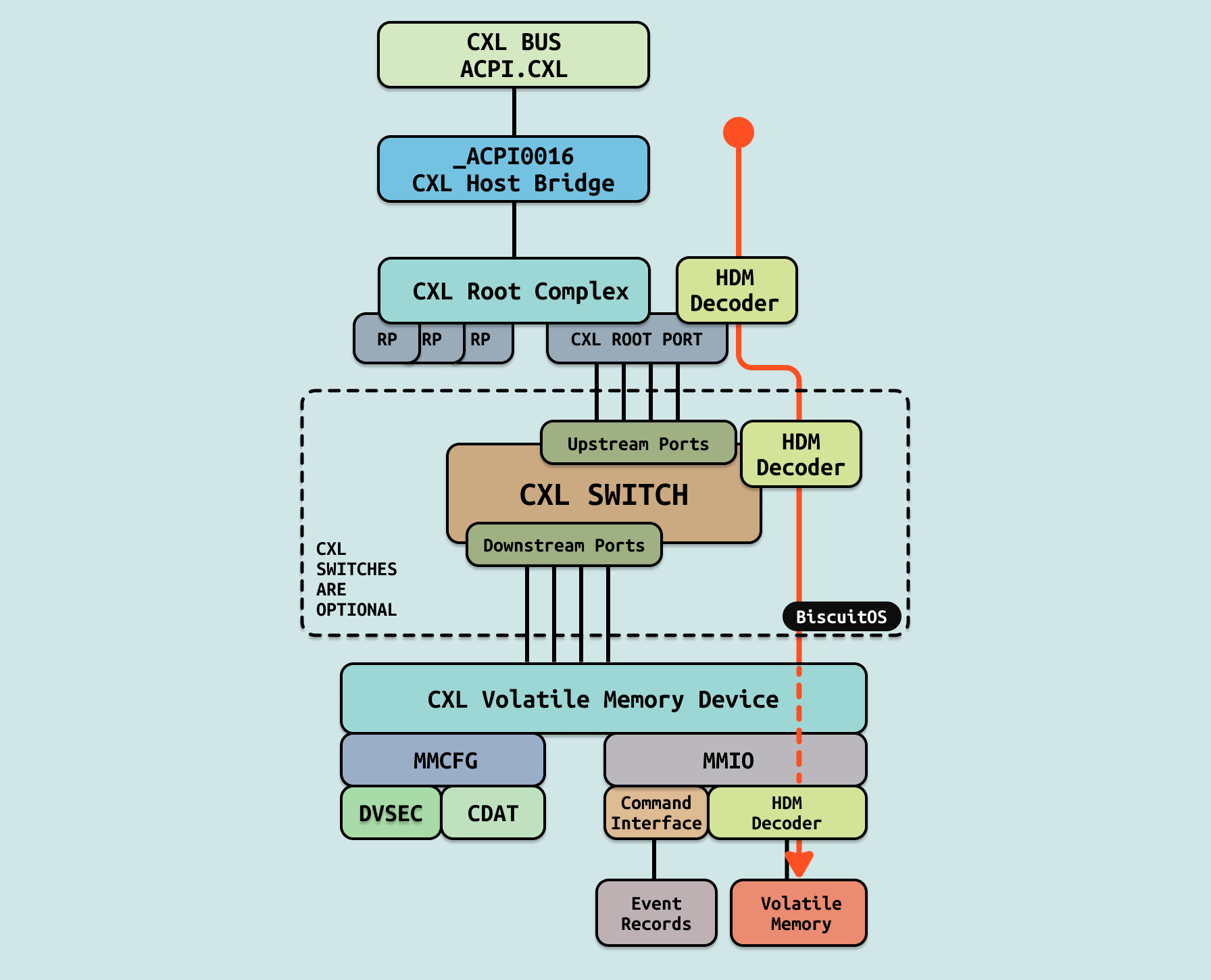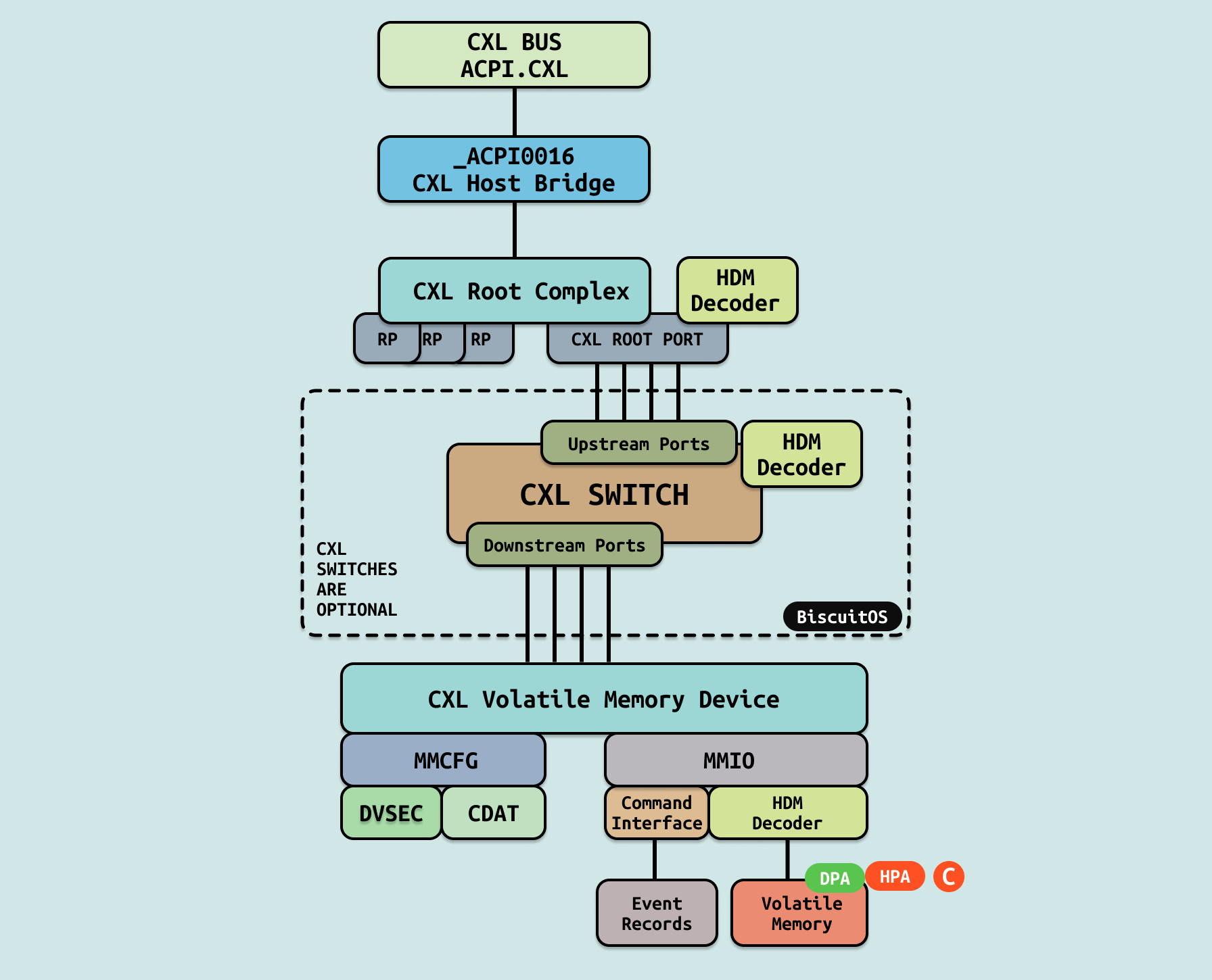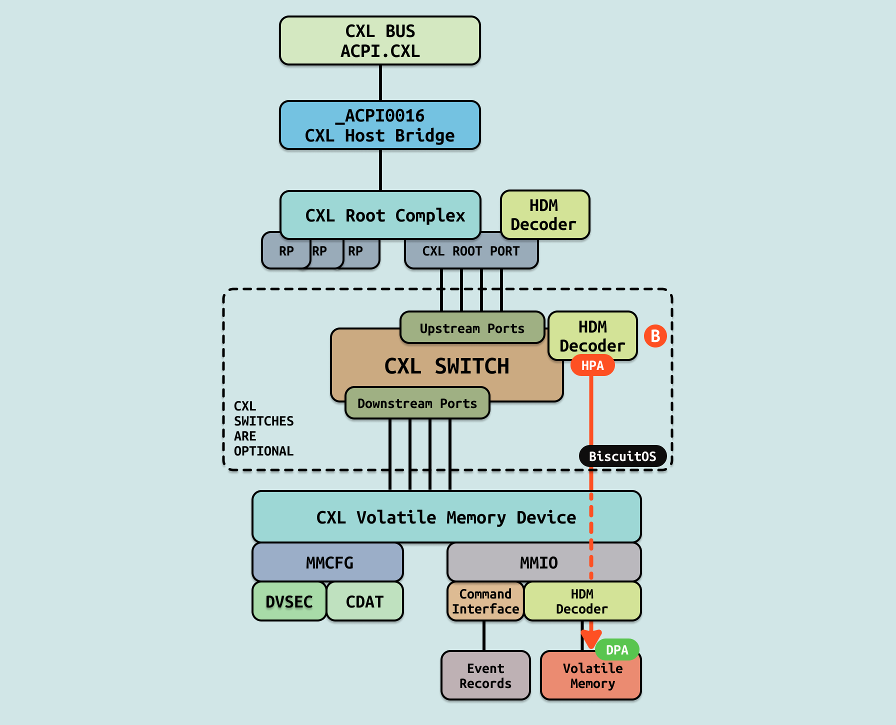 - CXL Root Complex: 平台特定的 CXL 根端口,相当于 PCIe 根复合体。总线编号分配由系统固件负责,并通过 CXL 主桥 ACPI 命名空间设备公开.
