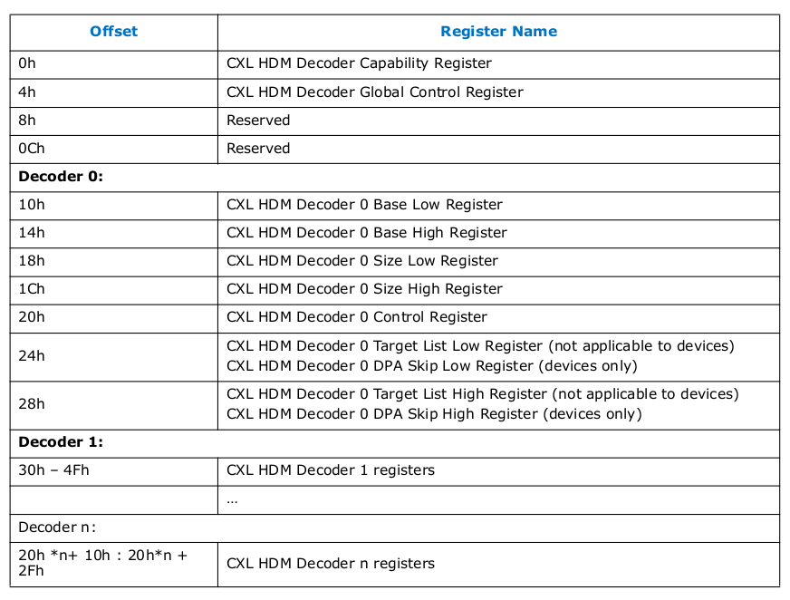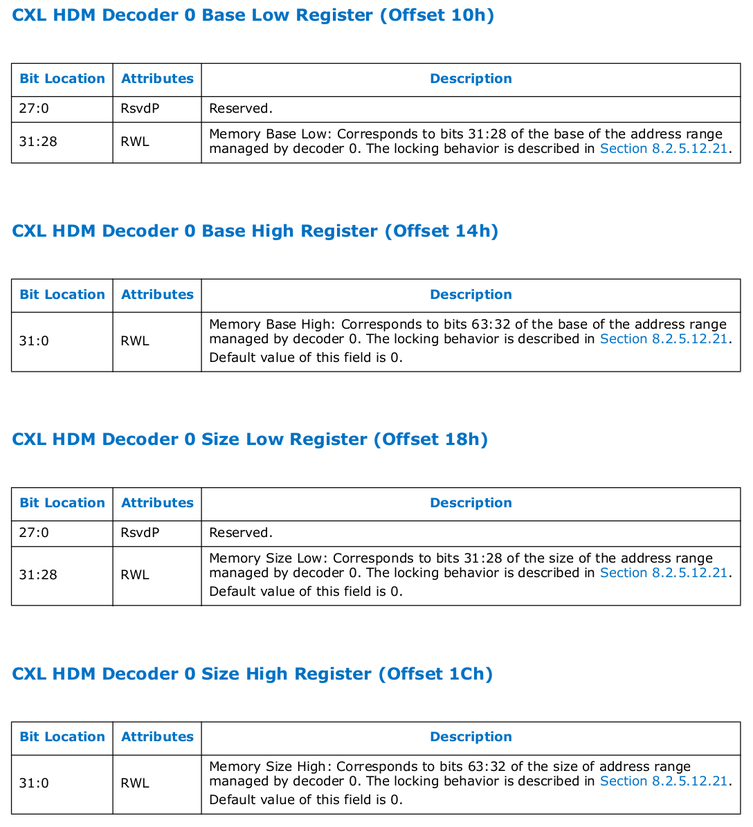 CXL HDM Decoder Capability 包含了 CXL SWITCH 下游端口所有的 HDM Decoder,每个 HDM Decoder 包含基础的 4 个寄存器,分别是 CXL HDM Decoder X Base Low Register、CXL HDM Decoder X Base High Register、CXL HDM Decoder X Size Low Register 和 CXL HDM Decoder X Size High Register. 系统将映射 HPA 区域的值填入该区域之后,也就代表该 HDM Decoder 用于解码这段 HPA 区域.