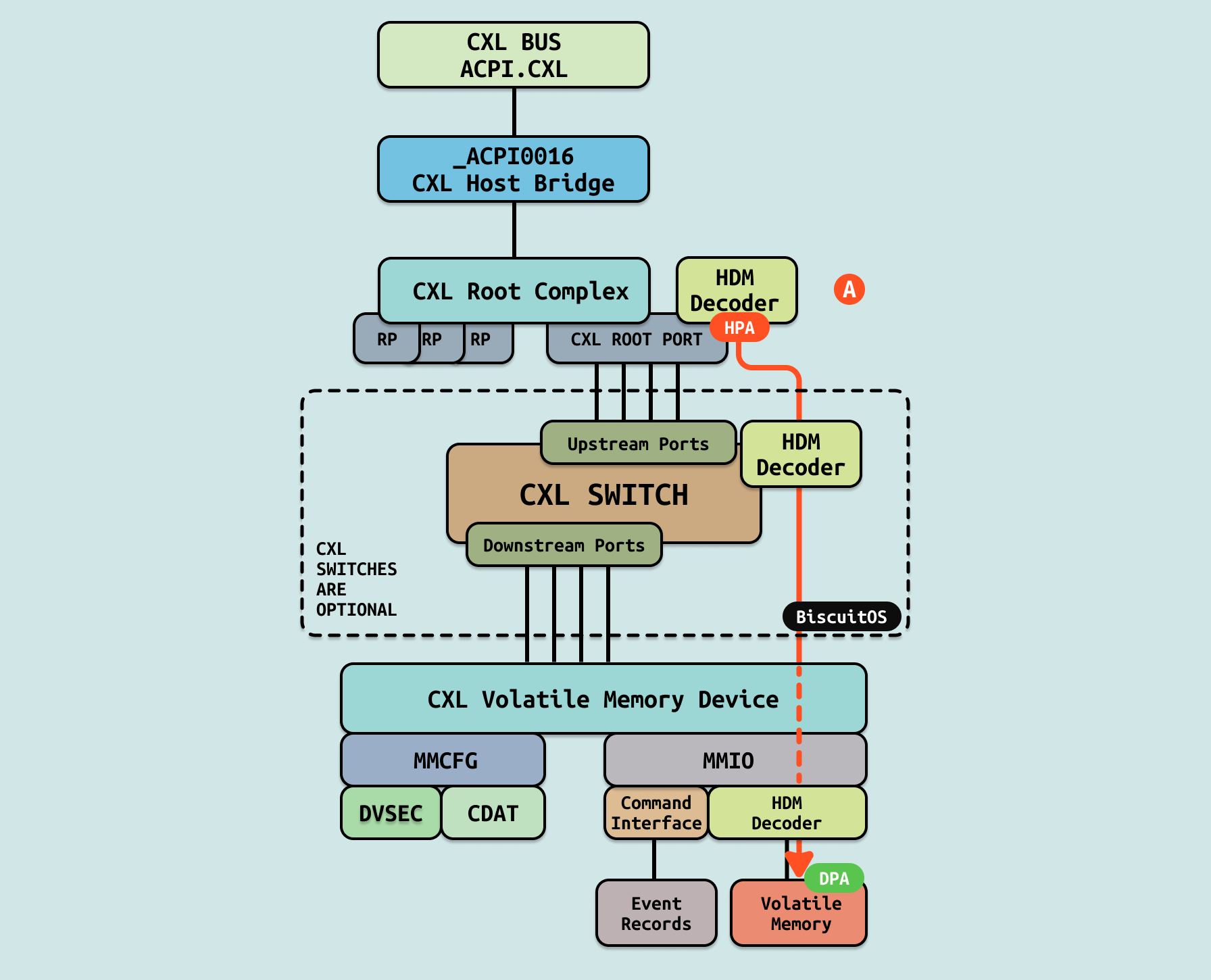 - CXL Switch: 提供 CXL 根端口扩展到多个下行交换机端口,允许更多的 CXL 内存设备以可扩展的方式连接。每个交换机有一组 HDM 解码器,负责上游交换机端口的 HPA 解码。系统固件、UEFI 和操作系统负责编程这些 HDM 解码器,以涵盖所有连接的下游设备和交换机