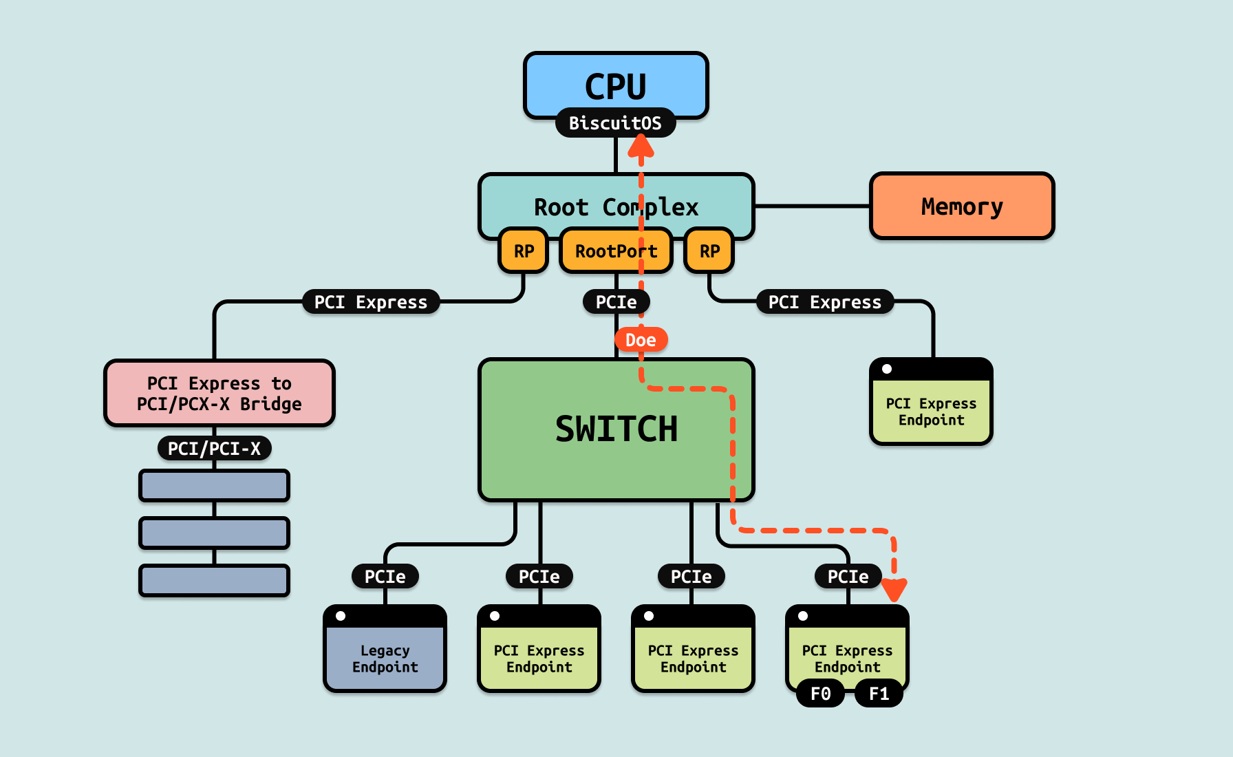 CDAT 寄存器并不位于 CXL SWITCH 上游端口或下游端口的 PCIe Configuration Space,也不为位于 BAR 空间,而是位于 CXL SWITCH 内部. 为了从 CXL SWITCH 内部读取 CDAT,需要使用 PCIe Doe 通信机制,以此从 CXL SWITCH 中获得 CDAT 信息. 接下来通过一个实践案例介绍如何访问 CXL SWITH 的 CDAT,其在 BiscuitOS 上的部署逻辑如下: