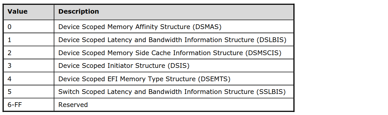 - Device Scoped Memory Affinity Structure(DSMAS): 描述设备与内存之间的亲和性关系, 具体包括: 设备与内存的 NUMA(Non-Uniform Memory Access)域信息, 设备访问特定内存区域的亲和性(例如某些设备可能更倾向于访问特定的内存区域). 在异构系统中,操作系统可以根据 DSMAS 的信息优化内存分配,确保设备访问与其亲和性最高的内存区域,从而减少访问延迟.