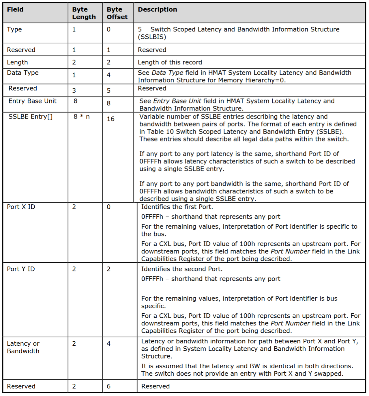 - Switch Scoped Latency and Bandwidth Information Structure(SSLBIS): 描述交换机(Switch)的延迟和带宽信息, 具体包括: 交换机连接设备之间的延迟和带宽信息, 这些信息可以帮助系统软件了解交换机连接的设备之间的性能特征. 操作系统可以根据 SSLBIS 的信息优化数据在交换机连接的设备之间的传输路径,选择延迟最低或带宽最高的路径, 例如在 CXL Switch 中,操作系统可以根据 SSLBIS 的信息将数据访问请求分配到性能最优的设备上.