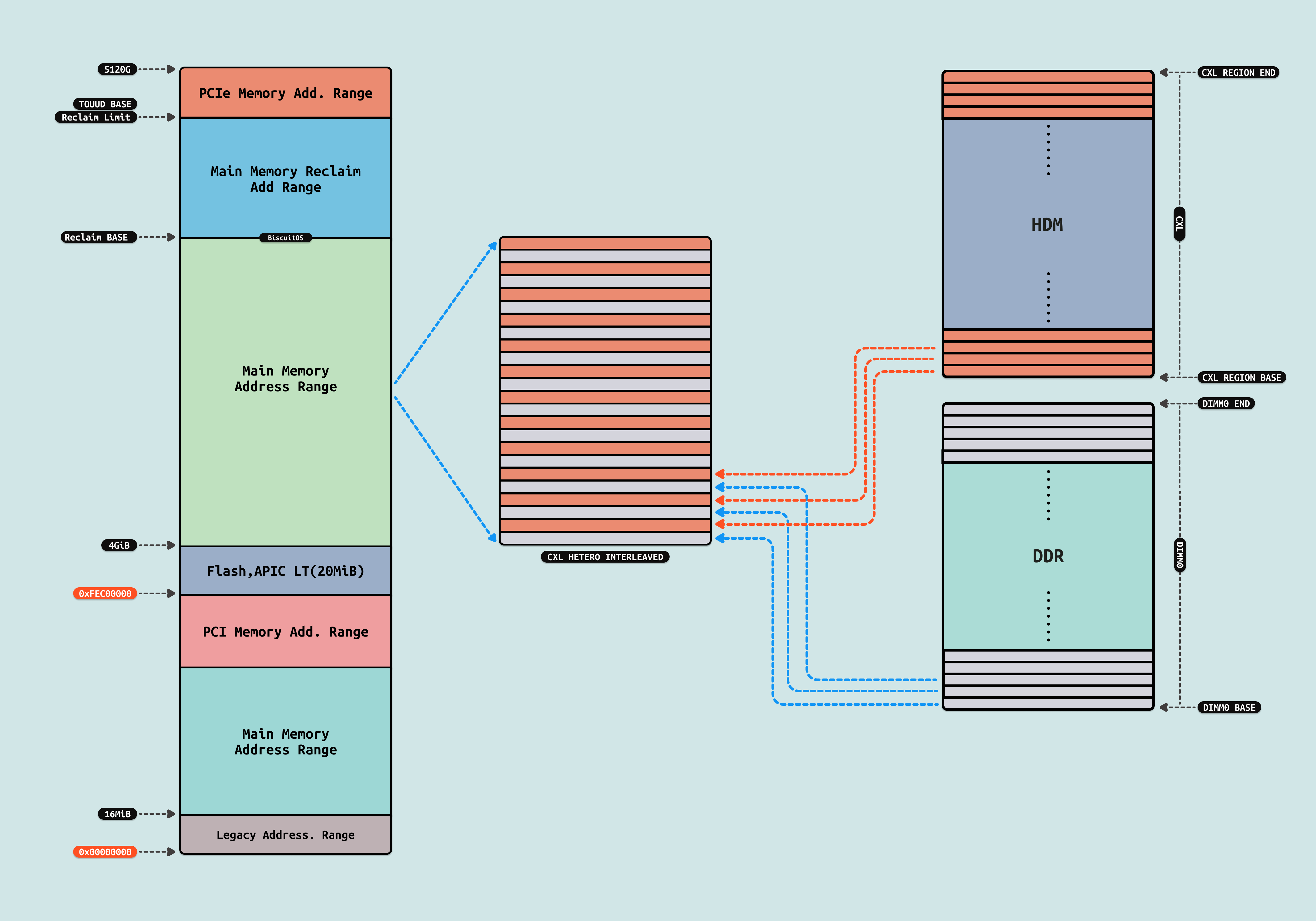 HETERO INTERLEAVING MODE: 通过硬件实现内存地址的交织(interleaving),将本地 DRAM 和 CXL 内存的地址空间混合在一起,从而优化内存访问的并行性和带宽利用率. 内存地址的交织由硬件(如内存控制器)自动完成,无需软件干预. 通过将内存地址均匀分布在本地 DRAM 和 CXL 内存中,可以提高内存访问的并行性,从而提升整体性能. 硬件将本地 DRAM 和 CXL 内存的地址空间混合在一起,形成一个统一的内存地址空间. 通过交织,内存访问请求被均匀分布到本地 DRAM 和 CXL 内存中,避免了单一内存资源的瓶颈. Hetero Interleaved 模式仅在配备 P-cores 的 Xeon 6 6900/6700 系列处理器上支持,而在配备 E-cores 的型号上不支持. Hetero Interleaved 模式的优势: