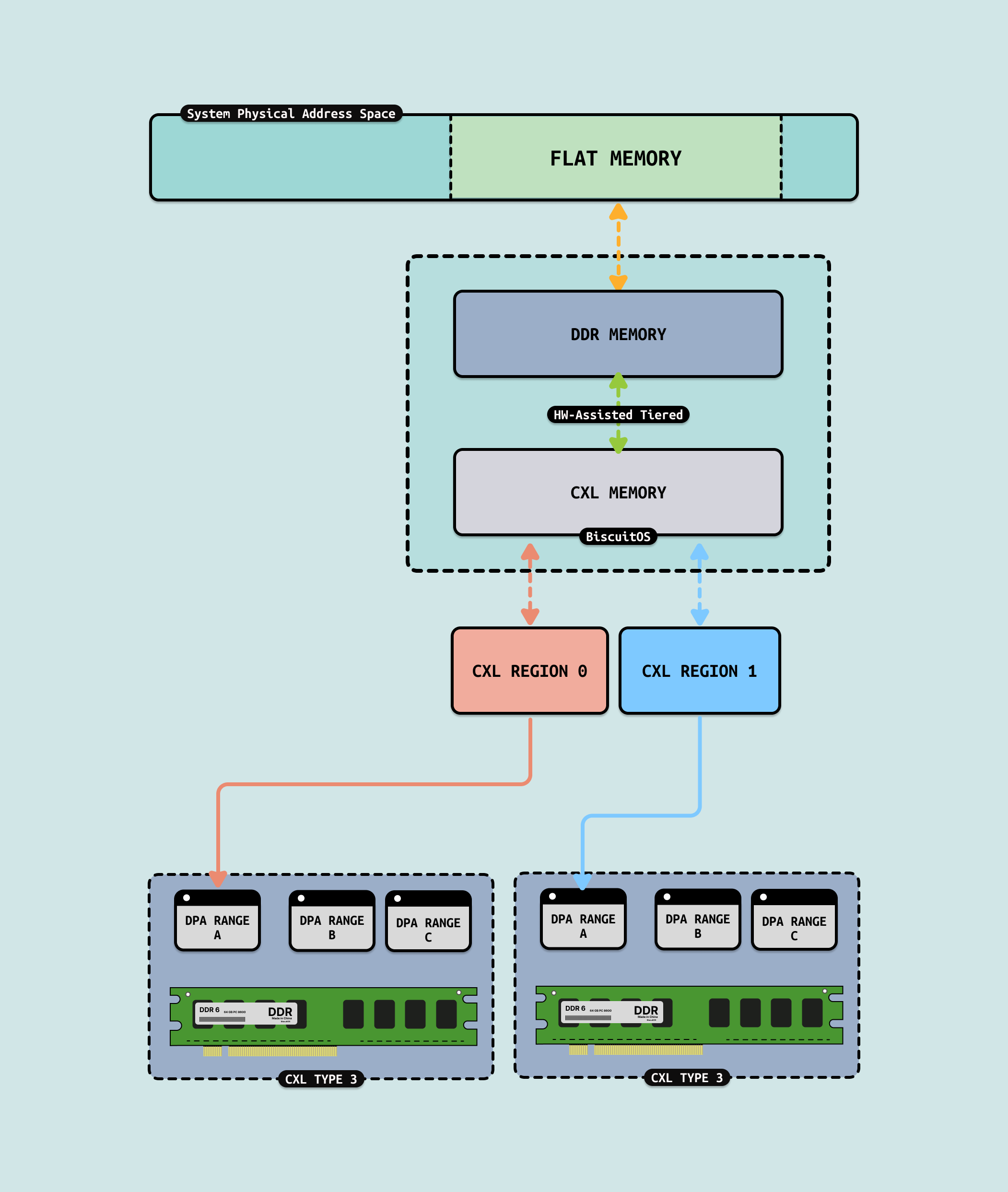 FLAT MODE: 通过硬件辅助的方式,将本地 DDR 内存和 CXL 内存 统一管理,形成一个单一的内存区域. FLAT 模式通过硬件(如内存控制器)自动管理内存的分层,将热数据(频繁访问的数据)放置在性能更高的本地 DDR 内存中,而将冷数据(较少访问的数据)放置在性能稍低的 CXL 内存中. 与操作系统软件的 Tiered Memory 机制相比,操作系统和应用程序无需感知内存的分层管理,硬件会自动完成数据的迁移和优化,这意味着开发者无需修改代码或调整系统配置,即可享受内存分层的性能优势. FLAT 模式将本地 DDR 内存和 CXL 内存视为一个连续的内存地址空间. 操作系统和应用程序看到的是一个单一的内存池,而不需要区分本地内存和远程内存, 这种设计简化了内存的管理和分配,减少了软件层面的复杂性. FLAT 模式支持本地 DDR 内存和 CXL 内存以 1:1 的比例配置,例如如果系统有 512GB 的本地 DDR 内存,那么可以扩展 512GB 的 CXL 内存,形成一个总计 1TB 的统一内存池. FLAT 模式的优势: