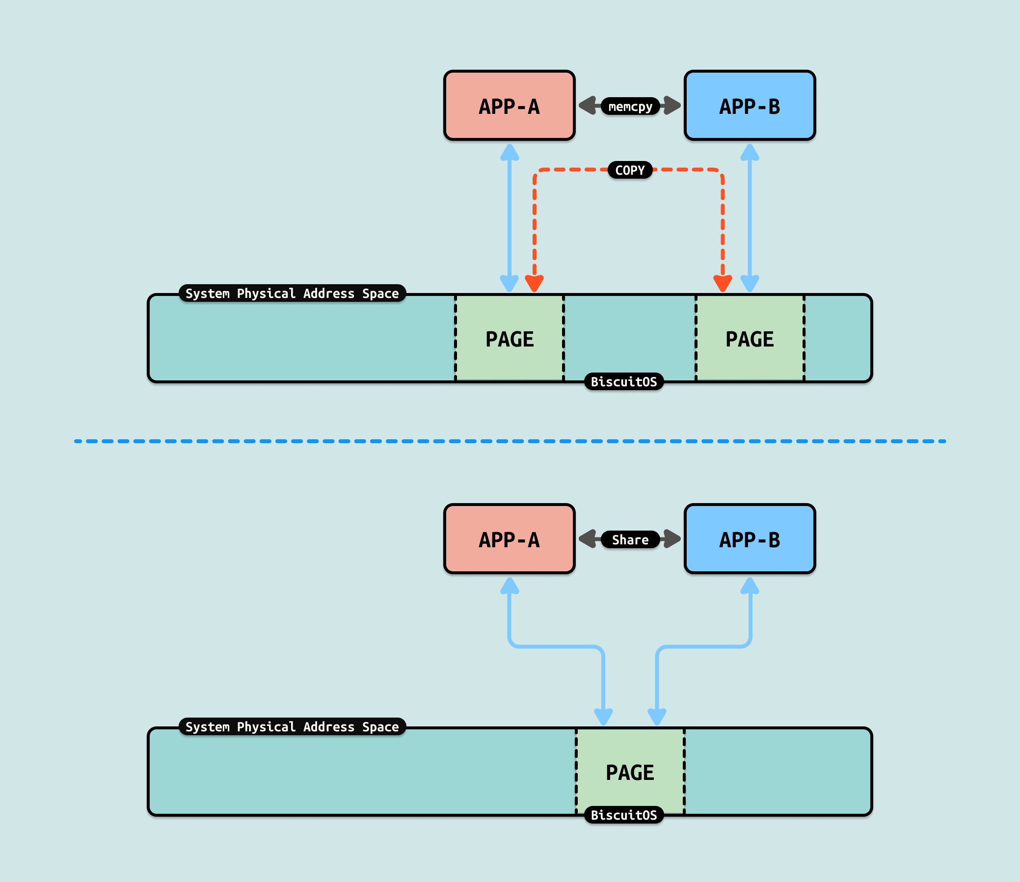 在 CXL Pool 方案中,CXL 集群可以构建一个共享(Shring)的内存池子. 主机之间可以将同一块 CXL 内存映射到其物理地址空间,然后在物理内存级别的共享,也就是一台物理主机修改了这部分内存,那么其他主机将同时看到修改的内容. 那么接下来通过一个实践案例展示 CXL ZEROCOPY 的优势之处,实践案例在 BiscuitOS 上的部署逻辑如下: