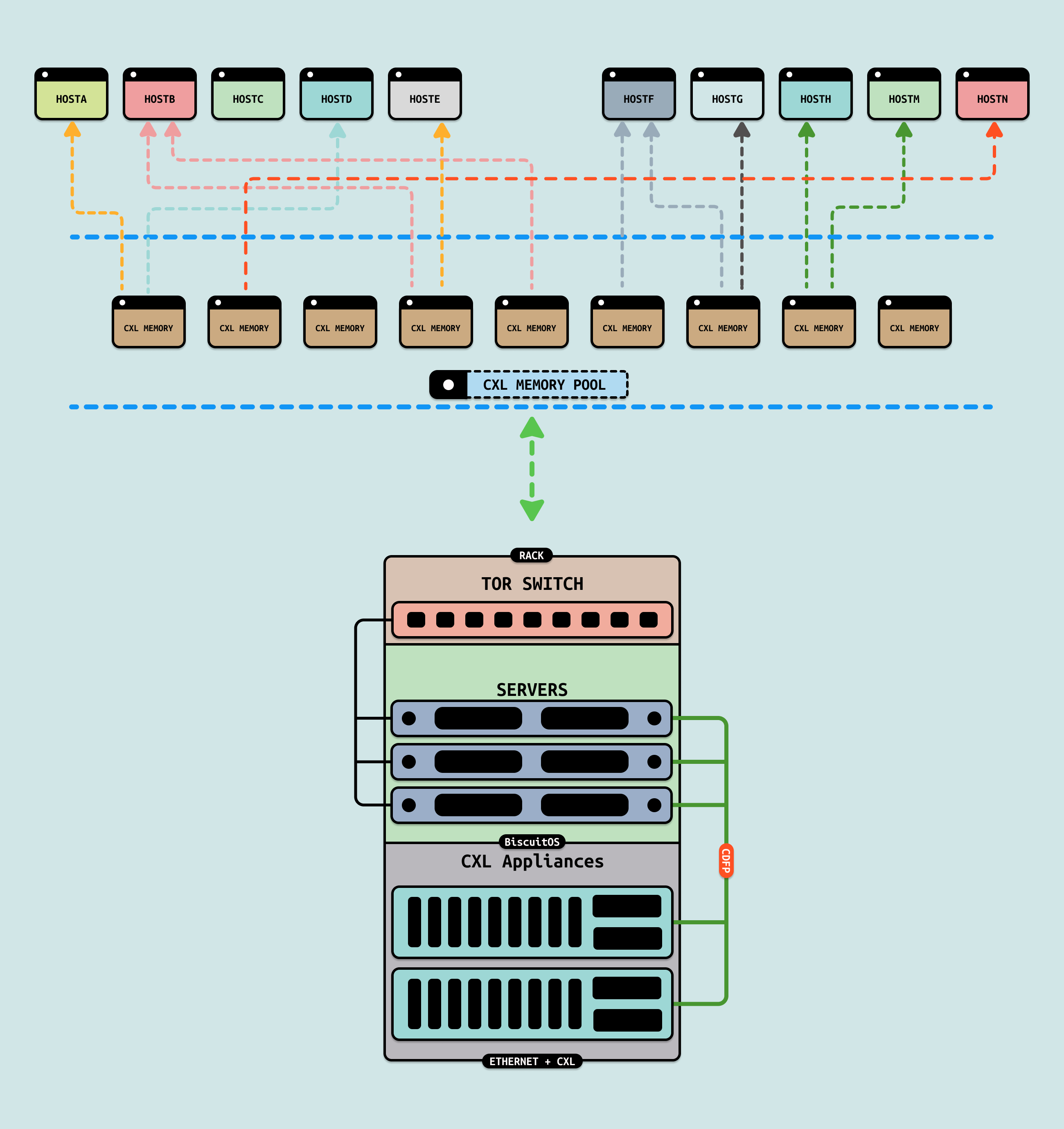 ZEROCPY 是一种皆在减少内存拷贝的技术,其可以是进程内部减少拷贝,也可以是进程间的拷贝,例如在上图中,两个用户进程之间各自映射不同的物理页,当两个进程之间拷贝数据本质是在两个物理页之间拷贝数据. 当两个进程同时映射到一个物理页,那么两个进程之间无需拷贝便可以相互访问数据,因此可以看到 ZEROCOPY 在性能提升上是首选优化点. 在 CXL 池化加持下,ZEROCOPY 已经跨越主机与主机之间的隔阂.