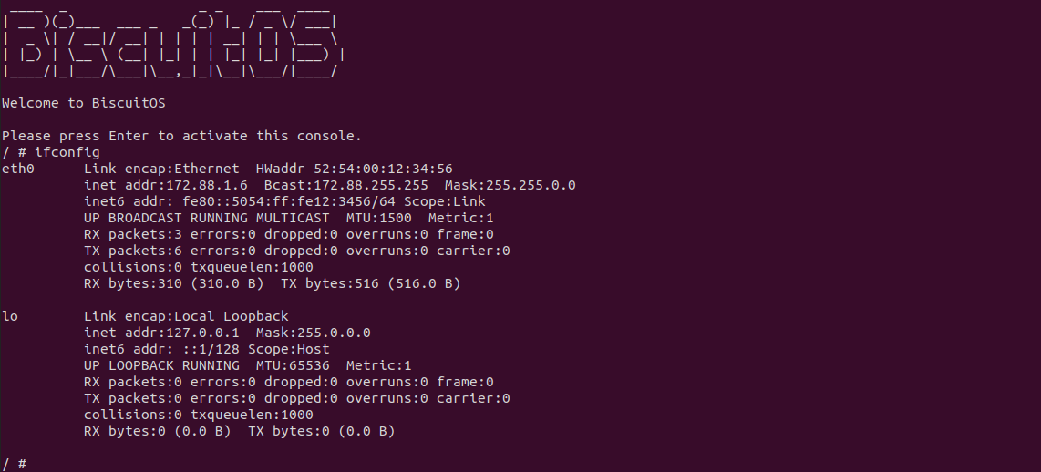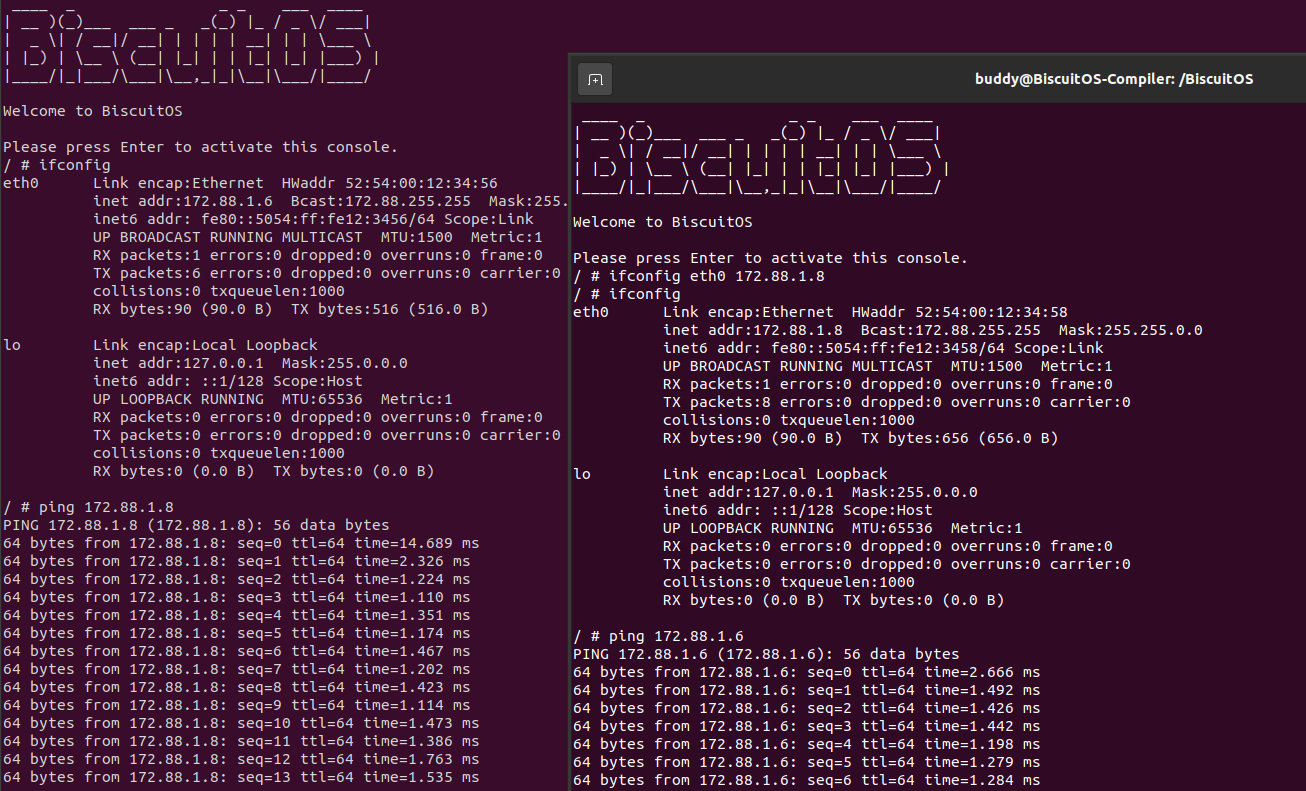 当第一台 BiscuitOS 启动之后,先查看其 IP 地址,此时 IP 地址为 “172.88.1.6”, 接下来启动第二台 BiscuitOS,先测试两台机器之间通过网络先拷贝数据,参考如下命令: