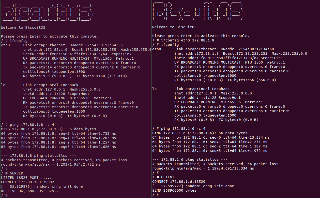 可以看到两台 BiscuitOS 之间的网络是通的,接下来一台作为服务器运行 SERVER 程序,另外一台作为客户端运行 CLIENT 程序,那么两台 BiscuitOS 之间将通过网络传递数据, 测试程序基于 TCP 进行数据传输, 可以自行查看源代码: