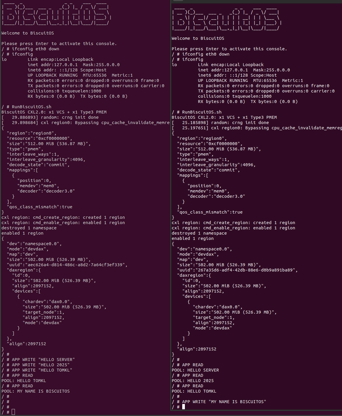 此时在两台物理主机上同时挂载同一块 CXL 内存,并运行 APP 程序对 CXL 内存进行读写操作,可以看到 SERVER 对 CXL 内存写数据,CLIENT 立马看到写入的数据,其无需耗费大量的时间去拷贝数据,而是直接消费数据,这样大大提供了业务的性能. 以上便是 CXL 内存池化实现的主机之间的 ZEROCOPY.
