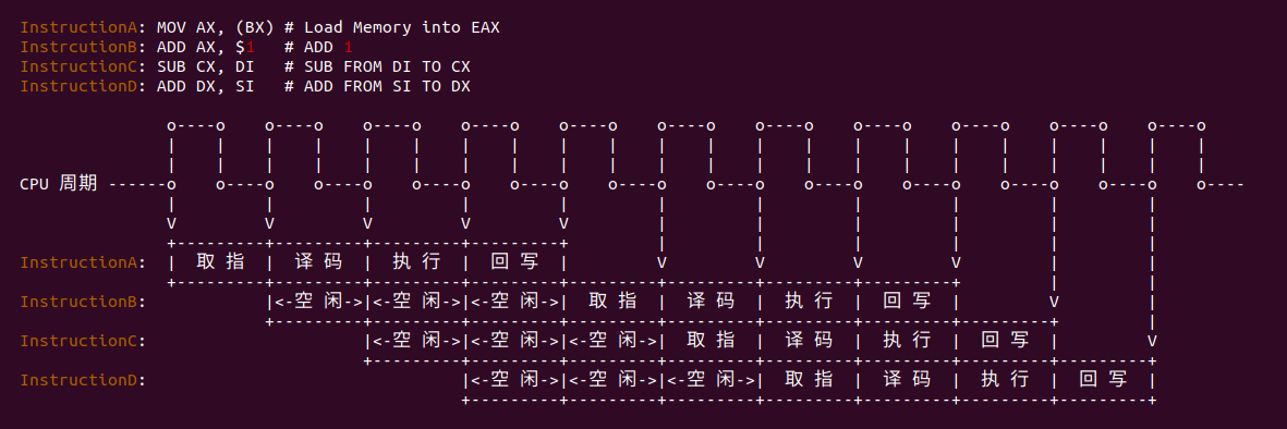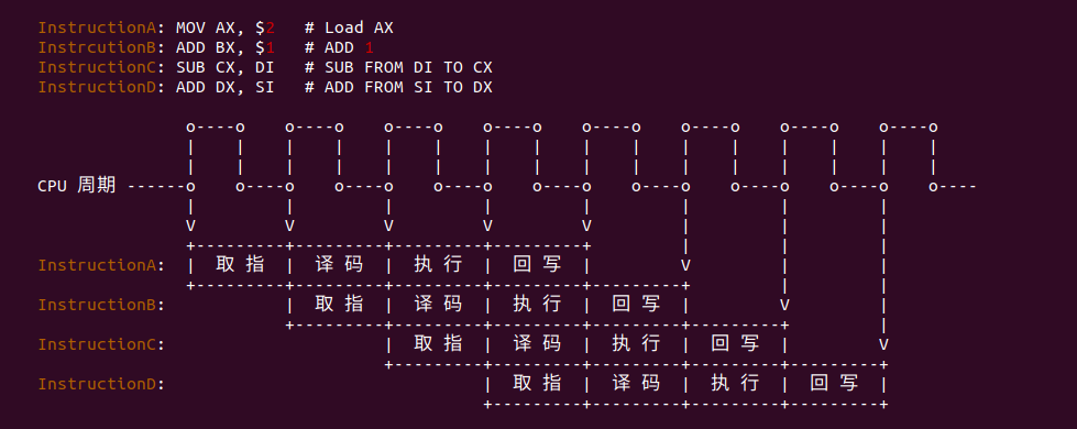 这四个阶段分别由 4 个独立物理执行单元来完成,在这种情况下,如果指令之间没有依赖关系,后一条指令并不需要等到前一条指令完成执行再开始执行,而是前一条指令完成取指之后,后一条指令边可以开始执行取指操作.